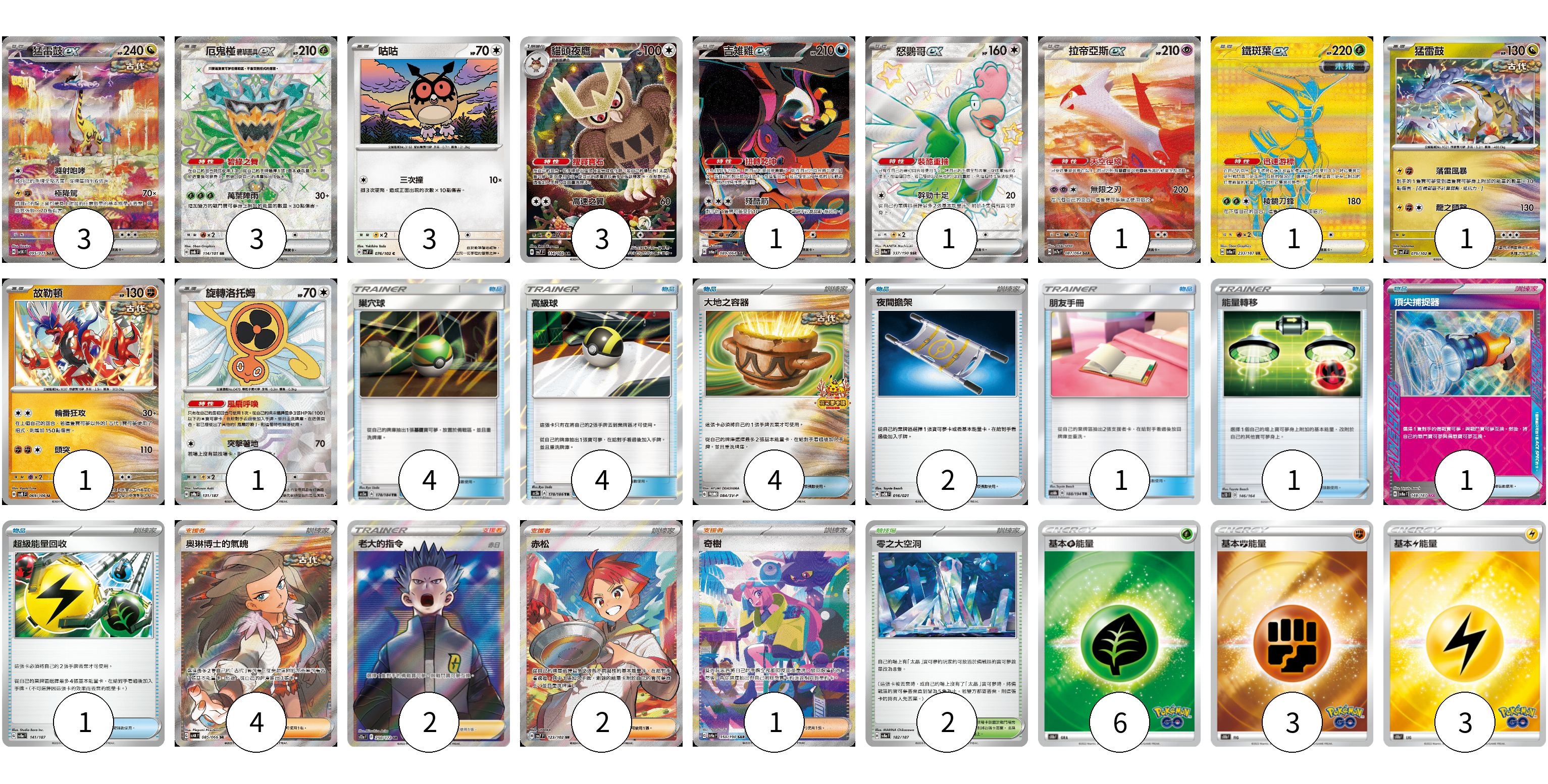 牌組構築方案 以此牌組為基礎新構築牌組 顯示卡面 顯示列表 寶可夢卡(19) 3 3 3 3 1 1 1 1 1 1 1 物品卡(18) 4 4 4 2 1 1 1 1 支援者卡(9) 4 2 2 1 競技場卡(2) 2 能量卡(12) 6 3 3 寶可夢卡(19) 卡牌名稱 張數 卡牌名稱 張數 猛雷鼓ex SV5K 095/071 03 厄鬼椪 碧草面具ex SV6 114/101 03 咕咕 SV7 076/102 03 貓頭夜鷹 SV7 114/102 03 吉雉雞ex SV6a 089/064 01 怒鸚哥ex SV4a 337/190 01 拉帝亞斯ex SV7a 087/064 01 鐵斑葉ex SV8a 233/187 01 猛雷鼓 SV7 075/102 01 故勒頓 SV8 069/106 01 旋轉洛托姆 SV8a 131/187 01 物品卡(18) 卡牌名稱 張數 卡牌名稱 張數 巢穴球 AS5a 178/184 04 高級球 AS5b 178/186 04 大地之容器 SV-P 084/SV-P 04 夜間擔架 SVOM 016/021 02 朋友手冊 AS6b 188/194 01 能量轉移 SC1D 146/164 01 頂尖捕捉器 SV8a 148/187 01 超級能量回收 SV8a 141/187 01 支援者卡(9) 卡牌名稱 張數 卡牌名稱 張數 奧琳博士的氣魄 SV4K 085/066 04 老大的指令(赤日) S12a 250/172 02 赤松 SV7 123/102 02 奇樹 SV4a 350/190 01 競技場卡(2) 卡牌名稱 張數 卡牌名稱 張數 零之大空洞 SV8a 182/187 02 能量卡(12) 卡牌名稱 張數 卡牌名稱 張數 基本草能量 S10b GRA 06 基本鬥能量 S10b FIG 03 基本雷能量 S10b LIG 03 以此牌組為基礎新構築牌組 牌組編碼 mroVgK-GsNVsm-ZyqkbP copy 列印牌組單 牌組編碼已複製 分享至SNS