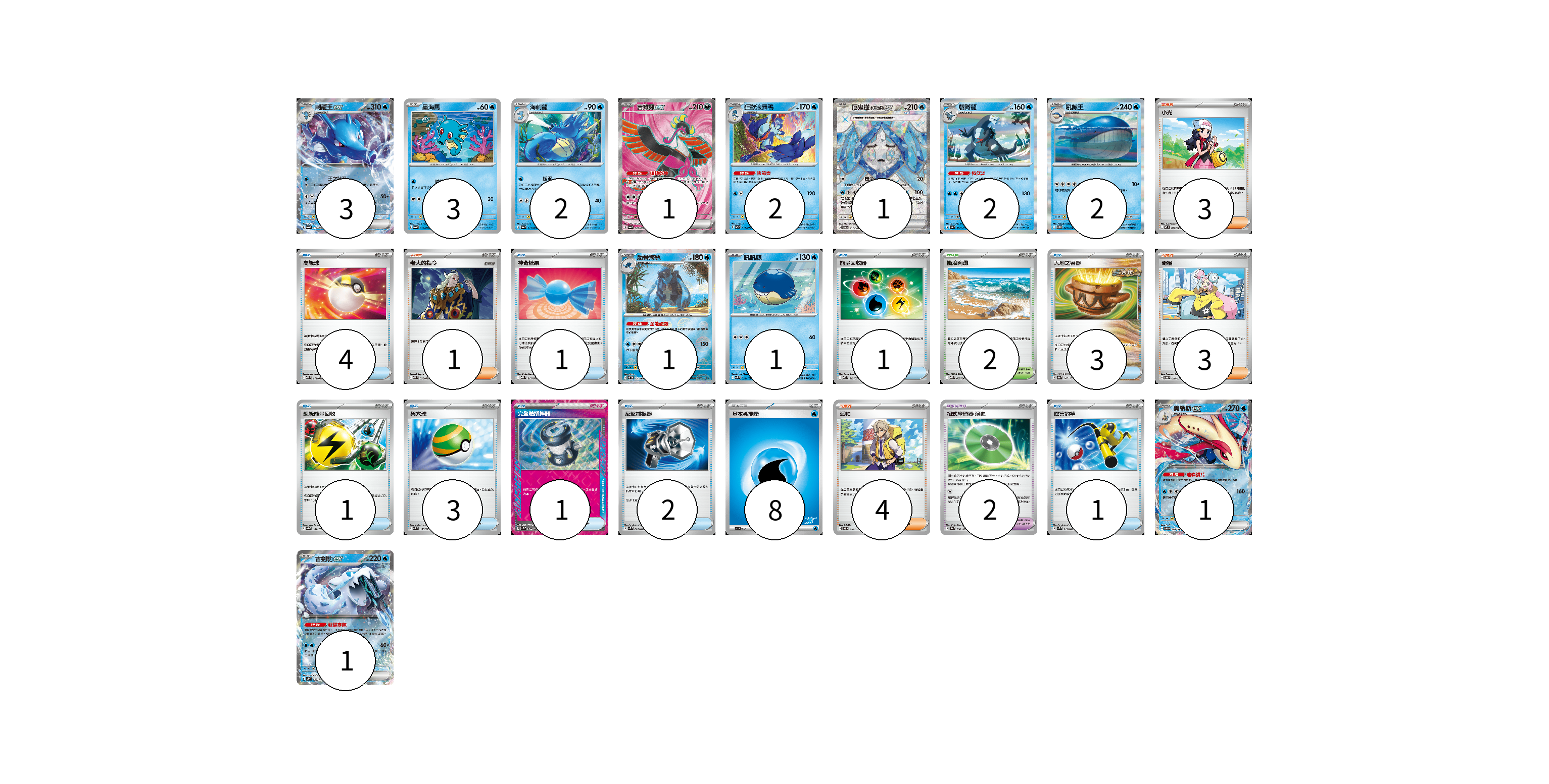 牌組構築方案 以此牌組為基礎新構築牌組 顯示卡面 顯示列表 寶可夢卡(20) 3 3 2 1 2 1 2 2 1 1 1 1 寶可夢道具(2) 2 物品卡(17) 4 1 1 3 1 3 1 2 1 支援者卡(11) 3 1 3 4 競技場卡(2) 2 能量卡(8) 8 寶可夢卡(20) 卡牌名稱 張數 卡牌名稱 張數 刺龍王ex SV6a 012/064 03 墨海馬 SV6a 010/064 03 海刺龍 SV6a 011/064 02 吉雉雞ex SV6a 081/064 01 狂歡浪舞鴨 SV7a 015/064 02 厄鬼椪 水井面具ex SV6 117/101 01 戟脊龍 SV4a 053/190 02 吼鯨王 SV9 025/100 02 肋骨海龜 SV11B 026/086 01 吼吼鯨 SV9 024/100 01 美納斯ex SV8 026/106 01 古劍豹ex SV2P 028/071 01 寶可夢道具(2) 卡牌名稱 張數 卡牌名稱 張數 招式學習器 演進 SV8a 160/187 02 物品卡(17) 卡牌名稱 張數 卡牌名稱 張數 高級球 MBD 014/022 04 神奇糖果 MBG 013/022 01 能量回收器 MBD 012/022 01 大地之容器 SV8a 143/187 03 超級能量回收 SV8a 141/187 01 巢穴球 SVM 133/175 03 完全體攪拌器 SVK 017/042 01 反擊捕捉器 SVK 009/042 02 厲害釣竿 SVK 011/042 01 支援者卡(11) 卡牌名稱 張數 卡牌名稱 張數 小光 M2 077/080 03 老大的指令 MBD 020/022 01 奇樹 SVOD 016/020 03 派帕 SVOD 018/020 04 競技場卡(2) 卡牌名稱 張數 卡牌名稱 張數 衝浪海灘 M1S 062/063 02 能量卡(8) 卡牌名稱 張數 卡牌名稱 張數 基本【水】能量 SVI WAT 08 以此牌組為基礎新構築牌組 牌組編碼 mugISv-unINzT-oXhYuv copy 列印牌組單 牌組編碼已複製 分享至SNS