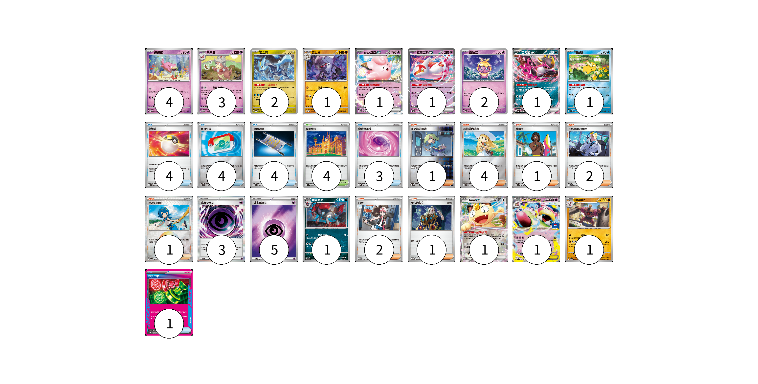 牌組構築方案 以此牌組為基礎新構築牌組 顯示卡面 顯示列表 寶可夢卡(20) 4 3 2 1 1 1 2 1 1 1 1 1 1 物品卡(16) 4 4 4 3 1 支援者卡(12) 1 4 1 2 1 2 1 競技場卡(4) 4 能量卡(8) 3 5 寶可夢卡(20) 卡牌名稱 張數 卡牌名稱 張數 呆呆獸 SV7 038/102 04 呆呆王 SV7 039/102 03 酋雷姆 SV6a 047/064 02 棄世猴 SV8 062/106 01 <莉莉艾的>皮皮ex MC 287/742 01 拉帝亞斯ex MC 312/742 01 迷唇娃 SV7a 018/064 02 吉雉雞ex SV8a 104/187 01 可達鴨 M2a 032/193 01 索羅亞克 MC 468/742 01 喵喵ex M3 061/080 01 超級呆殼獸ex M-P 077/M-P 01 修建老匠 SV6 061/101 01 物品卡(16) 卡牌名稱 張數 卡牌名稱 張數 高級球 MC 651/742 04 寶可平板 MC 662/742 04 夜間擔架 M2a 159/193 04 奇跡修正檔 MBD 017/022 03 不公印章 MC 633/742 01 支援者卡(12) 卡牌名稱 張數 卡牌名稱 張數 暗碼迷的解讀 MC 698/742 01 莉莉艾的決意 MC 729/742 04 衝浪手 M2a 171/193 01 阿克羅瑪的執著 SVOM 017/021 02 水蓮的照顧 SV8a 168/187 01 鬥子 MC 718/742 02 老大的指令 MBD 020/022 01 競技場卡(4) 卡牌名稱 張數 卡牌名稱 張數 夜間學院 SV6a 064/064 04 能量卡(8) 卡牌名稱 張數 卡牌名稱 張數 感應【超】能量 M3 079/080 03 基本【超】能量 MC PSY 05 以此牌組為基礎新構築牌組 牌組編碼 mvZeDK-QwqTok-OOHigC copy 列印牌組單 牌組編碼已複製 分享至SNS
