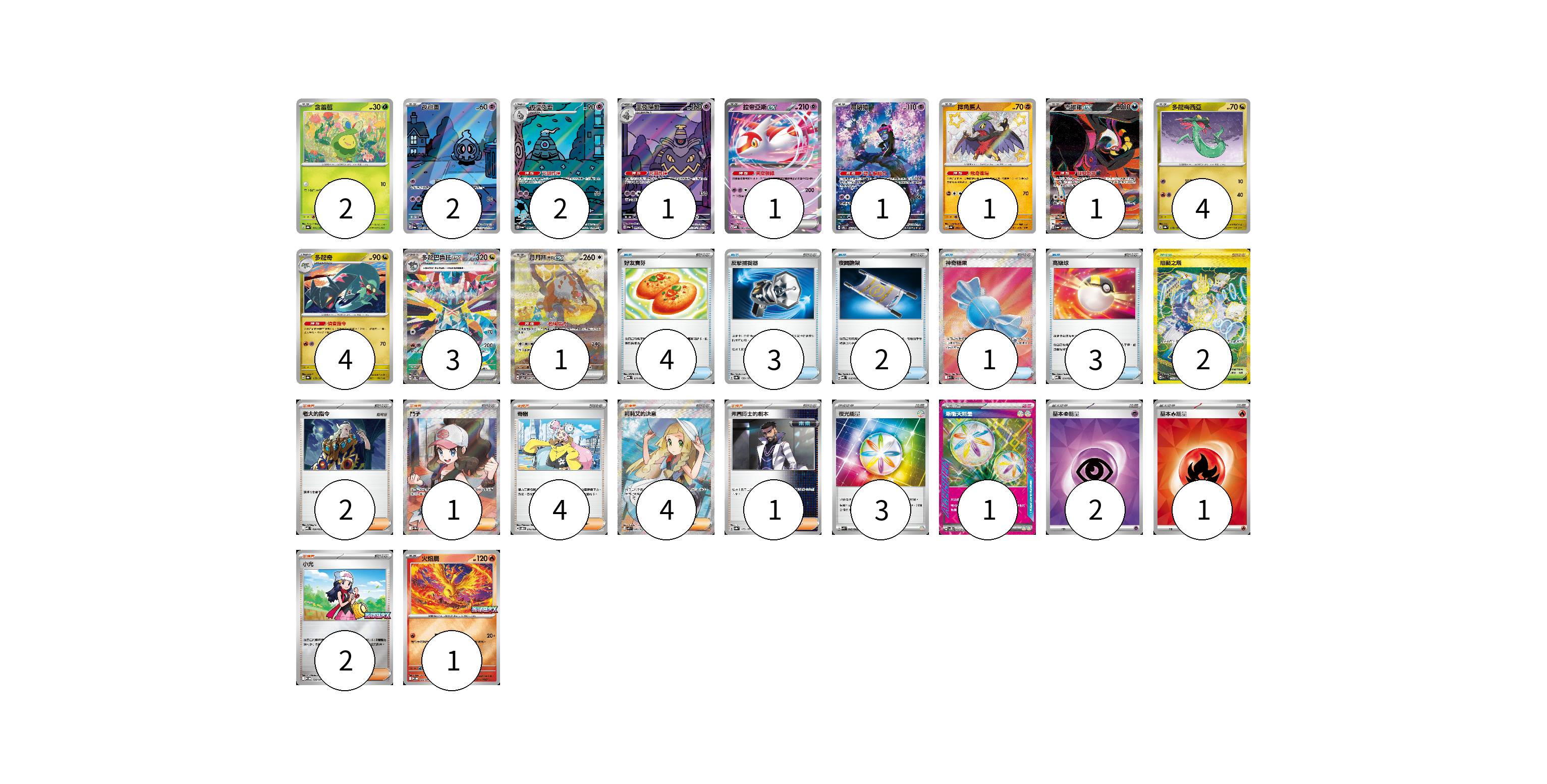 牌組構築方案 以此牌組為基礎新構築牌組 顯示卡面 顯示列表 寶可夢卡(24) 2 2 2 1 1 1 1 1 4 4 3 1 1 物品卡(13) 4 3 2 1 3 支援者卡(14) 2 1 4 4 1 2 競技場卡(2) 2 能量卡(7) 3 1 2 1 寶可夢卡(24) 卡牌名稱 張數 卡牌名稱 張數 含羞苞 SV8a 001/187 02 夜巡靈 SV6a 068/064 02 彷徨夜靈 SV6a 069/064 02 黑夜魔靈 SV6a 070/064 01 拉帝亞斯ex MBD 003/022 01 願增猿 SV6 107/101 01 摔角鷹人 SV4a 282/190 01 吉雉雞ex SV6a 089/064 01 多龍梅西亞 SV8a 118/187 04 多龍奇 SV8a 119/187 04 多龍巴魯托ex SV8a 221/187 03 月月熊 赫月 ex SV5a 091/066 01 火焰鳥 M-P 022/M-P 01 物品卡(13) 卡牌名稱 張數 卡牌名稱 張數 好友寶芬 MBG 011/022 04 反擊捕捉器 SV8a 139/187 03 夜間擔架 MBD 016/022 02 神奇糖果 M1S 082/063 01 高級球 MBD 014/022 03 支援者卡(14) 卡牌名稱 張數 卡牌名稱 張數 老大的指令 MBD 020/022 02 鬥子 SV11W 166/086 01 奇樹 SVOD 016/020 04 莉莉艾的決意 M1L 086/063 04 弗圖博士的劇本 SV8a 175/187 01 小光 M-P 028/M-P 02 競技場卡(2) 卡牌名稱 張數 卡牌名稱 張數 阻礙之塔 SV10 132/098 02 能量卡(7) 卡牌名稱 張數 卡牌名稱 張數 夜光能量 SVK 042/042 03 新衝天能量 SV5K 071/071 01 基本【超】能量 SVOD PSY 02 基本【火】能量 SVQL FIR 01 以此牌組為基礎新構築牌組 牌組編碼 mwFOff-SxMGqi-BPOTCq copy 列印牌組單 牌組編碼已複製 分享至SNS