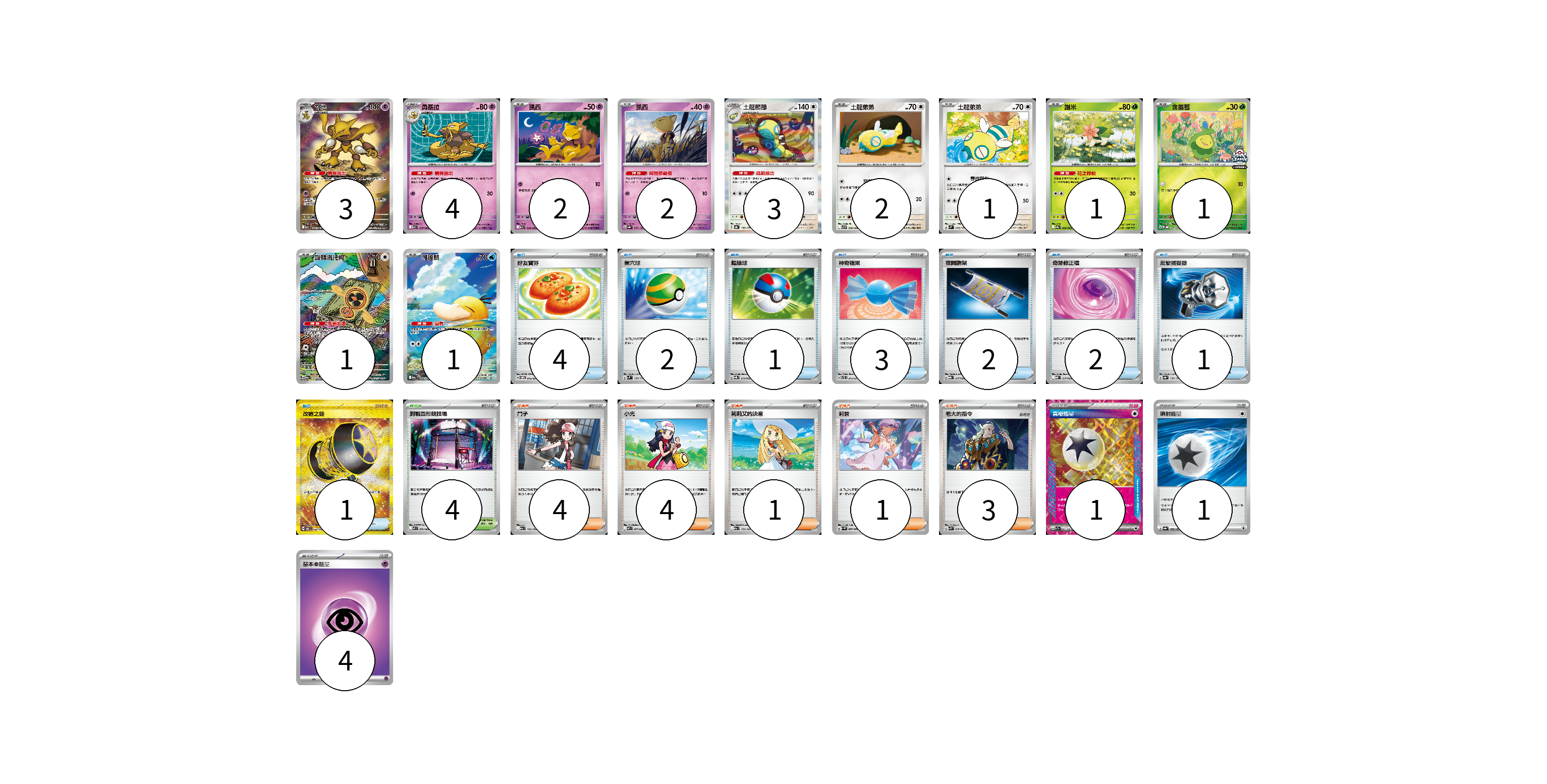 牌組構築方案 以此牌組為基礎新構築牌組 顯示卡面 顯示列表 寶可夢卡(21) 3 4 2 2 3 2 1 1 1 1 1 物品卡(16) 4 2 1 3 2 2 1 1 支援者卡(13) 4 4 1 1 3 競技場卡(4) 4 能量卡(6) 1 1 4 寶可夢卡(21) 卡牌名稱 張數 卡牌名稱 張數 胡地 M1S 071/063 03 勇基拉 M1S 037/063 04 凱西 M1S 036/063 02 凱西 SV8a 057/187 02 土龍節節 SV8a 130/187 03 土龍弟弟 SV9 078/100 02 土龍弟弟 SVM 095/175 01 謝米 SV9a 006/063 01 含羞苞 M-P 037/M-P 01 旋轉洛托姆 M2a 213/193 01 可達鴨 M2a 199/193 01 物品卡(16) 卡牌名稱 張數 卡牌名稱 張數 好友寶芬 SVOM 012/021 04 巢穴球 SVM 133/175 02 超級球 SVQL 014/022 01 神奇糖果 SVTL 013/021 03 夜間擔架 MBG 017/022 02 奇跡修正檔 MBD 017/022 02 反擊捕捉器 SV8a 139/187 01 改造之錘 SV6 132/101 01 支援者卡(13) 卡牌名稱 張數 卡牌名稱 張數 鬥子 M2a 172/193 04 小光 M2 077/080 04 莉莉艾的決意 M2a 175/193 01 莉普 SV4M 066/066 01 老大的指令 SVK 036/042 03 競技場卡(4) 卡牌名稱 張數 卡牌名稱 張數 對戰圓形競技場 M2 079/080 04 能量卡(6) 卡牌名稱 張數 卡牌名稱 張數 富裕能量 SV7a 064/064 01 噴射能量 SV8a 185/187 01 基本超能量 sv-p PSY 04 以此牌組為基礎新構築牌組 牌組編碼 mxlEhr-RCxkYU-WvWFDk copy 列印牌組單 牌組編碼已複製 分享至SNS