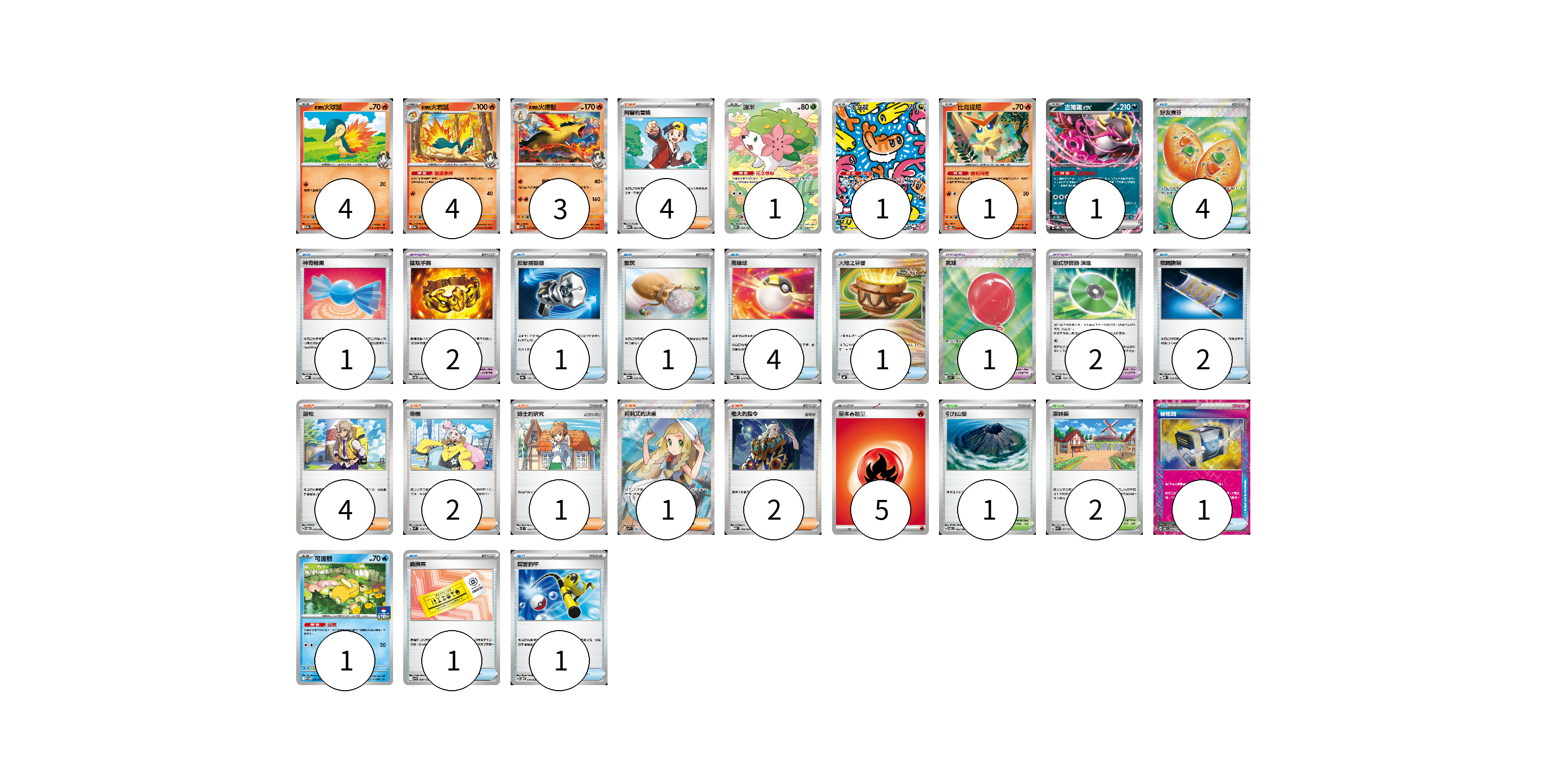牌組構築方案 以此牌組為基礎新構築牌組 顯示卡面 顯示列表 寶可夢卡(16) 4 4 3 1 1 1 1 1 寶可夢道具(5) 2 1 2 物品卡(17) 4 1 1 1 4 1 2 1 1 1 支援者卡(14) 4 4 2 1 1 2 競技場卡(3) 1 2 能量卡(5) 5 寶可夢卡(16) 卡牌名稱 張數 卡牌名稱 張數 <阿響的>火球鼠 SV9a 015/063 04 <阿響的>火岩鼠 SV9a 016/063 04 <阿響的>火爆獸 SV9a 017/063 03 謝米 SV9a 066/063 01 米立龍 SV6 112/101 01 比克提尼 SV8 012/106 01 吉雉雞ex SVOM 009/021 01 可達鴨 SV-P 220/SV-P 01 寶可夢道具(5) 卡牌名稱 張數 卡牌名稱 張數 猛攻手鐲 SV11W 082/086 02 氣球 M1L 084/063 01 招式學習器 演進 SV8a 160/187 02 物品卡(17) 卡牌名稱 張數 卡牌名稱 張數 好友寶芬 M1S 081/063 04 神奇糖果 MBG 013/022 01 反擊捕捉器 SV8a 139/187 01 聖灰 SV9a 056/063 01 高級球 MBD 014/022 04 大地之容器 SVHK 011/022 01 夜間擔架 MBD 016/022 02 秘密箱 SV6 092/101 01 調換票 SV9 090/100 01 厲害釣竿 SVOD 010/020 01 支援者卡(14) 卡牌名稱 張數 卡牌名稱 張數 阿響的冒險 SV9a 063/063 04 派帕 SVOD 018/020 04 奇樹 SVM 160/175 02 博士的研究 SVM 166/175 01 莉莉艾的決意 M1L 086/063 01 老大的指令 MBD 020/022 02 競技場卡(3) 卡牌名稱 張數 卡牌名稱 張數 引力山岳 SV8 106/106 01 深缽鎮 SVK 039/042 02 能量卡(5) 卡牌名稱 張數 卡牌名稱 張數 基本火能量 sv-p FIR 05 以此牌組為基礎新構築牌組 牌組編碼 mzzsyk-EeMHdV-eakKRY copy 列印牌組單 牌組編碼已複製 分享至SNS