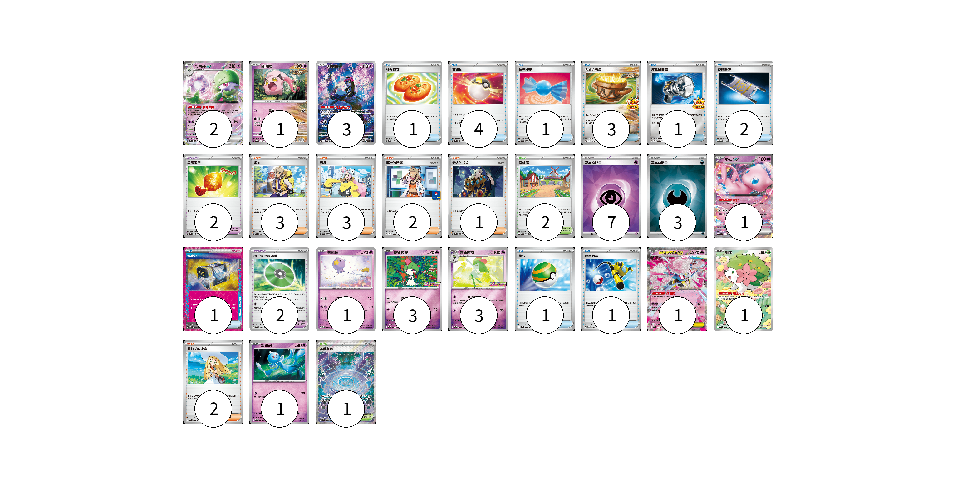 牌組構築方案 以此牌組為基礎新構築牌組 顯示卡面 顯示列表 寶可夢卡(17) 2 1 3 1 1 3 3 1 1 1 寶可夢道具(4) 2 2 物品卡(15) 1 4 1 3 1 2 1 1 1 支援者卡(11) 3 3 2 1 2 競技場卡(3) 2 1 能量卡(10) 7 3 寶可夢卡(17) 卡牌名稱 張數 卡牌名稱 張數 沙奈朵ex SV4a 082/190 02 吼叫尾 SV8a 071/187 01 願增猿 SV6 107/101 03 夢幻ex SVK 001/042 01 飄飄球 SVTS 005/022 01 拉魯拉絲 M-P 005/M-P 03 奇魯莉安 M-P 006/M-P 03 超級蒂安希ex MBD 006/022 01 謝米 SV9a 066/063 01 輕飄飄 SV11W 041/086 01 寶可夢道具(4) 卡牌名稱 張數 卡牌名稱 張數 勇氣護符 SVM 142/175 02 招式學習器 演進 SV8a 160/187 02 物品卡(15) 卡牌名稱 張數 卡牌名稱 張數 好友寶芬 SV8a 147/187 01 高級球 SVM 134/175 04 神奇糖果 SVM 135/175 01 大地之容器 SV-P 084/SV-P 03 反擊捕捉器 SV-P 083/SV-P 01 夜間擔架 SV8a 151/187 02 秘密箱 SV6 092/101 01 巢穴球 SVM 133/175 01 厲害釣竿 SVOD 010/020 01 支援者卡(11) 卡牌名稱 張數 卡牌名稱 張數 派帕 SVK 035/042 03 奇樹 SVM 160/175 03 博士的研究 SV-P 113/SV-P 02 老大的指令 SVM 172/175 01 莉莉艾的決意 MBD 021/022 02 競技場卡(3) 卡牌名稱 張數 卡牌名稱 張數 深缽鎮 SVK 039/042 02 神秘花園 M1S 086/063 01 能量卡(10) 卡牌名稱 張數 卡牌名稱 張數 基本【超】能量 SVK PSY 07 基本【惡】能量 SVK DAR 03 以此牌組為基礎新構築牌組 牌組編碼 nANnFz-vdDbSv-BCloam copy 列印牌組單 牌組編碼已複製 分享至SNS