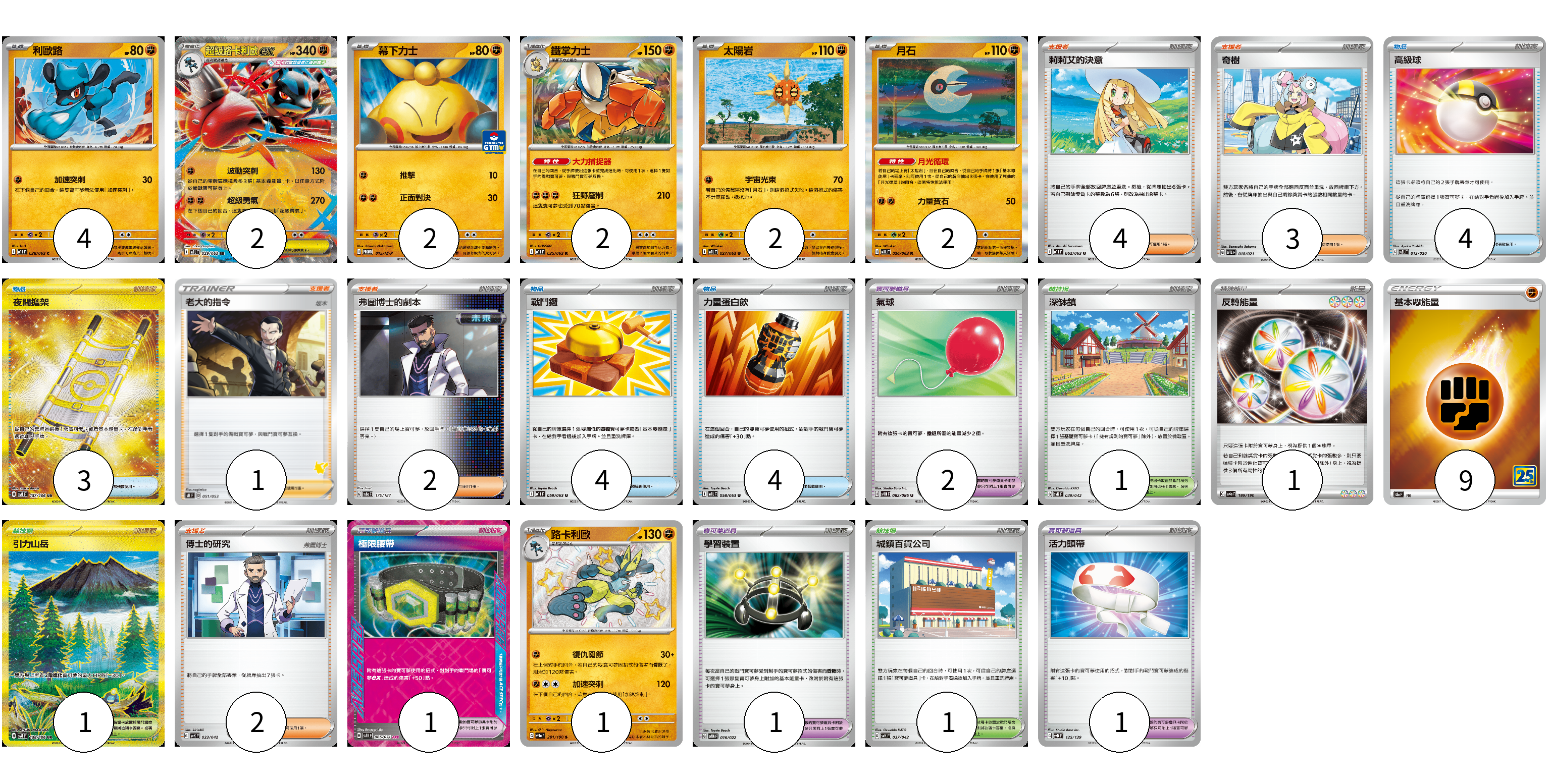 牌組構築方案 以此牌組為基礎新構築牌組 顯示卡面 顯示列表 寶可夢卡(15) 4 2 2 2 2 2 1 寶可夢道具(8) 3 2 1 1 1 物品卡(15) 4 3 4 4 支援者卡(9) 4 1 2 2 競技場卡(3) 1 1 1 能量卡(10) 1 9 寶可夢卡(15) 卡牌名稱 張數 卡牌名稱 張數 利歐路 M1L 028/063 04 超級路卡利歐ex M1L 029/063 02 幕下力士 M-P 015/M-P 02 鐵掌力士 M1L 025/063 02 太陽岩 M1L 027/063 02 月石 M1L 026/063 02 路卡利歐 SV4a 281/190 01 寶可夢道具(8) 卡牌名稱 張數 卡牌名稱 張數 奇樹 SVTL 018/021 03 氣球 SV11B 082/086 02 極限腰帶 SV5K 066/071 01 學習裝置 SVTM 016/022 01 活力頭帶 SVD 125/139 01 物品卡(15) 卡牌名稱 張數 卡牌名稱 張數 高級球 SVEL 012/020 04 夜間擔架 SV8 137/106 03 戰鬥鑼 M1L 059/063 04 力量蛋白飲 M1L 058/063 04 支援者卡(9) 卡牌名稱 張數 卡牌名稱 張數 莉莉艾的決意 M1L 062/063 04 老大的指令(坂木) SH 051/053 01 弗圖博士的劇本 SV8a 175/187 02 博士的研究 SVK 033/042 02 競技場卡(3) 卡牌名稱 張數 卡牌名稱 張數 深缽鎮 SVK 039/042 01 引力山岳 SV8 138/106 01 城鎮百貨公司 SVK 037/042 01 能量卡(10) 卡牌名稱 張數 卡牌名稱 張數 反轉能量 SV4a 189/190 01 基本鬥能量 S8a FIG 09 以此牌組為基礎新構築牌組 牌組編碼 nCpUkc-gskRoF-WtpVKP copy 列印牌組單 牌組編碼已複製 分享至SNS