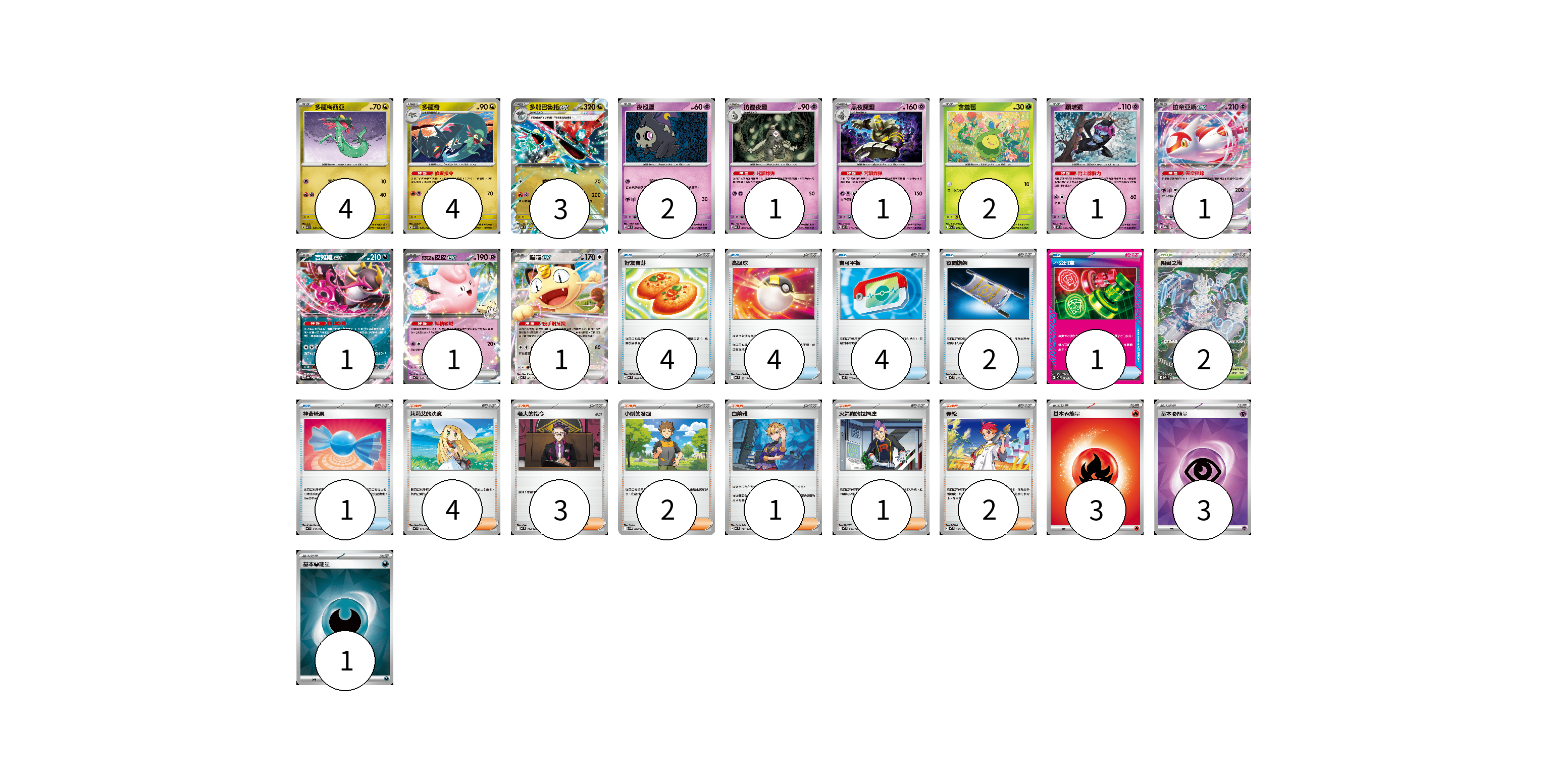 牌組構築方案 以此牌組為基礎新構築牌組 顯示卡面 顯示列表 寶可夢卡(22) 4 4 3 2 1 1 2 1 1 1 1 1 物品卡(16) 4 4 4 2 1 1 支援者卡(13) 4 3 2 1 1 2 競技場卡(2) 2 能量卡(7) 3 3 1 寶可夢卡(22) 卡牌名稱 張數 卡牌名稱 張數 多龍梅西亞 MC 546/742 04 多龍奇 MC 547/742 04 多龍巴魯托ex MC 548/742 03 夜巡靈 MC 308/742 02 彷徨夜靈 MC 309/742 01 黑夜魔靈 MC 310/742 01 含羞苞 M2a 011/193 02 願增猿 MC 358/742 01 拉帝亞斯ex M2a 075/193 01 吉雉雞ex SV8a 104/187 01 <莉莉艾的>皮皮ex MC 287/742 01 喵喵ex M3 061/080 01 物品卡(16) 卡牌名稱 張數 卡牌名稱 張數 好友寶芬 MC 648/742 04 高級球 MC 651/742 04 寶可平板 M3 070/080 04 夜間擔架 MC 670/742 02 不公印章 MC 633/742 01 神奇糖果 MC 655/742 01 支援者卡(13) 卡牌名稱 張數 卡牌名稱 張數 莉莉艾的決意 MC 729/742 04 老大的指令 MC 724/742 03 小剛的發掘 SV9 096/100 02 白蕾雅 MC 722/742 01 火箭隊的拉姆達 MC 734/742 01 赤松 MC 696/742 02 競技場卡(2) 卡牌名稱 張數 卡牌名稱 張數 阻礙之塔 M2a 222/193 02 能量卡(7) 卡牌名稱 張數 卡牌名稱 張數 基本【火】能量 MC FIR 03 基本【超】能量 SVOD PSY 03 基本【惡】能量 SVOM DAR 01 以此牌組為基礎新構築牌組 牌組編碼 nEDpem-GkmhMg-EiOtbB copy 列印牌組單 牌組編碼已複製 分享至SNS