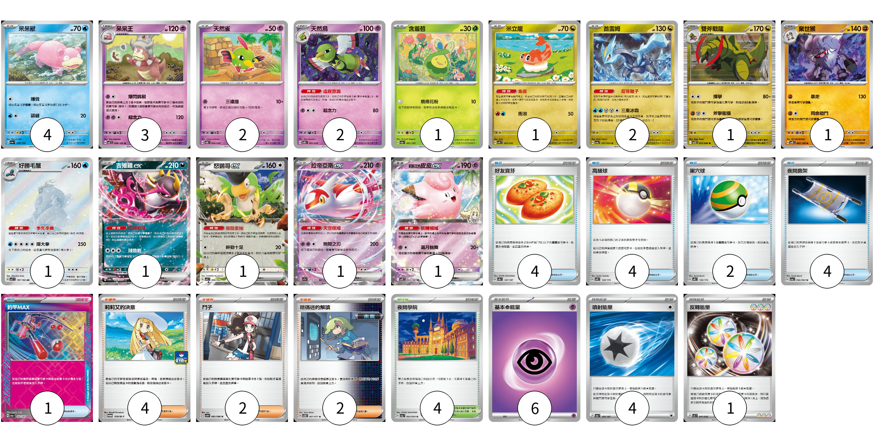 牌組構築方案 以此牌組為基礎新構築牌組 顯示卡面 顯示列表 寶可夢卡(22) 4 3 2 2 1 1 2 1 1 1 1 1 1 1 物品卡(15) 4 4 2 4 1 支援者卡(8) 4 2 2 競技場卡(4) 4 能量卡(11) 6 4 1 寶可夢卡(22) 卡牌名稱 張數 卡牌名稱 張數 呆呆獸 SV4a 036/190 04 呆呆王 SV7 039/102 03 天然雀 SVEM 004/020 02 天然鳥 SVEM 005/020 02 含羞苞 SV8a 001/187 01 米立龍 SVK 002/042 01 酋雷姆 SV6a 047/064 02 雙斧戰龍 SV11B 072/086 01 棄世猴 SV8 062/106 01 好勝毛蟹 SV7 107/102 01 吉雉雞ex SV6a 038/064 01 怒鸚哥ex SVK 006/042 01 拉帝亞斯ex SV7a 019/064 01 莉莉艾的皮皮ex SV9 033/100 01 物品卡(15) 卡牌名稱 張數 卡牌名稱 張數 好友寶芬 SV8a 147/187 04 高級球 SVM 134/175 04 巢穴球 SVM 133/175 02 夜間擔架 SV6a 056/064 04 釣竿MAX SV8a 142/187 01 支援者卡(8) 卡牌名稱 張數 卡牌名稱 張數 莉莉艾的決意 M-P 018/M-P 04 鬥子 SV11W 085/086 02 暗碼迷的解讀 SV5M 067/071 02 競技場卡(4) 卡牌名稱 張數 卡牌名稱 張數 夜間學院 SV6a 064/064 04 能量卡(11) 卡牌名稱 張數 卡牌名稱 張數 基本【超】能量 SVF PSY 06 噴射能量 SV8a 185/187 04 反轉能量 SVK 041/042 01 以此牌組為基礎新構築牌組 牌組編碼 nFLyUR-CZZecf-eBeqjA copy 列印牌組單 牌組編碼已複製 分享至SNS