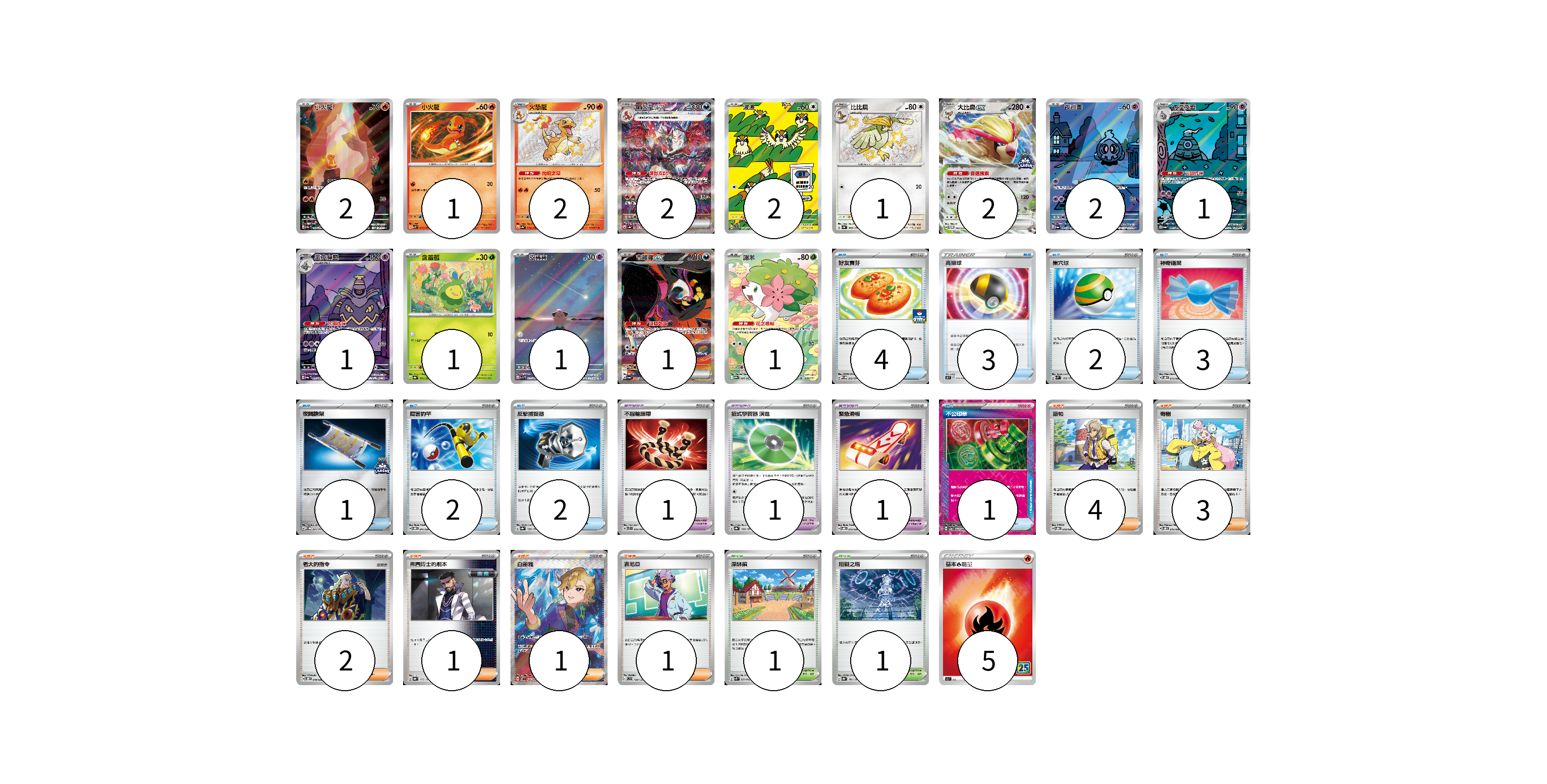 牌組構築方案 以此牌組為基礎新構築牌組 顯示卡面 顯示列表 寶可夢卡(20) 2 1 2 2 2 1 2 2 1 1 1 1 1 1 寶可夢道具(3) 1 1 1 物品卡(18) 4 3 2 3 1 2 2 1 支援者卡(12) 4 3 2 1 1 1 競技場卡(2) 1 1 能量卡(5) 5 寶可夢卡(20) 卡牌名稱 張數 卡牌名稱 張數 小火龍 SV2a 168/165 02 小火龍 SV3 012/108 01 火恐龍 SV4a 211/190 02 噴火龍ex SV4a 349/190 02 波波 SV3 118/108 02 比比鳥 SV4a 305/190 01 大比鳥ex SV-P 183/SV-P 02 夜巡靈 SV6a 068/064 02 彷徨夜靈 SV6a 069/064 01 黑夜魔靈 SV6a 070/064 01 含羞苞 SV8a 001/187 01 皮寶寶 SV3 113/108 01 吉雉雞ex SV6a 089/064 01 謝米 SV9a 066/063 01 寶可夢道具(3) 卡牌名稱 張數 卡牌名稱 張數 不服輸頭帶 SVTL 016/021 01 招式學習器 演進 SV8a 160/187 01 緊急滑板 SVOD 015/020 01 物品卡(18) 卡牌名稱 張數 卡牌名稱 張數 好友寶芬 SV-P 212/SV-P 04 高級球 SK 015/030 03 巢穴球 SVM 133/175 02 神奇糖果 SVOD 013/020 03 夜間擔架 SV-P 204/SV-P 01 厲害釣竿 SVOM 011/021 02 反擊捕捉器 SV8a 139/187 02 不公印章 SV5a 053/066 01 支援者卡(12) 卡牌名稱 張數 卡牌名稱 張數 派帕 SVOD 018/020 04 奇樹 SVOD 016/020 03 老大的指令 SVOD 019/020 02 弗圖博士的劇本 SV8a 175/187 01 白蕾雅 SV7 126/102 01 吉尼亞 SVD 129/139 01 競技場卡(2) 卡牌名稱 張數 卡牌名稱 張數 深缽鎮 SVK 039/042 01 阻礙之塔 SV8a 181/187 01 能量卡(5) 卡牌名稱 張數 卡牌名稱 張數 基本火能量 S8a FIR 05 以此牌組為基礎新構築牌組 牌組編碼 nFxmJK-DuMkke-IhWBIv copy 列印牌組單 牌組編碼已複製 分享至SNS