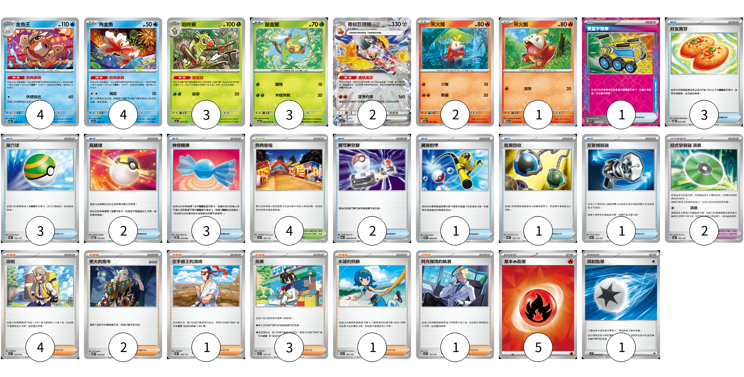 牌組構築方案 以此牌組為基礎新構築牌組 顯示卡面 顯示列表 寶可夢卡(19) 4 4 3 3 2 2 1 寶可夢道具(2) 2 物品卡(17) 1 3 3 2 3 2 1 1 1 支援者卡(12) 4 2 1 3 1 1 競技場卡(4) 4 能量卡(6) 5 1 寶可夢卡(19) 卡牌名稱 張數 卡牌名稱 張數 金魚王 SV8a 029/187 04 角金魚 SV8a 028/187 04 啪咚猴 SV8a 007/187 03 敲音猴 SV6 008/101 03 骨紋巨聲鱷ex SVEL 008/020 02 呆火鱷 SVEL 005/020 02 呆火鱷 SV1a 017/073 01 寶可夢道具(2) 卡牌名稱 張數 卡牌名稱 張數 招式學習器 演進 SV8a 160/187 02 物品卡(17) 卡牌名稱 張數 卡牌名稱 張數 貴重手推車 SVK 020/042 01 好友寶芬 SVOM 012/021 03 巢穴球 SVM 133/175 03 高級球 SVOM 013/021 02 神奇糖果 SVOD 013/020 03 寶可夢交替 SV9a 058/063 02 厲害釣竿 SVTH 008/018 01 能量回收 SVM 125/175 01 反擊捕捉器 SV8a 139/187 01 支援者卡(12) 卡牌名稱 張數 卡牌名稱 張數 派帕 SVK 035/042 04 老大的指令 SVTR 019/021 02 空手道王的演練 SVM 148/175 01 烏栗 SV8a 169/187 03 水蓮的照顧 SV8a 168/187 01 阿克羅瑪的執著 SV8a 164/187 01 競技場卡(4) 卡牌名稱 張數 卡牌名稱 張數 祭典會場 SV8a 180/187 04 能量卡(6) 卡牌名稱 張數 卡牌名稱 張數 基本【火】能量 SVK FIR 05 噴射能量 SVK 040/042 01 以此牌組為基礎新構築牌組 牌組編碼 nHTgcY-giNGbg-PHjlsG copy 列印牌組單 牌組編碼已複製 分享至SNS