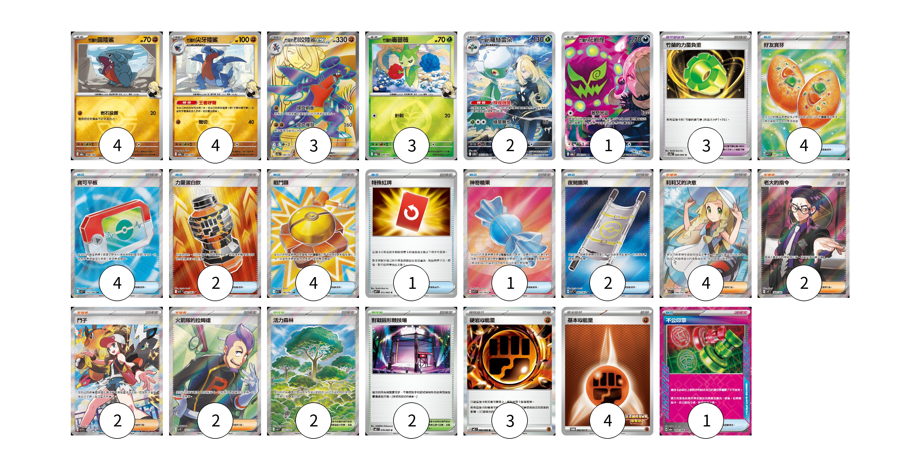 牌組構築方案 以此牌組為基礎新構築牌組 顯示卡面 顯示列表 寶可夢卡(17) 4 4 3 3 2 1 寶可夢道具(3) 3 物品卡(19) 4 4 2 4 1 1 2 1 支援者卡(10) 4 2 2 2 競技場卡(4) 2 2 能量卡(7) 3 4 寶可夢卡(17) 卡牌名稱 張數 卡牌名稱 張數 竹蘭的圓陸鯊 M2a 088/193 04 竹蘭的尖牙陸鯊 M2a 089/193 04 <竹蘭的>烈咬陸鯊ex SV9a 080/063 03 竹蘭的毒薔薇 M2a 009/193 03 <竹蘭的>羅絲雷朵 SV9a 065/063 02 <竹蘭的>花岩怪 M2a 208/193 01 寶可夢道具(3) 卡牌名稱 張數 卡牌名稱 張數 竹蘭的力量負重 SV9a 060/063 03 物品卡(19) 卡牌名稱 張數 卡牌名稱 張數 好友寶芬 M1S 081/063 04 寶可平板 M3 103/080 04 力量蛋白飲 M1L 081/063 02 戰鬥鑼 M1L 082/063 04 特殊紅牌 M4 072/083 01 神奇糖果 M1S 082/063 01 夜間擔架 M1L 083/063 02 不公印章 SV5a 053/066 01 支援者卡(10) 卡牌名稱 張數 卡牌名稱 張數 莉莉艾的決意 M1L 086/063 04 老大的指令(烏羽) MC 760/742 02 鬥子 SV11W 173/086 02 火箭隊的拉姆達 SV10 122/098 02 競技場卡(4) 卡牌名稱 張數 卡牌名稱 張數 活力森林 M3 109/080 02 對戰圓形競技場 M2 079/080 02 能量卡(7) 卡牌名稱 張數 卡牌名稱 張數 硬岩【鬥】能量 M3 080/080 03 基本【鬥】能量 SV-P 262/SV-P 04 以此牌組為基礎新構築牌組 牌組編碼 nIbkzY-mzsMLV-aziICj copy 列印牌組單 牌組編碼已複製 分享至SNS