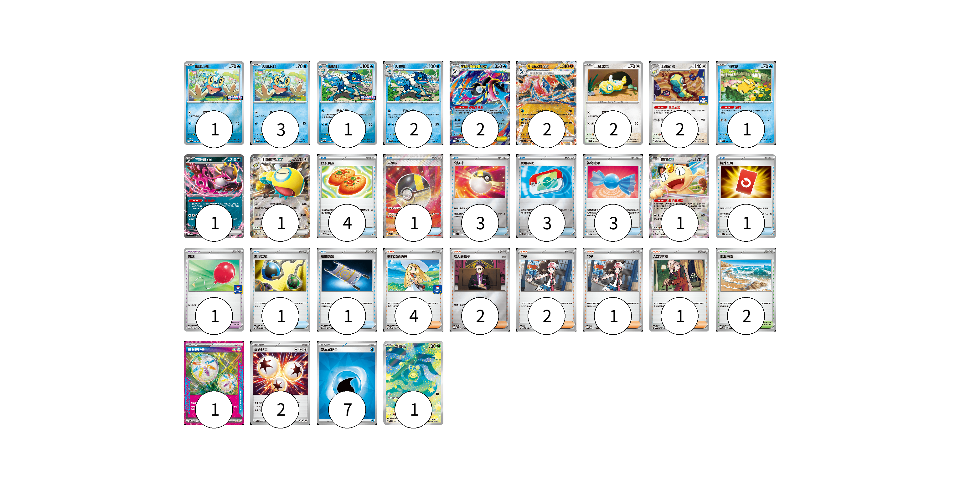 牌組構築方案 以此牌組為基礎新構築牌組 顯示卡面 顯示列表 寶可夢卡(20) 1 3 1 2 2 2 2 2 1 1 1 1 1 寶可夢道具(1) 1 物品卡(17) 4 1 3 3 3 1 1 1 支援者卡(10) 4 2 2 1 1 競技場卡(2) 2 能量卡(10) 1 2 7 寶可夢卡(20) 卡牌名稱 張數 卡牌名稱 張數 呱呱泡蛙 M-P 089/M-P 01 呱呱泡蛙 M4 020/083 03 呱頭蛙 M-P 090/M-P 01 呱頭蛙 M4 021/083 02 超級甲賀忍蛙ex M4 022/083 02 甲賀忍蛙ex SV5a 045/066 02 土龍弟弟 SV9 078/100 02 土龍節節 M-P 045/M-P 02 可達鴨 M2a 032/193 01 吉雉雞ex SVOD 004/020 01 土龍節節ex SV9 079/100 01 喵喵ex M3 061/080 01 含羞苞 M2a 196/193 01 寶可夢道具(1) 卡牌名稱 張數 卡牌名稱 張數 氣球 M-P 047/M-P 01 物品卡(17) 卡牌名稱 張數 卡牌名稱 張數 好友寶芬 SVOD 011/020 04 高級球 M2a 216/193 01 高級球 MC 651/742 03 寶可平板 MC 662/742 03 神奇糖果 MBG 013/022 03 特殊紅牌 M4 072/083 01 能量回收 MC 636/742 01 夜間擔架 MBG 017/022 01 支援者卡(10) 卡牌名稱 張數 卡牌名稱 張數 莉莉艾的決意 M-P 018/M-P 04 老大的指令 MC 724/742 02 鬥子 M2a 172/193 02 鬥子 SV11W 085/086 01 AZ的平和 M4 075/083 01 競技場卡(2) 卡牌名稱 張數 卡牌名稱 張數 衝浪海灘 M1S 062/063 02 能量卡(10) 卡牌名稱 張數 卡牌名稱 張數 新衝天能量 SV5K 071/071 01 燃火能量 MC 736/742 02 基本【水】能量 SVM WAT 07 以此牌組為基礎新構築牌組 牌組編碼 nIxTTx-mfURDC-AKytTS copy 列印牌組單 牌組編碼已複製 分享至SNS
