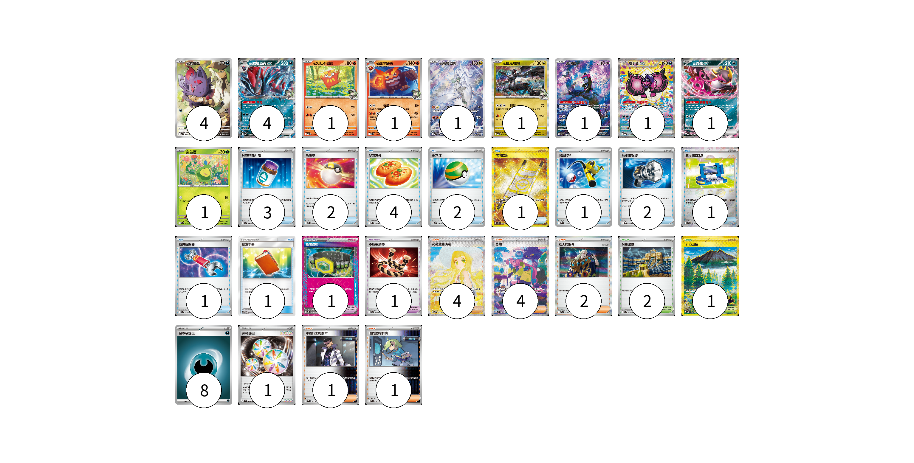 牌組構築方案 以此牌組為基礎新構築牌組 顯示卡面 顯示列表 寶可夢卡(16) 4 4 1 1 1 1 1 1 1 1 寶可夢道具(2) 1 1 物品卡(18) 3 2 4 2 1 1 2 1 1 1 支援者卡(12) 4 4 2 1 1 競技場卡(3) 2 1 能量卡(9) 8 1 寶可夢卡(16) 卡牌名稱 張數 卡牌名稱 張數 N的索羅亞 SV9 108/100 04 N的索羅亞克ex M2a 112/193 04 N的火紅不倒翁 M2a 027/193 01 N的達摩狒狒 M2a 028/193 01 N的萊希拉姆 SV9 109/100 01 N的捷克羅姆 M2a 129/193 01 願增猿 SV6 107/101 01 桃歹郎ex SV8a 219/187 01 吉雉雞ex M2a 114/193 01 含羞苞 M2a 011/193 01 寶可夢道具(2) 卡牌名稱 張數 卡牌名稱 張數 極限腰帶 SV8a 159/187 01 不服輸頭帶 SVTL 016/021 01 物品卡(18) 卡牌名稱 張數 卡牌名稱 張數 N的PP提升劑 M2a 146/193 03 高級球 MBG 012/022 02 好友寶芬 MBG 011/022 04 巢穴球 SV1S 070/078 02 夜間擔架 SV8 137/106 01 厲害釣竿 SV2P 066/071 01 反擊捕捉器 SV4M 059/066 02 寶可裝置3.0 SV11B 081/086 01 道具拆除器 M2a 151/193 01 朋友手冊 AC2D 145/176 01 支援者卡(12) 卡牌名稱 張數 卡牌名稱 張數 莉莉艾的決意 M1L 091/063 04 奇樹 SV4a 350/190 04 老大的指令 SV1a 069/073 02 弗圖博士的劇本 SV8a 175/187 01 暗碼迷的解讀 MC 698/742 01 競技場卡(3) 卡牌名稱 張數 卡牌名稱 張數 N的城堡 M2a 181/193 02 引力山岳 SV8 138/106 01 能量卡(9) 卡牌名稱 張數 卡牌名稱 張數 基本惡能量 sv-p DAR 08 反轉能量 SVK 041/042 01 以此牌組為基礎新構築牌組 牌組編碼 nJspHi-WCIxuq-BMdBYO copy 列印牌組單 牌組編碼已複製 分享至SNS