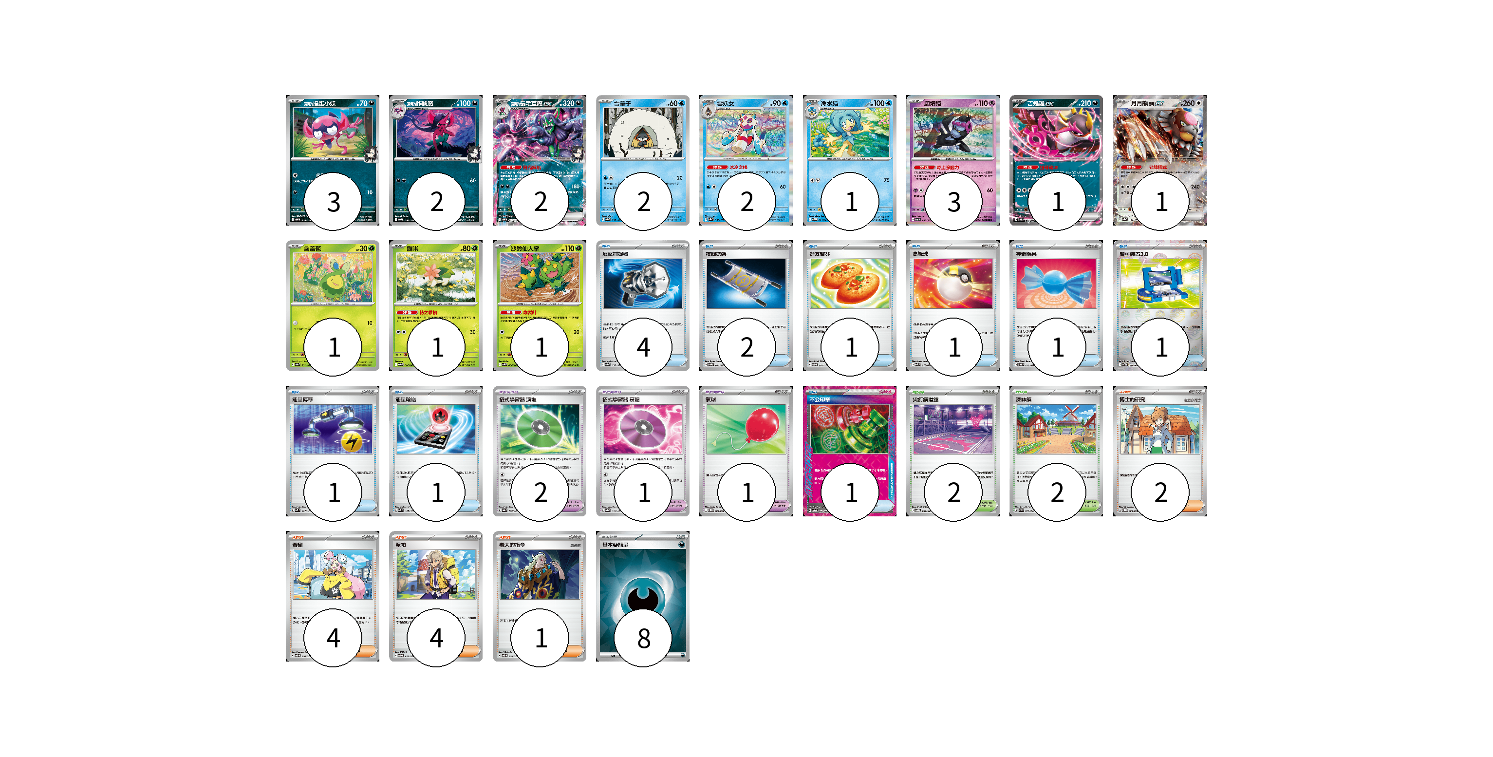 牌組構築方案 以此牌組為基礎新構築牌組 顯示卡面 顯示列表 寶可夢卡(20) 3 2 2 2 2 1 3 1 1 1 1 1 寶可夢道具(4) 2 1 1 物品卡(13) 4 2 1 1 1 1 1 1 1 支援者卡(11) 2 4 4 1 競技場卡(4) 2 2 能量卡(8) 8 寶可夢卡(20) 卡牌名稱 張數 卡牌名稱 張數 <瑪俐的>搗蛋小妖 SVOM 005/021 03 <瑪俐的>詐唬魔 SVOM 006/021 02 <瑪俐的>長毛巨魔ex SVOM 007/021 02 雪童子 SV8a 037/187 02 雪妖女 SV8a 038/187 02 冷水猿 SV11B 021/086 01 願增猿 SV6 055/101 03 吉雉雞ex SVOD 004/020 01 月月熊 赫月ex SV8a 134/187 01 含羞苞 SV8a 001/187 01 謝米 SV9a 006/063 01 沙鈴仙人掌 SV9 006/100 01 寶可夢道具(4) 卡牌名稱 張數 卡牌名稱 張數 招式學習器 演進 SV8a 160/187 02 招式學習器 衰退 SV8a 161/187 01 氣球 SV11B 082/086 01 物品卡(13) 卡牌名稱 張數 卡牌名稱 張數 反擊捕捉器 SV8a 139/187 04 夜間擔架 SVOM 016/021 02 好友寶芬 SVOD 011/020 01 高級球 SVQL 015/022 01 神奇糖果 SVOD 013/020 01 寶可裝置3.0 SV11B 081/086 01 能量轉移 SVM 127/175 01 能量輸送 SVM 128/175 01 不公印章 SV5a 053/066 01 支援者卡(11) 卡牌名稱 張數 卡牌名稱 張數 博士的研究 SV11B 084/086 02 奇樹 SVOD 016/020 04 派帕 SVOD 018/020 04 老大的指令 SVOD 019/020 01 競技場卡(4) 卡牌名稱 張數 卡牌名稱 張數 尖釘鎮道館 SVOM 021/021 02 深缽鎮 SVK 039/042 02 能量卡(8) 卡牌名稱 張數 卡牌名稱 張數 基本【惡】能量 SVOM DAR 08 以此牌組為基礎新構築牌組 牌組編碼 nKOgbY-vsiesj-rbUdcd copy 列印牌組單 牌組編碼已複製 分享至SNS