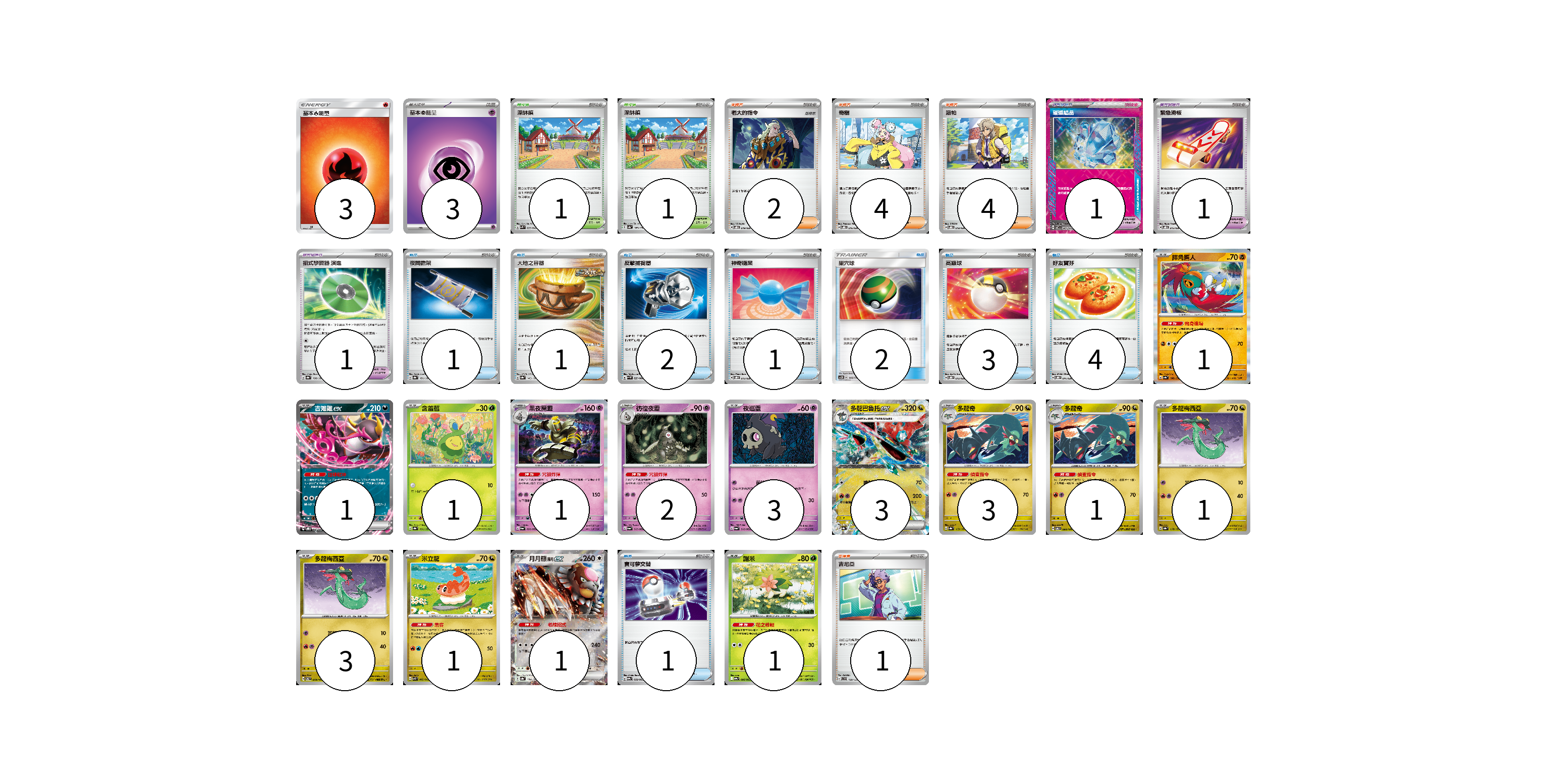 牌組構築方案 以此牌組為基礎新構築牌組 顯示卡面 顯示列表 寶可夢卡(23) 1 1 1 1 2 3 3 3 1 1 3 1 1 1 寶可夢道具(3) 1 1 1 物品卡(15) 1 1 2 1 2 3 4 1 支援者卡(11) 2 4 4 1 競技場卡(2) 1 1 能量卡(6) 3 3 寶可夢卡(23) 卡牌名稱 張數 卡牌名稱 張數 摔角鷹人 SV4a 106/190 01 吉雉雞ex SVOD 004/020 01 含羞苞 SV8a 001/187 01 黑夜魔靈 SV6a 020/064 01 彷徨夜靈 SV6a 019/064 02 夜巡靈 SV6a 018/064 03 多龍巴魯托ex SV8a 120/187 03 多龍奇 SV8a 119/187 03 多龍奇 SV6 080/101 01 多龍梅西亞 SV8a 118/187 01 多龍梅西亞 SV6 079/101 03 米立龍 SVK 002/042 01 月月熊 赫月ex SV8a 134/187 01 謝米 SV9a 006/063 01 寶可夢道具(3) 卡牌名稱 張數 卡牌名稱 張數 璀璨結晶 SV7 094/102 01 緊急滑板 SVOD 015/020 01 招式學習器 演進 SV8a 160/187 01 物品卡(15) 卡牌名稱 張數 卡牌名稱 張數 夜間擔架 SV8a 151/187 01 大地之容器 SV8a 143/187 01 反擊捕捉器 SV4M 059/066 02 神奇糖果 SVOD 013/020 01 巢穴球 AC2D 146/176 02 高級球 SVOD 012/020 03 好友寶芬 SVOD 011/020 04 寶可夢交替 SV9a 058/063 01 支援者卡(11) 卡牌名稱 張數 卡牌名稱 張數 老大的指令 SVOD 019/020 02 奇樹 SVOD 016/020 04 派帕 SVOD 018/020 04 吉尼亞 SVD 129/139 01 競技場卡(2) 卡牌名稱 張數 卡牌名稱 張數 深缽鎮 SVK 039/042 01 深缽鎮 SV4a 185/190 01 能量卡(6) 卡牌名稱 張數 卡牌名稱 張數 基本火能量 AS6D FIR 03 基本超能量 sv-p PSY 03 以此牌組為基礎新構築牌組 牌組編碼 nKQawq-SHJcHY-jFIoNQ copy 列印牌組單 牌組編碼已複製 分享至SNS