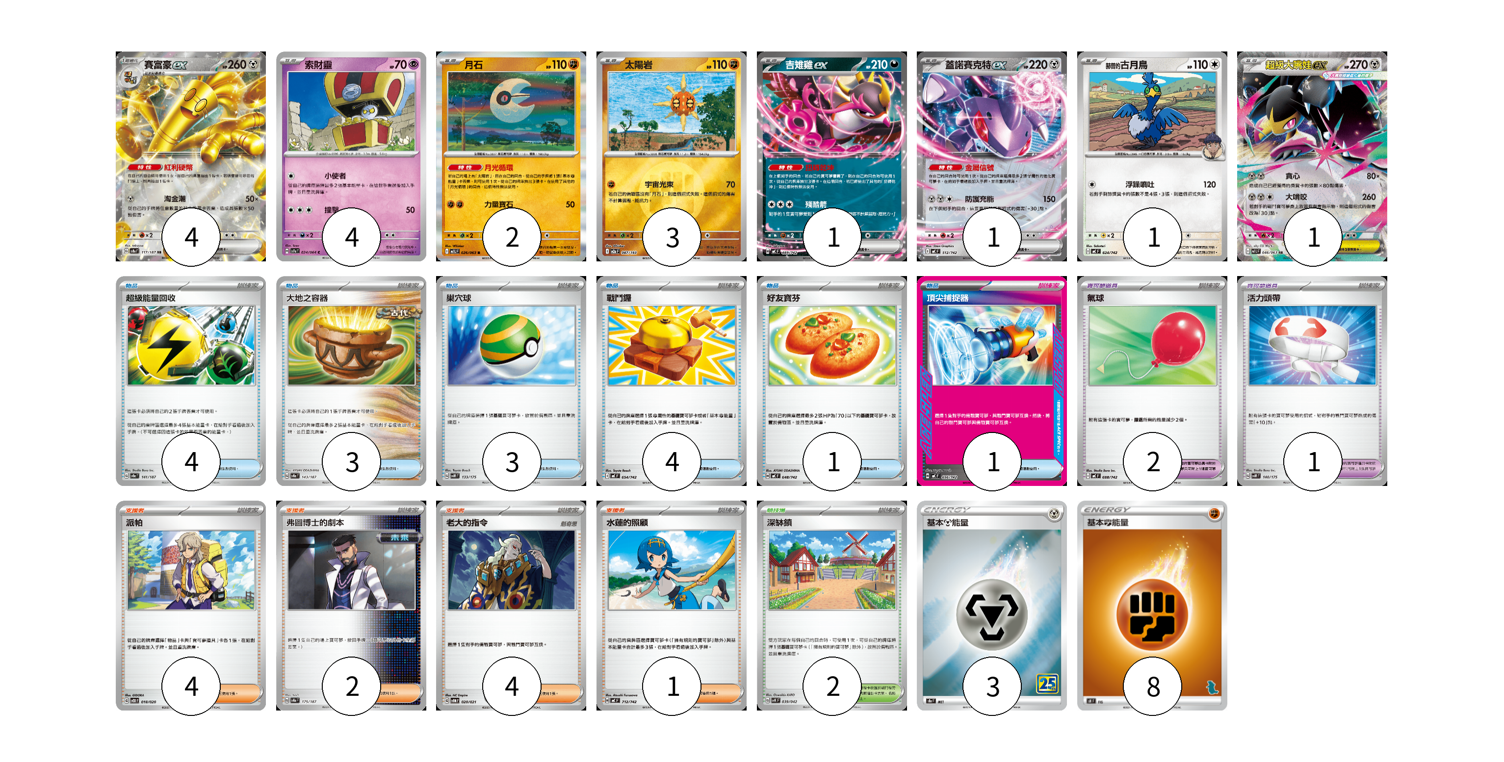 牌組構築方案 以此牌組為基礎新構築牌組 顯示卡面 顯示列表 寶可夢卡(17) 4 4 2 3 1 1 1 1 寶可夢道具(3) 2 1 物品卡(16) 4 3 3 4 1 1 支援者卡(11) 4 2 4 1 競技場卡(2) 2 能量卡(11) 3 8 寶可夢卡(17) 卡牌名稱 張數 卡牌名稱 張數 賽富豪ex SV8a 117/187 04 索財靈 SV7a 024/064 04 月石 M1L 026/063 02 太陽岩 M2a 087/193 03 吉雉雞ex MC 489/742 01 蓋諾賽克特ex MC 512/742 01 <赫普的>古月鳥 MC 624/742 01 超級大嘴娃ex M1L 046/063 01 寶可夢道具(3) 卡牌名稱 張數 卡牌名稱 張數 氣球 MC 688/742 02 活力頭帶 SVM 140/175 01 物品卡(16) 卡牌名稱 張數 卡牌名稱 張數 超級能量回收 SV8a 141/187 04 大地之容器 SV8a 143/187 03 巢穴球 SVM 133/175 03 戰鬥鑼 MC 654/742 04 好友寶芬 MC 648/742 01 頂尖捕捉器 MC 656/742 01 支援者卡(11) 卡牌名稱 張數 卡牌名稱 張數 派帕 SVOD 018/020 04 弗圖博士的劇本 SV8a 175/187 02 老大的指令 SVOM 020/021 04 水蓮的照顧 MC 712/742 01 競技場卡(2) 卡牌名稱 張數 卡牌名稱 張數 深缽鎮 SVK 039/042 02 能量卡(11) 卡牌名稱 張數 卡牌名稱 張數 基本鋼能量 S8a MET 03 基本鬥能量 SH FIG 08 以此牌組為基礎新構築牌組 牌組編碼 nLKiGc-ujEYVn-EJfckR copy 列印牌組單 牌組編碼已複製 分享至SNS