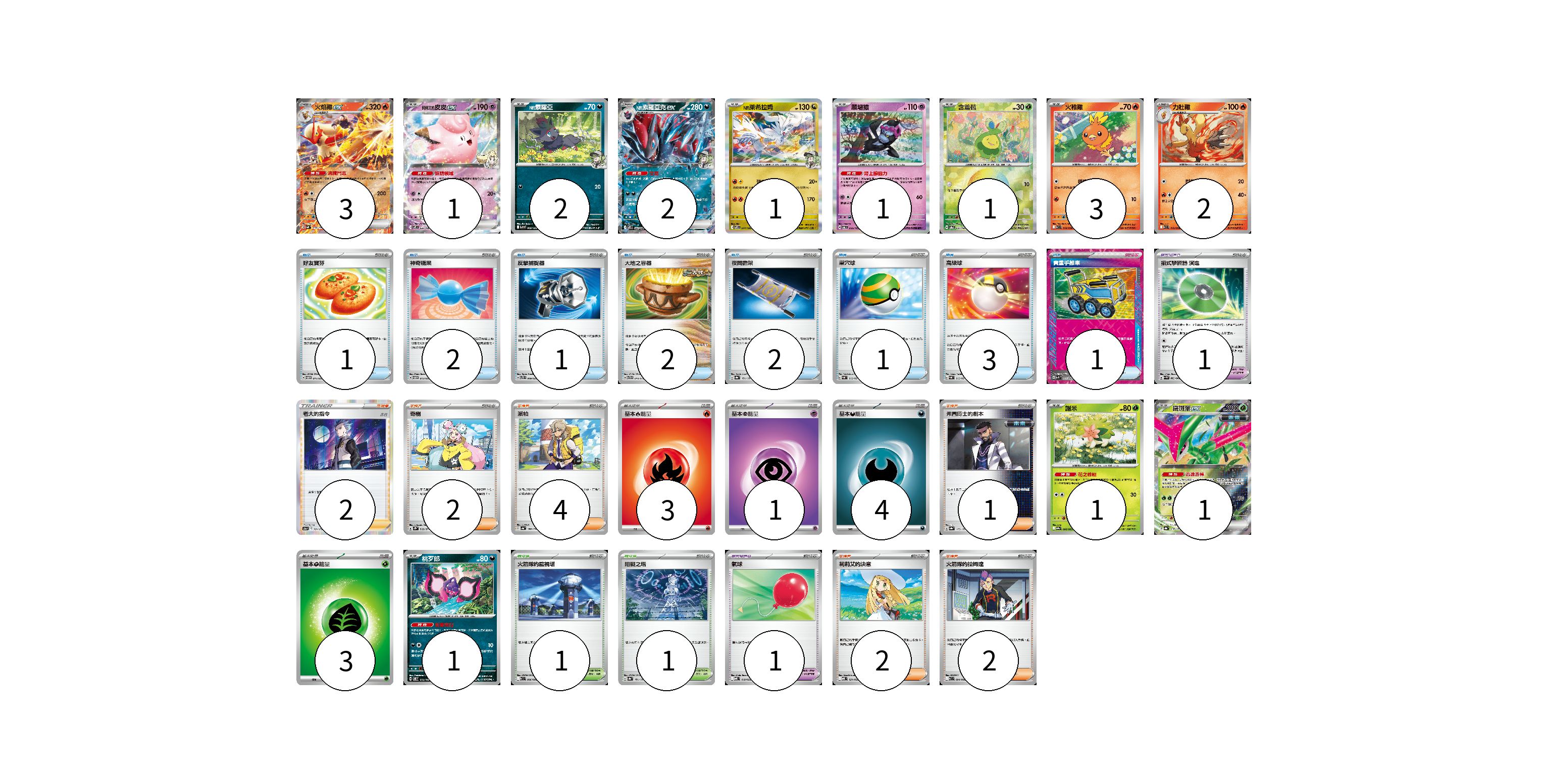 牌組構築方案 以此牌組為基礎新構築牌組 顯示卡面 顯示列表 寶可夢卡(19) 3 1 2 2 1 1 1 3 2 1 1 1 寶可夢道具(2) 1 1 物品卡(13) 1 2 1 2 2 1 3 1 支援者卡(13) 2 2 4 1 2 2 競技場卡(2) 1 1 能量卡(11) 3 1 4 3 寶可夢卡(19) 卡牌名稱 張數 卡牌名稱 張數 火焰雞ex SVM 016/175 03 莉莉艾的皮皮ex SV9 033/100 01 N的索羅亞 SV9 060/100 02 N的索羅亞克ex SV9 061/100 02 N的萊希拉姆 SV9 074/100 01 願增猿 SV6 055/101 01 含羞苞 SV8a 001/187 01 火稚雞 SV10 018/098 03 力壯雞 SV10 019/098 02 謝米 SV9a 006/063 01 鐵斑葉ex SV8a 016/187 01 桃歹郎 SV8 075/106 01 寶可夢道具(2) 卡牌名稱 張數 卡牌名稱 張數 招式學習器 演進 SV4M 063/066 01 氣球 MBD 018/022 01 物品卡(13) 卡牌名稱 張數 卡牌名稱 張數 好友寶芬 SVTM 011/022 01 神奇糖果 SVTM 013/022 02 反擊捕捉器 SVTS 009/022 01 大地之容器 SVTG 010/019 02 夜間擔架 SV8a 151/187 02 巢穴球 SVAL 012/021 01 高級球 SVAL 013/021 03 貴重手推車 SVK 020/042 01 支援者卡(13) 卡牌名稱 張數 卡牌名稱 張數 老大的指令(赤日) S12a 161/172 02 奇樹 SV2D 069/071 02 派帕 SV4a 180/190 04 弗圖博士的劇本 SV8a 175/187 01 莉莉艾的決意 MBD 021/022 02 火箭隊的拉姆達 SV10 094/098 02 競技場卡(2) 卡牌名稱 張數 卡牌名稱 張數 火箭隊的監視塔 SV10 096/098 01 阻礙之塔 SV8a 181/187 01 能量卡(11) 卡牌名稱 張數 卡牌名稱 張數 基本火能量 sv-p FIR 03 基本超能量 sv-p PSY 01 基本惡能量 sv-p DAR 04 基本【草】能量 M-P GRA 03 以此牌組為基礎新構築牌組 牌組編碼 nOZKRn-uKidfu-HMizUD copy 列印牌組單 牌組編碼已複製 分享至SNS