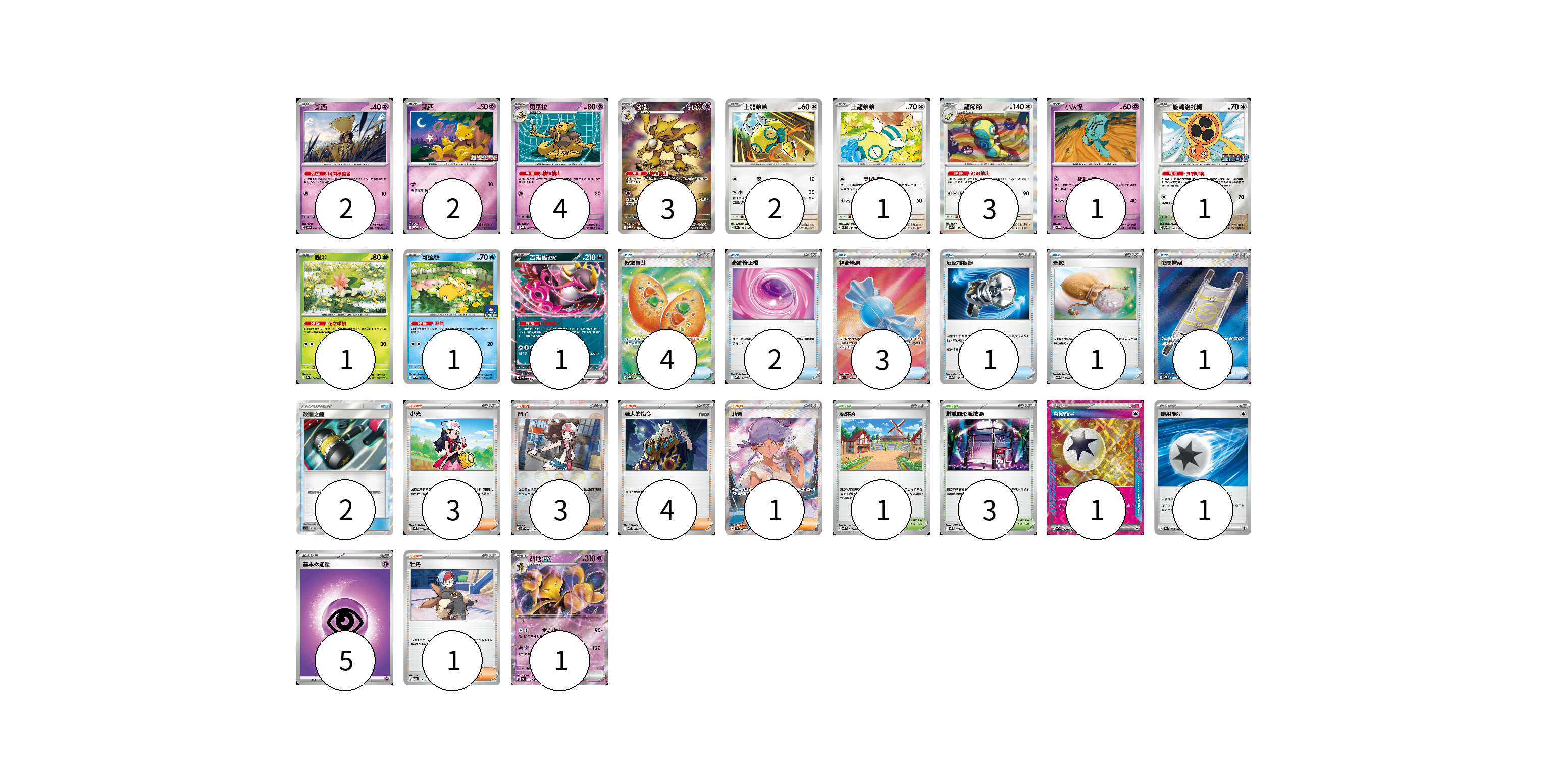 牌組構築方案 以此牌組為基礎新構築牌組 顯示卡面 顯示列表 寶可夢卡(23) 2 2 4 3 2 1 3 1 1 1 1 1 1 物品卡(14) 4 2 3 1 1 1 2 支援者卡(12) 3 3 4 1 1 競技場卡(4) 1 3 能量卡(7) 1 1 5 寶可夢卡(23) 卡牌名稱 張數 卡牌名稱 張數 凱西 SV6 047/101 02 凱西 M-P 004/M-P 02 勇基拉 M1S 037/063 04 胡地 M1S 071/063 03 土龍弟弟 SV8a 129/187 02 土龍弟弟 SVM 095/175 01 土龍節節 SV8a 130/187 03 小灰怪 SV11B 043/086 01 旋轉洛托姆 SV-P 146/SV-P 01 謝米 SV9a 006/063 01 可達鴨 SV-P 220/SV-P 01 吉雉雞ex SVOD 004/020 01 胡地ex SV4a 075/190 01 物品卡(14) 卡牌名稱 張數 卡牌名稱 張數 好友寶芬 M1S 081/063 04 奇跡修正檔 MBD 017/022 02 神奇糖果 M1S 082/063 03 反擊捕捉器 SV8a 139/187 01 聖灰 SV9a 056/063 01 夜間擔架 M1L 083/063 01 改造之錘 AS5a 177/184 02 支援者卡(12) 卡牌名稱 張數 卡牌名稱 張數 小光 M2 077/080 03 鬥子 SV11W 085/086 03 老大的指令 MBD 020/022 04 莉普 SV4M 087/066 01 牡丹 SV4a 182/190 01 競技場卡(4) 卡牌名稱 張數 卡牌名稱 張數 深缽鎮 SVK 039/042 01 對戰圓形競技場 M2 079/080 03 能量卡(7) 卡牌名稱 張數 卡牌名稱 張數 富裕能量 SV7a 064/064 01 噴射能量 SV8a 185/187 01 基本【超】能量 MBD PSY 05 以此牌組為基礎新構築牌組 牌組編碼 nPVkWZ-GZLNpf-dgYPdQ copy 列印牌組單 牌組編碼已複製 分享至SNS