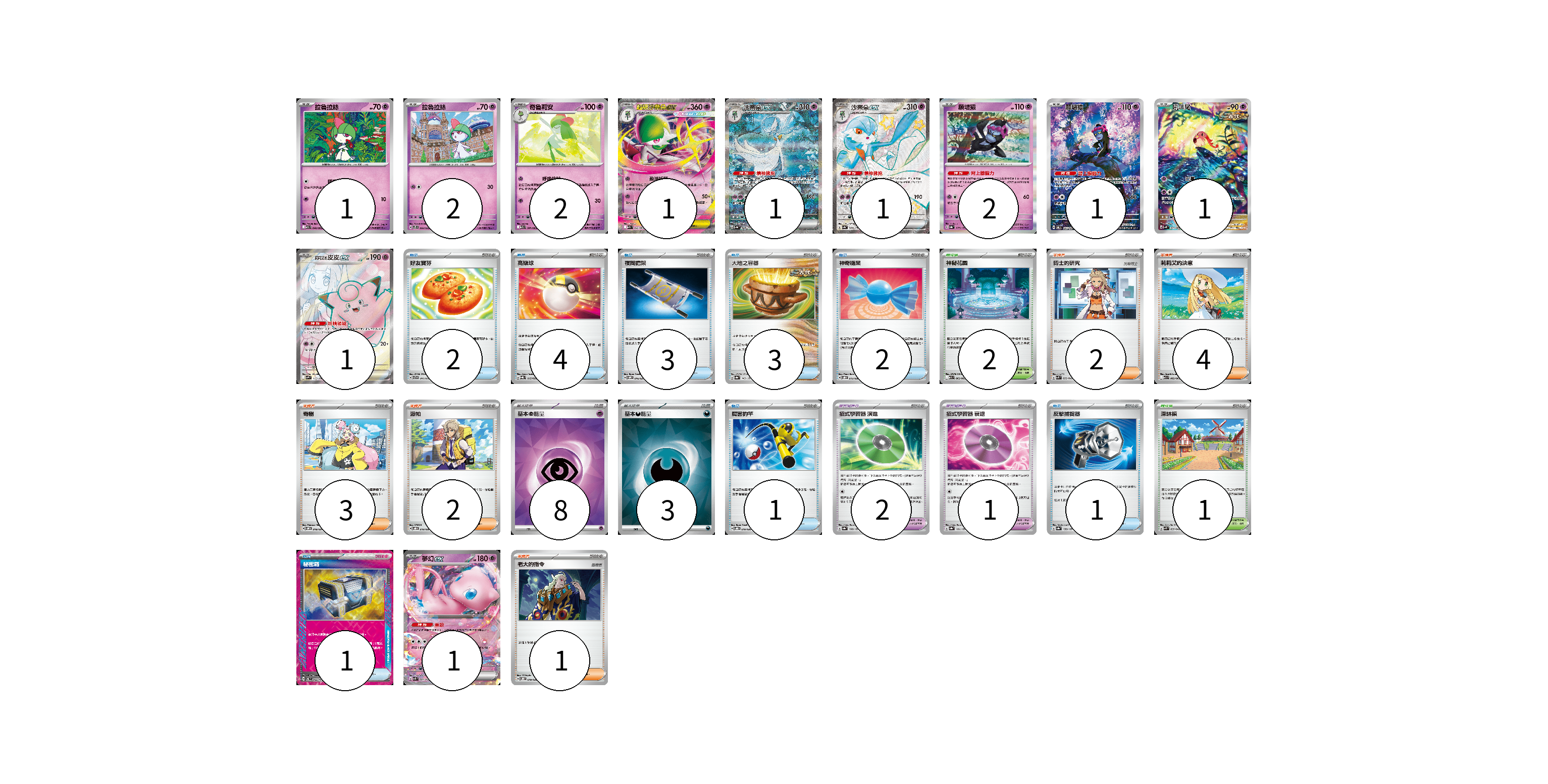 牌組構築方案 以此牌組為基礎新構築牌組 顯示卡面 顯示列表 寶可夢卡(14) 1 2 2 1 1 1 2 1 1 1 1 寶可夢道具(3) 2 1 物品卡(17) 2 4 3 3 2 1 1 1 支援者卡(12) 2 4 3 2 1 競技場卡(3) 2 1 能量卡(11) 8 3 寶可夢卡(14) 卡牌名稱 張數 卡牌名稱 張數 拉魯拉絲 M1S 040/063 01 拉魯拉絲 SVTS 002/022 02 奇魯莉安 M1S 041/063 02 超級沙奈朵ex M1S 042/063 01 沙奈朵ex SV4a 348/190 01 沙奈朵ex SV4a 328/190 01 願增猿 SV8a 075/187 02 願增猿 SV6 107/101 01 吼叫尾 SV4K 071/066 01 莉莉艾的皮皮ex SV9 115/100 01 夢幻ex SVK 001/042 01 寶可夢道具(3) 卡牌名稱 張數 卡牌名稱 張數 招式學習器 演進 SV8a 160/187 02 招式學習器 衰退 SV8a 161/187 01 物品卡(17) 卡牌名稱 張數 卡牌名稱 張數 好友寶芬 SVTG 011/019 02 高級球 SVQL 015/022 04 夜間擔架 SVOM 016/021 03 大地之容器 SV8a 143/187 03 神奇糖果 SVOD 013/020 02 厲害釣竿 SVOD 010/020 01 反擊捕捉器 SV8a 139/187 01 秘密箱 SV6 092/101 01 支援者卡(12) 卡牌名稱 張數 卡牌名稱 張數 博士的研究 SVK 032/042 02 莉莉艾的決意 M1L 062/063 04 奇樹 SVOM 018/021 03 派帕 SVOD 018/020 02 老大的指令 SVOD 019/020 01 競技場卡(3) 卡牌名稱 張數 卡牌名稱 張數 神秘花園 M1S 063/063 02 深缽鎮 SVK 039/042 01 能量卡(11) 卡牌名稱 張數 卡牌名稱 張數 基本【超】能量 SVOD PSY 08 基本【惡】能量 SVOM DAR 03 以此牌組為基礎新構築牌組 牌組編碼 nPxElK-uSUlJM-VslPCe copy 列印牌組單 牌組編碼已複製 分享至SNS
