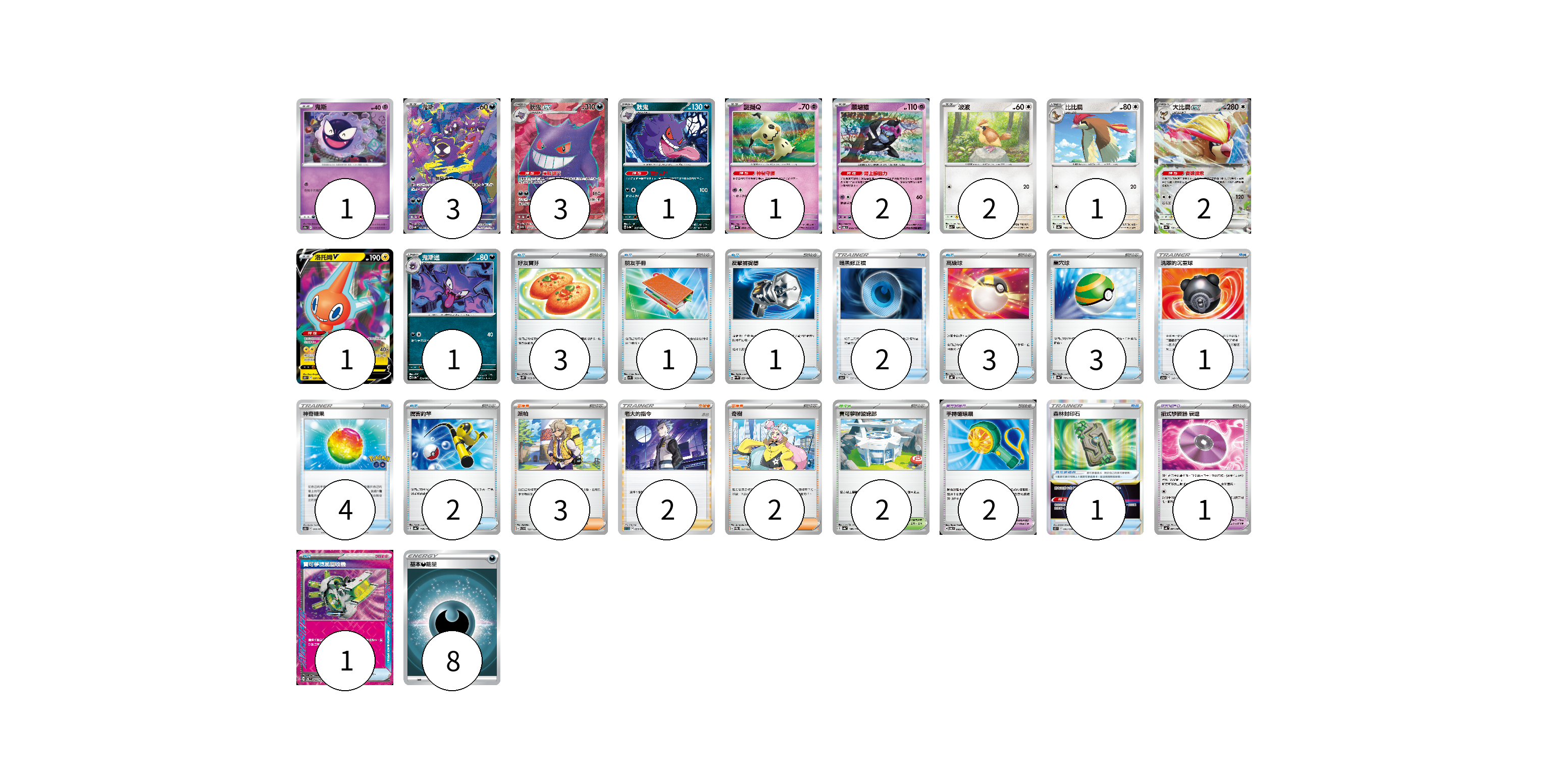 牌組構築方案 以此牌組為基礎新構築牌組 顯示卡面 顯示列表 寶可夢卡(18) 1 3 3 1 1 2 2 1 2 1 1 寶可夢道具(4) 2 1 1 物品卡(21) 3 1 1 2 3 3 1 4 2 1 支援者卡(7) 3 2 2 競技場卡(2) 2 能量卡(8) 8 寶可夢卡(18) 卡牌名稱 張數 卡牌名稱 張數 鬼斯 S10a 021/071 01 鬼斯 SV5K 080/071 03 耿鬼ex SV5K 088/071 03 耿鬼 SV3a 035/062 01 謎擬Q SV4a 088/190 01 願增猿 SV6 055/101 02 波波 SV3 087/108 02 比比鳥 SV4a 138/190 01 大比鳥ex SV4a 139/190 02 洛托姆V S11 037/100 01 鬼斯通 SV3a 034/062 01 寶可夢道具(4) 卡牌名稱 張數 卡牌名稱 張數 手持循環扇 SV6 095/101 02 森林封印石 S12 092/098 01 招式學習器 衰退 SV4K 063/066 01 物品卡(21) 卡牌名稱 張數 卡牌名稱 張數 好友寶芬 SV5K 063/071 03 朋友手冊 SV1S 069/078 01 反擊捕捉器 SV4M 059/066 01 暗黑修正檔 S12a 135/172 02 高級球 SVHK 013/022 03 巢穴球 SV4a 159/190 03 洗翠的沉重球 S12a 140/172 01 神奇糖果 S10b 066/071 04 厲害釣竿 SV4a 158/190 02 寶可夢旋風回收機 SV6 093/101 01 支援者卡(7) 卡牌名稱 張數 卡牌名稱 張數 派帕 SVD 137/139 03 老大的指令(赤日) SLD 020/020 02 奇樹 SVEM 017/020 02 競技場卡(2) 卡牌名稱 張數 卡牌名稱 張數 寶可夢聯盟總部 SV4a 186/190 02 能量卡(8) 卡牌名稱 張數 卡牌名稱 張數 基本【惡】能量 SI DAR 08 以此牌組為基礎新構築牌組 牌組編碼 nQCpEF-xnyUQS-RtlCIH copy 列印牌組單 牌組編碼已複製 分享至SNS
