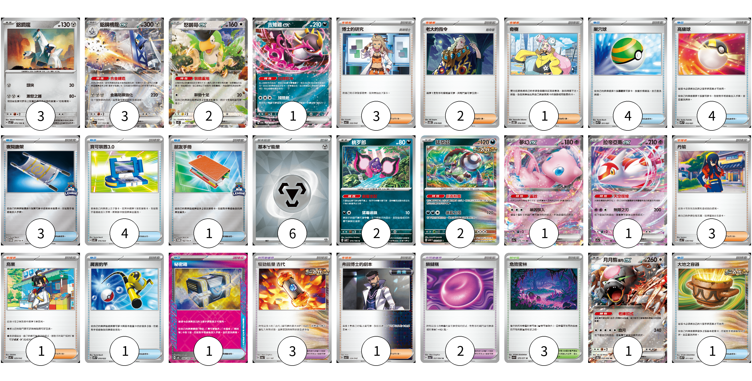 牌組構築方案 以此牌組為基礎新構築牌組 顯示卡面 顯示列表 寶可夢卡(16) 3 3 2 1 2 2 1 1 1 寶可夢道具(5) 3 2 物品卡(19) 4 4 3 4 1 1 1 1 支援者卡(11) 3 2 1 3 1 1 競技場卡(3) 3 能量卡(6) 6 寶可夢卡(16) 卡牌名稱 張數 卡牌名稱 張數 鋁鋼龍 SV7 072/102 03 鋁鋼橋龍ex SV7a 037/064 03 怒鸚哥ex SV2P 065/071 02 吉雉雞ex SV6a 038/064 01 桃歹郎 SV8 075/106 02 猛惡菇 SV4K 053/066 02 夢幻ex SV4a 076/190 01 拉帝亞斯ex SV7a 019/064 01 月月熊 赫月 ex SV5a 052/066 01 寶可夢道具(5) 卡牌名稱 張數 卡牌名稱 張數 驅勁能量 古代 SV8a 157/187 03 鎖鏈糬 SV6a 057/064 02 物品卡(19) 卡牌名稱 張數 卡牌名稱 張數 巢穴球 SVTL 011/021 04 高級球 SVTL 012/021 04 夜間擔架 SV-P 204/SV-P 03 寶可裝置3.0 SVAW 016/023 04 朋友手冊 SV-P 182/SV-P 01 厲害釣竿 SVTS 010/022 01 秘密箱 SV6 092/101 01 大地之容器 SVTS 011/022 01 支援者卡(11) 卡牌名稱 張數 卡牌名稱 張數 博士的研究 SVK 032/042 03 老大的指令 SVOD 019/020 02 奇樹 SVOD 016/020 01 丹瑜 SVK 030/042 03 烏栗 SVK 029/042 01 弗圖博士的劇本 SVK 034/042 01 競技場卡(3) 卡牌名稱 張數 卡牌名稱 張數 危險密林 SV5K 070/071 03 能量卡(6) 卡牌名稱 張數 卡牌名稱 張數 基本【鋼】能量 SVOD MET 06 以此牌組為基礎新構築牌組 牌組編碼 nQJExX-ohuBCP-riUGOv copy 列印牌組單 牌組編碼已複製 分享至SNS