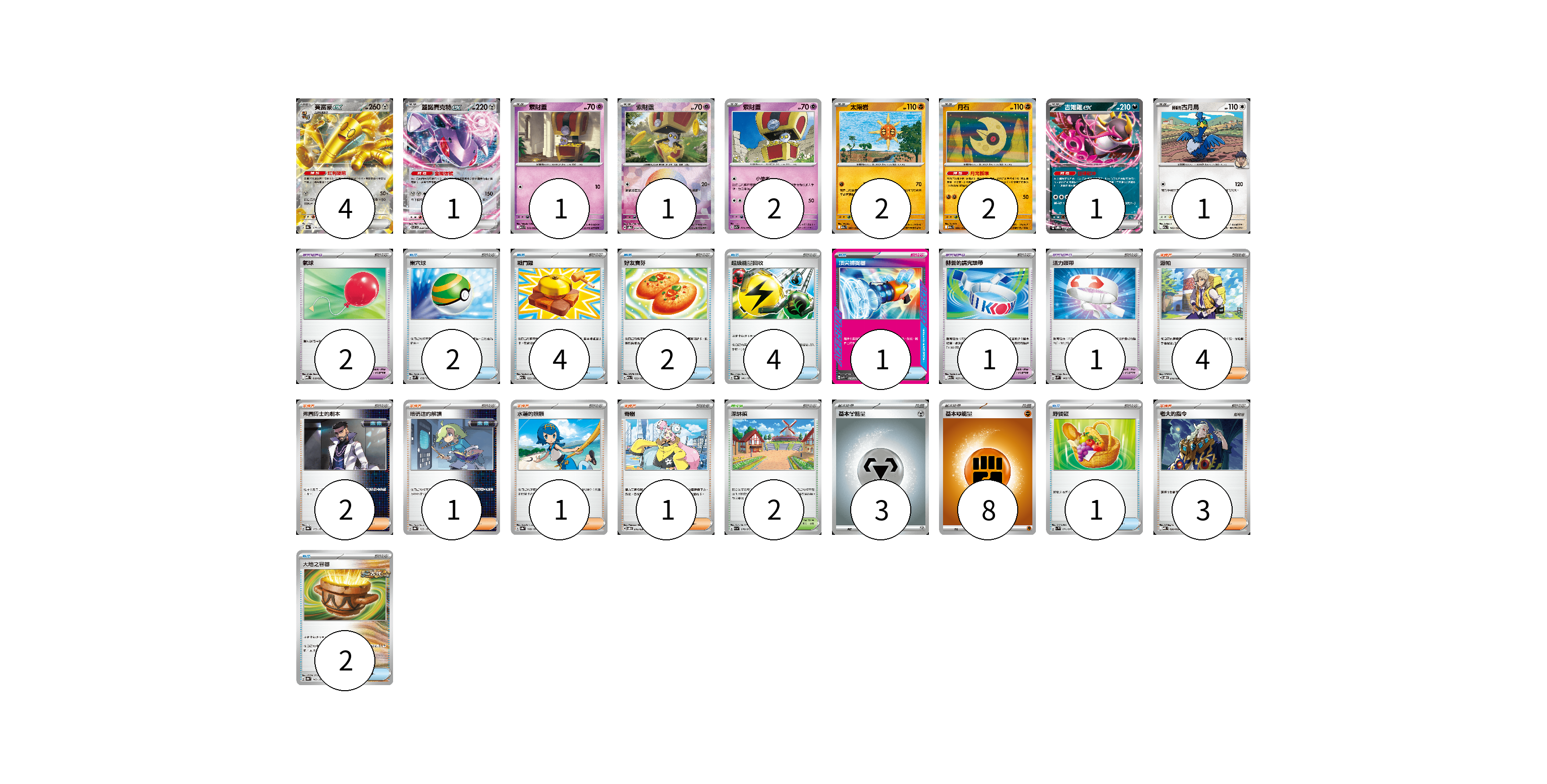 牌組構築方案 以此牌組為基礎新構築牌組 顯示卡面 顯示列表 寶可夢卡(15) 4 1 1 1 2 2 2 1 1 寶可夢道具(4) 2 1 1 物品卡(16) 2 4 2 4 1 1 2 支援者卡(12) 4 2 1 1 1 3 競技場卡(2) 2 能量卡(11) 3 8 寶可夢卡(15) 卡牌名稱 張數 卡牌名稱 張數 賽富豪ex SV8a 117/187 04 蓋諾賽克特ex SV11B 069/086 01 索財靈 M1L 019/063 01 索財靈 SV8a 073/187 01 索財靈 SV7a 024/064 02 太陽岩 M2a 087/193 02 月石 M2a 086/193 02 吉雉雞ex SVOD 004/020 01 赫普的古月鳥 M2a 143/193 01 寶可夢道具(4) 卡牌名稱 張數 卡牌名稱 張數 氣球 MBD 018/022 02 赫普的講究頭帶 M2a 167/193 01 活力頭帶 SVM 140/175 01 物品卡(16) 卡牌名稱 張數 卡牌名稱 張數 巢穴球 SVM 133/175 02 戰鬥鑼 M2a 155/193 04 好友寶芬 M2a 153/193 02 超級能量回收 SV8a 141/187 04 頂尖捕捉器 MBG 014/022 01 野餐籃 SV1V 071/078 01 大地之容器 SV8a 143/187 02 支援者卡(12) 卡牌名稱 張數 卡牌名稱 張數 派帕 SVOD 018/020 04 弗圖博士的劇本 SV8a 175/187 02 暗碼迷的解讀 SV8a 165/187 01 水蓮的照顧 SV8a 168/187 01 奇樹 SVOD 016/020 01 老大的指令 MBD 020/022 03 競技場卡(2) 卡牌名稱 張數 卡牌名稱 張數 深缽鎮 SV1a 070/073 02 能量卡(11) 卡牌名稱 張數 卡牌名稱 張數 基本【鋼】能量 M-P MET 03 基本【鬥】能量 M-P FIG 08 以此牌組為基礎新構築牌組 牌組編碼 nQQMRn-DVmCul-cdWIbl copy 列印牌組單 牌組編碼已複製 分享至SNS