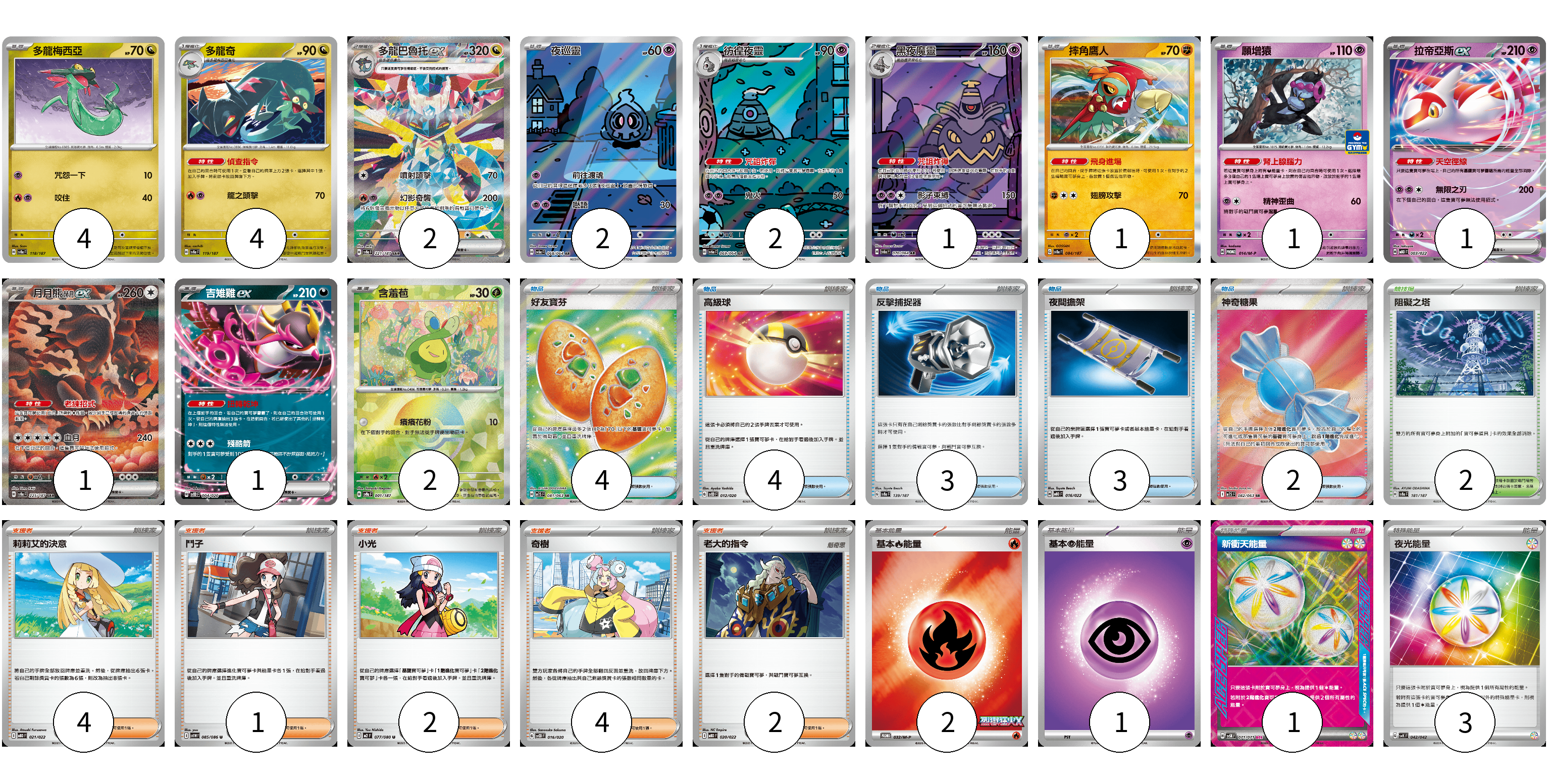 牌組構築方案 以此牌組為基礎新構築牌組 顯示卡面 顯示列表 寶可夢卡(22) 4 4 2 2 2 1 1 1 1 1 1 2 物品卡(16) 4 4 3 3 2 支援者卡(13) 4 1 2 4 2 競技場卡(2) 2 能量卡(7) 2 1 1 3 寶可夢卡(22) 卡牌名稱 張數 卡牌名稱 張數 多龍梅西亞 SV8a 118/187 04 多龍奇 SV8a 119/187 04 多龍巴魯托ex SV8a 221/187 02 夜巡靈 SV6a 068/064 02 彷徨夜靈 SV6a 069/064 02 黑夜魔靈 SV6a 070/064 01 摔角鷹人 SV8a 084/187 01 願增猿 M-P 014/M-P 01 拉帝亞斯ex MBD 003/022 01 月月熊 赫月ex SV8a 225/187 01 吉雉雞ex SVOD 004/020 01 含羞苞 SV8a 001/187 02 物品卡(16) 卡牌名稱 張數 卡牌名稱 張數 好友寶芬 M1S 081/063 04 高級球 SVOD 012/020 04 反擊捕捉器 SV8a 139/187 03 夜間擔架 MBD 016/022 03 神奇糖果 M1S 082/063 02 支援者卡(13) 卡牌名稱 張數 卡牌名稱 張數 莉莉艾的決意 MBD 021/022 04 鬥子 SV11W 085/086 01 小光 M2 077/080 02 奇樹 SVOD 016/020 04 老大的指令 MBD 020/022 02 競技場卡(2) 卡牌名稱 張數 卡牌名稱 張數 阻礙之塔 SV8a 181/187 02 能量卡(7) 卡牌名稱 張數 卡牌名稱 張數 基本【火】能量 M-P 032/M-P 02 基本【超】能量 MBD PSY 01 新衝天能量 SV5K 071/071 01 夜光能量 SVK 042/042 03 以此牌組為基礎新構築牌組 牌組編碼 nRnlUt-mfkdho-PKKqNp copy 列印牌組單 牌組編碼已複製 分享至SNS