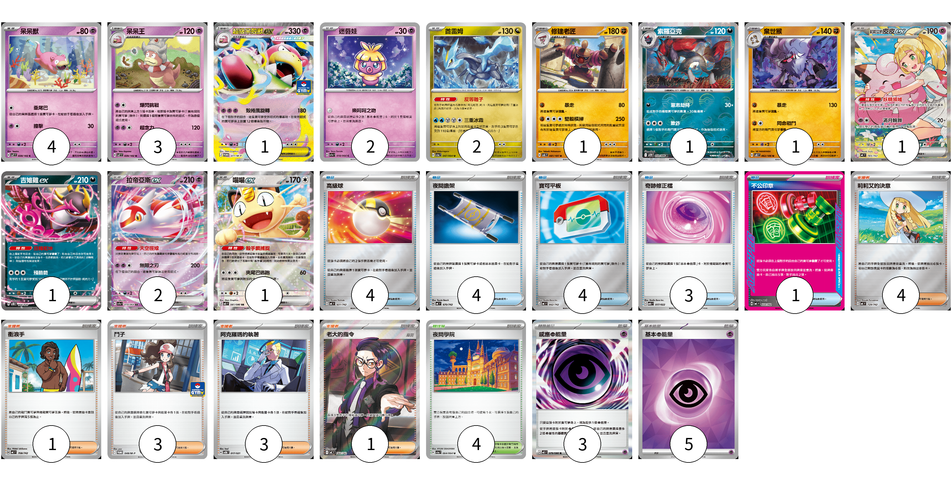 牌組構築方案 以此牌組為基礎新構築牌組 顯示卡面 顯示列表 寶可夢卡(20) 4 3 1 2 2 1 1 1 1 1 2 1 物品卡(16) 4 4 4 3 1 支援者卡(12) 4 1 3 3 1 競技場卡(4) 4 能量卡(8) 3 5 寶可夢卡(20) 卡牌名稱 張數 卡牌名稱 張數 呆呆獸 SV7 038/102 04 呆呆王 SV7 039/102 03 超級呆殼獸ex M-P 077/M-P 01 迷唇娃 SV7a 018/064 02 酋雷姆 SV6a 047/064 02 修建老匠 SV6 061/101 01 索羅亞克 SV11W 059/086 01 棄世猴 SV8 062/106 01 莉莉艾的皮皮ex MC 765/742 01 吉雉雞ex SVOD 004/020 01 拉帝亞斯ex SV7a 019/064 02 喵喵ex M3 061/080 01 物品卡(16) 卡牌名稱 張數 卡牌名稱 張數 高級球 MC 651/742 04 夜間擔架 MC 670/742 04 寶可平板 MC 662/742 04 奇跡修正檔 MBD 017/022 03 不公印章 MC 633/742 01 支援者卡(12) 卡牌名稱 張數 卡牌名稱 張數 莉莉艾的決意 MC 729/742 04 衝浪手 MC 708/742 01 鬥子 M-P 048/M-P 03 阿克羅瑪的執著 SVOM 017/021 03 老大的指令(烏羽) MC 760/742 01 競技場卡(4) 卡牌名稱 張數 卡牌名稱 張數 夜間學院 SV6a 064/064 04 能量卡(8) 卡牌名稱 張數 卡牌名稱 張數 感應【超】能量 M3 079/080 03 基本【超】能量 SVM PSY 05 以此牌組為基礎新構築牌組 牌組編碼 nTpaFa-JWWiuw-uLfaCV copy 列印牌組單 牌組編碼已複製 分享至SNS