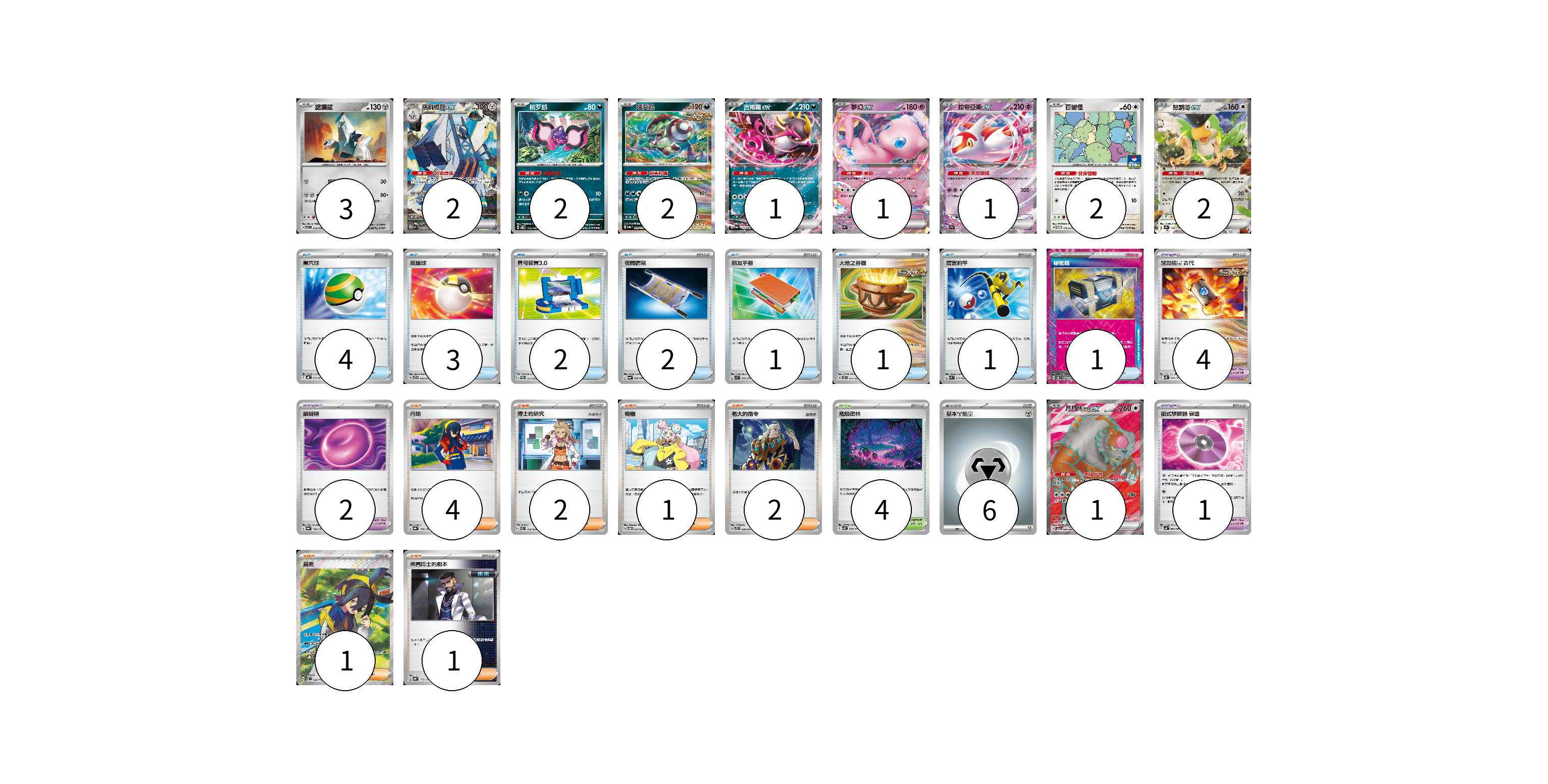 牌組構築方案 以此牌組為基礎新構築牌組 顯示卡面 顯示列表 寶可夢卡(17) 3 2 2 2 1 1 1 2 2 1 寶可夢道具(7) 4 2 1 物品卡(15) 4 3 2 2 1 1 1 1 支援者卡(11) 4 2 1 2 1 1 競技場卡(4) 4 能量卡(6) 6 寶可夢卡(17) 卡牌名稱 張數 卡牌名稱 張數 鋁鋼龍 SV7 072/102 03 鋁鋼橋龍ex SV7a 088/064 02 桃歹郎 SV8 075/106 02 猛惡菇 SV8a 099/187 02 吉雉雞ex SV6a 038/064 01 夢幻ex SVK 001/042 01 拉帝亞斯ex SV7a 019/064 01 百變怪 SV-P 111/SV-P 02 怒鸚哥ex SV4a 154/190 02 月月熊 赫月 ex SV5a 084/066 01 寶可夢道具(7) 卡牌名稱 張數 卡牌名稱 張數 驅勁能量 古代 SV5K 065/071 04 鎖鏈糬 SV8a 154/187 02 招式學習器 衰退 SV4K 063/066 01 物品卡(15) 卡牌名稱 張數 卡牌名稱 張數 巢穴球 SVHK 012/022 04 高級球 SVTG 013/019 03 寶可裝置3.0 SVEM 014/020 02 夜間擔架 SV6a 056/064 02 朋友手冊 SV1S 069/078 01 大地之容器 SVTS 011/022 01 厲害釣竿 SVK 011/042 01 秘密箱 SV6 092/101 01 支援者卡(11) 卡牌名稱 張數 卡牌名稱 張數 丹瑜 SV8a 170/187 04 博士的研究 SVEL 018/020 02 奇樹 SVTM 017/022 01 老大的指令 SVTS 020/022 02 烏栗 SV6 122/101 01 弗圖博士的劇本 SV8a 175/187 01 競技場卡(4) 卡牌名稱 張數 卡牌名稱 張數 危險密林 SV5K 070/071 04 能量卡(6) 卡牌名稱 張數 卡牌名稱 張數 基本鋼能量 sv-p MET 06 以此牌組為基礎新構築牌組 牌組編碼 nTwEHA-fwZsVc-VCcsas copy 列印牌組單 牌組編碼已複製 分享至SNS