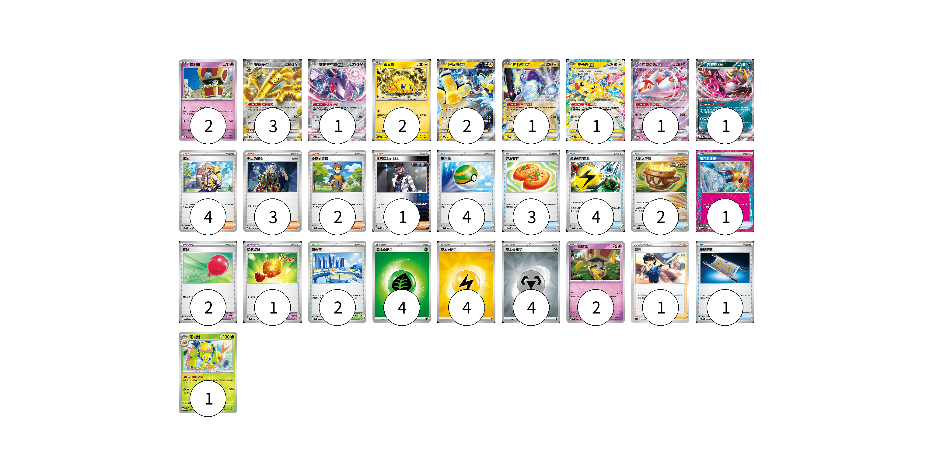 牌組構築方案 以此牌組為基礎新構築牌組 顯示卡面 顯示列表 寶可夢卡(17) 2 3 1 2 2 1 1 1 1 2 1 寶可夢道具(3) 2 1 物品卡(15) 4 3 4 2 1 1 支援者卡(11) 4 3 2 1 1 競技場卡(2) 2 能量卡(12) 4 4 4 寶可夢卡(17) 卡牌名稱 張數 卡牌名稱 張數 索財靈 SV7a 024/064 02 賽富豪ex SV8a 117/187 03 蓋諾賽克特ex SV11B 069/086 01 電電蟲 SV7 032/102 02 鐵臂膀ex SV8a 054/187 02 密勒頓ex SV1V 037/078 01 皮卡丘ex SV8 033/106 01 拉帝亞斯ex SV7a 019/064 01 吉雉雞ex SV8a 104/187 01 索財靈 SV8a 073/187 02 電蜘蛛 SV6a 002/064 01 寶可夢道具(3) 卡牌名稱 張數 卡牌名稱 張數 氣球 SV11B 082/086 02 勇氣護符 SVM 142/175 01 物品卡(15) 卡牌名稱 張數 卡牌名稱 張數 巢穴球 SVM 133/175 04 好友寶芬 SVOD 011/020 03 超級能量回收 SVK 010/042 04 大地之容器 SV8a 143/187 02 頂尖捕捉器 SV8a 148/187 01 夜間擔架 SVOM 016/021 01 支援者卡(11) 卡牌名稱 張數 卡牌名稱 張數 派帕 SVOD 018/020 04 老大的指令 SVOD 019/020 03 小剛的發掘 SV9 096/100 02 弗圖博士的劇本 SV8a 175/187 01 裁判 SDL 018/021 01 競技場卡(2) 卡牌名稱 張數 卡牌名稱 張數 釀光市 SV9 098/100 02 能量卡(12) 卡牌名稱 張數 卡牌名稱 張數 基本【草】能量 M-P GRA 04 基本【雷】能量 SVQP LIG 04 基本【鋼】能量 SVOD MET 04 以此牌組為基礎新構築牌組 牌組編碼 nTxqXS-MRUAHD-lRsjFF copy 列印牌組單 牌組編碼已複製 分享至SNS