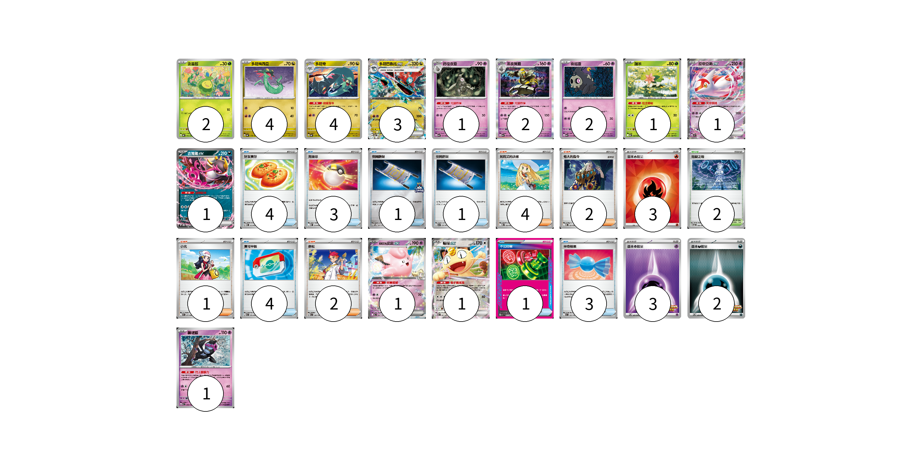 牌組構築方案 以此牌組為基礎新構築牌組 顯示卡面 顯示列表 寶可夢卡(24) 2 4 4 3 1 2 2 1 1 1 1 1 1 物品卡(17) 4 3 1 1 4 1 3 支援者卡(9) 4 2 1 2 競技場卡(2) 2 能量卡(8) 3 3 2 寶可夢卡(24) 卡牌名稱 張數 卡牌名稱 張數 含羞苞 SV8a 001/187 02 多龍梅西亞 SV8a 118/187 04 多龍奇 SV8a 119/187 04 多龍巴魯托ex SV6 081/101 03 彷徨夜靈 SV6a 019/064 01 黑夜魔靈 SV6a 020/064 02 夜巡靈 SV6a 018/064 02 謝米 SV9a 006/063 01 拉帝亞斯ex SV7a 019/064 01 吉雉雞ex SVOM 009/021 01 莉莉艾的皮皮ex MC 287/742 01 喵喵ex M3 061/080 01 願增猿 MC 358/742 01 物品卡(17) 卡牌名稱 張數 卡牌名稱 張數 好友寶芬 MBD 013/022 04 高級球 MBD 014/022 03 夜間擔架 SV-P 204/SV-P 01 夜間擔架 SV6a 056/064 01 寶可平板 M3 070/080 04 不公印章 MBD 011/022 01 神奇糖果 MC 655/742 03 支援者卡(9) 卡牌名稱 張數 卡牌名稱 張數 莉莉艾的決意 MBG 022/022 04 老大的指令 MBG 021/022 02 小光 M2 077/080 01 赤松 MC 696/742 02 競技場卡(2) 卡牌名稱 張數 卡牌名稱 張數 阻礙之塔 SV6 100/101 02 能量卡(8) 卡牌名稱 張數 卡牌名稱 張數 基本【火】能量 SVQL FIR 03 基本【超】能量 SV-P 261/SV-P 03 基本【惡】能量 SV-P 263/SV-P 02 以此牌組為基礎新構築牌組 牌組編碼 nULAik-ITxcAU-IAJQBM copy 列印牌組單 牌組編碼已複製 分享至SNS
