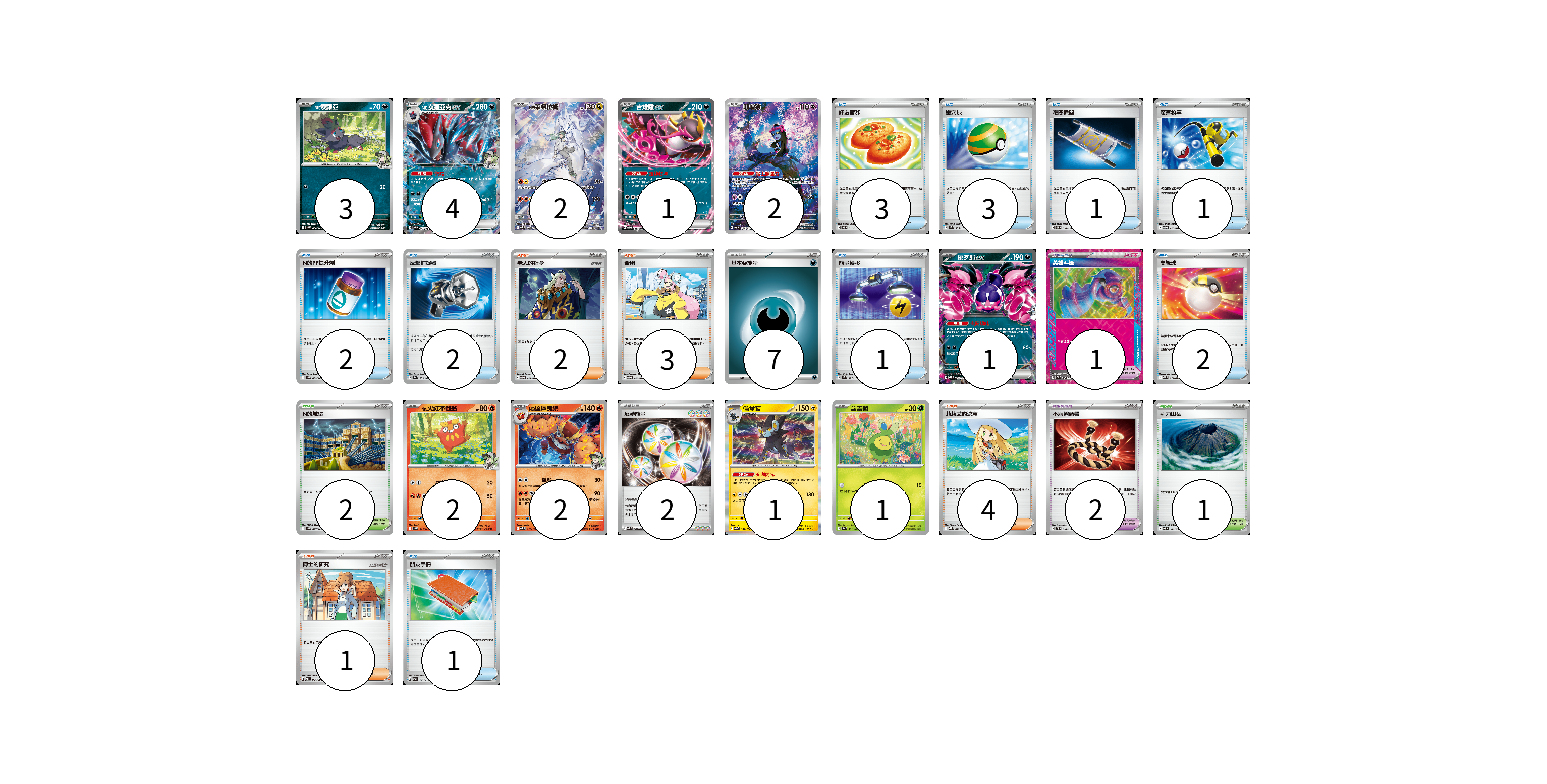 牌組構築方案 以此牌組為基礎新構築牌組 顯示卡面 顯示列表 寶可夢卡(19) 3 4 2 1 2 1 2 2 1 1 寶可夢道具(3) 1 2 物品卡(16) 3 3 1 1 2 2 1 2 1 支援者卡(10) 2 3 4 1 競技場卡(3) 2 1 能量卡(9) 7 2 寶可夢卡(19) 卡牌名稱 張數 卡牌名稱 張數 N的索羅亞 SV9 060/100 03 N的索羅亞克ex SV9 061/100 04 N的萊希拉姆 SV9 109/100 02 吉雉雞ex SVOD 004/020 01 願增猿 SV6 107/101 02 桃歹郎ex MBG 009/022 01 N的火紅不倒翁 SV9 015/100 02 N的達摩狒狒 SV9 016/100 02 倫琴貓 SV4a 061/190 01 含羞苞 SV8a 001/187 01 寶可夢道具(3) 卡牌名稱 張數 卡牌名稱 張數 英雄斗篷 SV5M 064/071 01 不服輸頭帶 SVTL 016/021 02 物品卡(16) 卡牌名稱 張數 卡牌名稱 張數 好友寶芬 SVOD 011/020 03 巢穴球 SVM 133/175 03 夜間擔架 SVOM 016/021 01 厲害釣竿 SVOD 010/020 01 N的PP提升劑 SV9 089/100 02 反擊捕捉器 SV8a 139/187 02 能量轉移 SVM 127/175 01 高級球 MBD 014/022 02 朋友手冊 SVK 014/042 01 支援者卡(10) 卡牌名稱 張數 卡牌名稱 張數 老大的指令 SVOD 019/020 02 奇樹 SVOD 016/020 03 莉莉艾的決意 MBG 022/022 04 博士的研究 SV11B 084/086 01 競技場卡(3) 卡牌名稱 張數 卡牌名稱 張數 N的城堡 SV9 097/100 02 引力山岳 SV8 106/106 01 能量卡(9) 卡牌名稱 張數 卡牌名稱 張數 基本惡能量 sv-p DAR 07 反轉能量 SVK 041/042 02 以此牌組為基礎新構築牌組 牌組編碼 nWhdTu-TskatM-nXgHFE copy 列印牌組單 牌組編碼已複製 分享至SNS