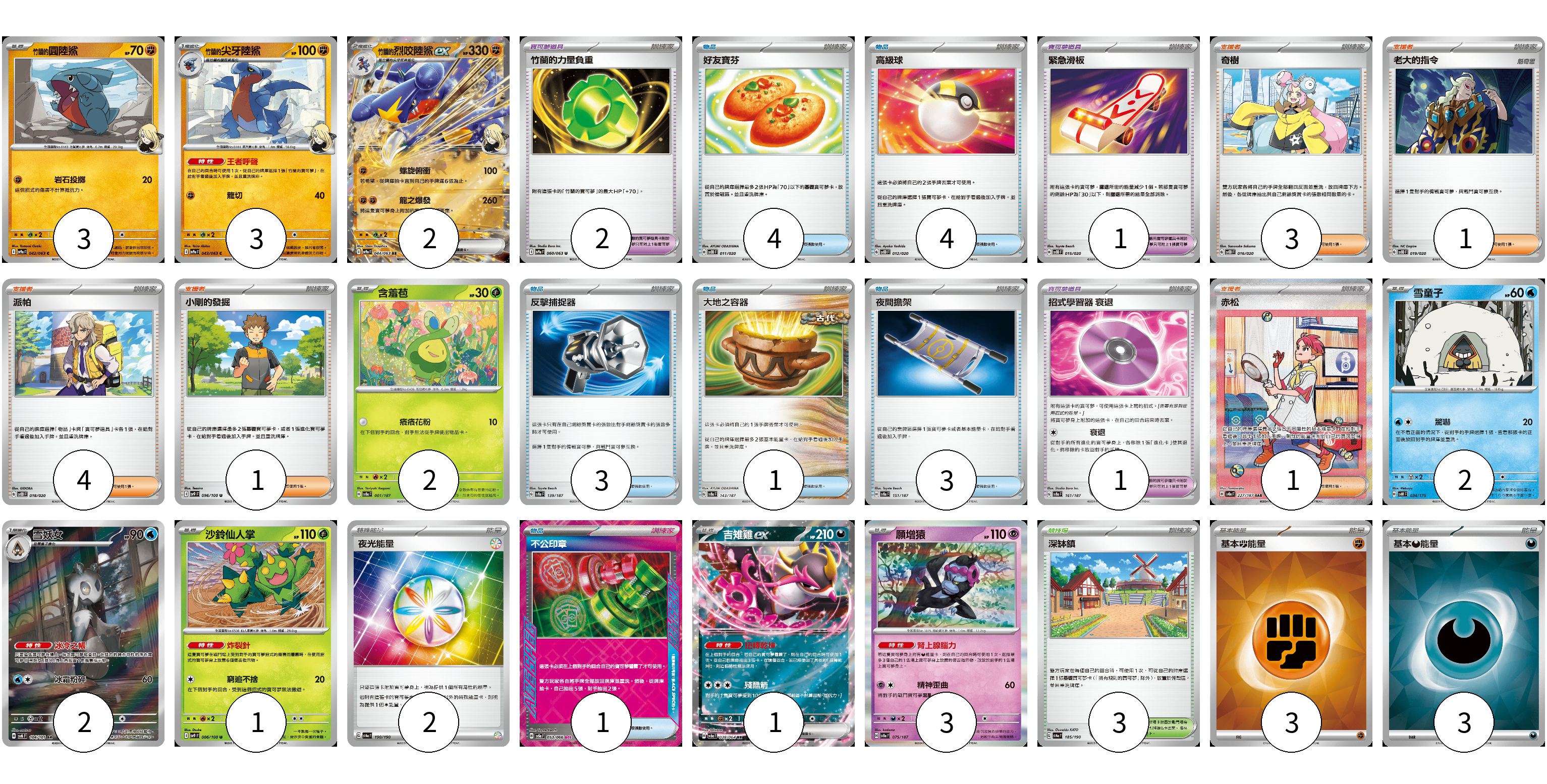 牌組構築方案 以此牌組為基礎新構築牌組 顯示卡面 顯示列表 寶可夢卡(19) 3 3 2 2 2 2 1 1 3 寶可夢道具(4) 2 1 1 物品卡(16) 4 4 3 1 3 1 支援者卡(10) 3 1 4 1 1 競技場卡(3) 3 能量卡(8) 2 3 3 寶可夢卡(19) 卡牌名稱 張數 卡牌名稱 張數 <竹蘭的>圓陸鯊 SV9a 042/063 03 <竹蘭的>尖牙陸鯊 SV9a 043/063 03 <竹蘭的>烈咬陸鯊ex SV9a 044/063 02 含羞苞 SV8a 001/187 02 雪童子 SVM 034/175 02 雪妖女 SV6 104/101 02 沙鈴仙人掌 SV9 006/100 01 吉雉雞ex SV6a 038/064 01 願增猿 SV8a 075/187 03 寶可夢道具(4) 卡牌名稱 張數 卡牌名稱 張數 竹蘭的力量負重 SV9a 060/063 02 緊急滑板 SVOD 015/020 01 招式學習器 衰退 SV8a 161/187 01 物品卡(16) 卡牌名稱 張數 卡牌名稱 張數 好友寶芬 SVOD 011/020 04 高級球 SVOD 012/020 04 反擊捕捉器 SV8a 139/187 03 大地之容器 SV8a 143/187 01 夜間擔架 SV8a 151/187 03 不公印章 SV5a 053/066 01 支援者卡(10) 卡牌名稱 張數 卡牌名稱 張數 奇樹 SVOD 016/020 03 老大的指令 SVOD 019/020 01 派帕 SVOD 018/020 04 小剛的發掘 SV9 096/100 01 赤松 SV8a 227/187 01 競技場卡(3) 卡牌名稱 張數 卡牌名稱 張數 深缽鎮 SV4a 185/190 03 能量卡(8) 卡牌名稱 張數 卡牌名稱 張數 夜光能量 SV4a 190/190 02 基本【鬥】能量 SVK FIG 03 基本【惡】能量 SVK DAR 03 以此牌組為基礎新構築牌組 牌組編碼 nWwyOg-hZHwCP-CiPySo copy 列印牌組單 牌組編碼已複製 分享至SNS