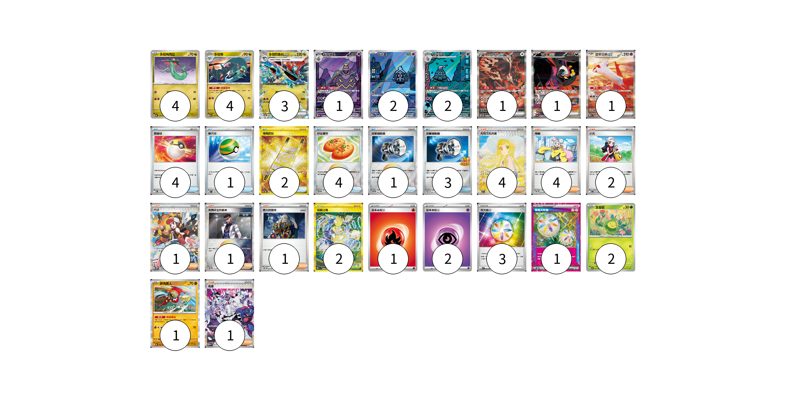 牌組構築方案 以此牌組為基礎新構築牌組 顯示卡面 顯示列表 寶可夢卡(22) 4 4 3 1 2 2 1 1 1 2 1 物品卡(15) 4 1 2 4 1 3 支援者卡(14) 4 4 2 1 1 1 1 競技場卡(2) 2 能量卡(7) 1 2 3 1 寶可夢卡(22) 卡牌名稱 張數 卡牌名稱 張數 多龍梅西亞 SV8a 118/187 04 多龍奇 SV8a 119/187 04 多龍巴魯托ex SV6 081/101 03 黑夜魔靈 SV6a 070/064 01 夜巡靈 SV6a 068/064 02 彷徨夜靈 SV6a 069/064 02 月月熊 赫月ex SV8a 225/187 01 吉雉雞ex SV6a 089/064 01 拉帝亞斯ex SV7a 087/064 01 含羞苞 SV8a 001/187 02 摔角鷹人 SV8a 084/187 01 物品卡(15) 卡牌名稱 張數 卡牌名稱 張數 高級球 MBD 014/022 04 巢穴球 SVM 133/175 01 夜間擔架 SV8 137/106 02 好友寶芬 SV8a 147/187 04 反擊捕捉器 SV8a 139/187 01 反擊捕捉器 SV-P 083/SV-P 03 支援者卡(14) 卡牌名稱 張數 卡牌名稱 張數 莉莉艾的決意 M1L 091/063 04 奇樹 SVOD 016/020 04 小光 M2 077/080 02 鬥子 SV11W 173/086 01 弗圖博士的劇本 SV8a 175/187 01 老大的指令 SVOM 020/021 01 枇琶 SV5K 096/071 01 競技場卡(2) 卡牌名稱 張數 卡牌名稱 張數 阻礙之塔 SV10 132/098 02 能量卡(7) 卡牌名稱 張數 卡牌名稱 張數 基本火能量 sv-p FIR 01 基本超能量 sv-p PSY 02 夜光能量 SVK 042/042 03 新衝天能量 SV5K 071/071 01 以此牌組為基礎新構築牌組 牌組編碼 nYGRgY-wUFHjt-cnotNl copy 列印牌組單 牌組編碼已複製 分享至SNS