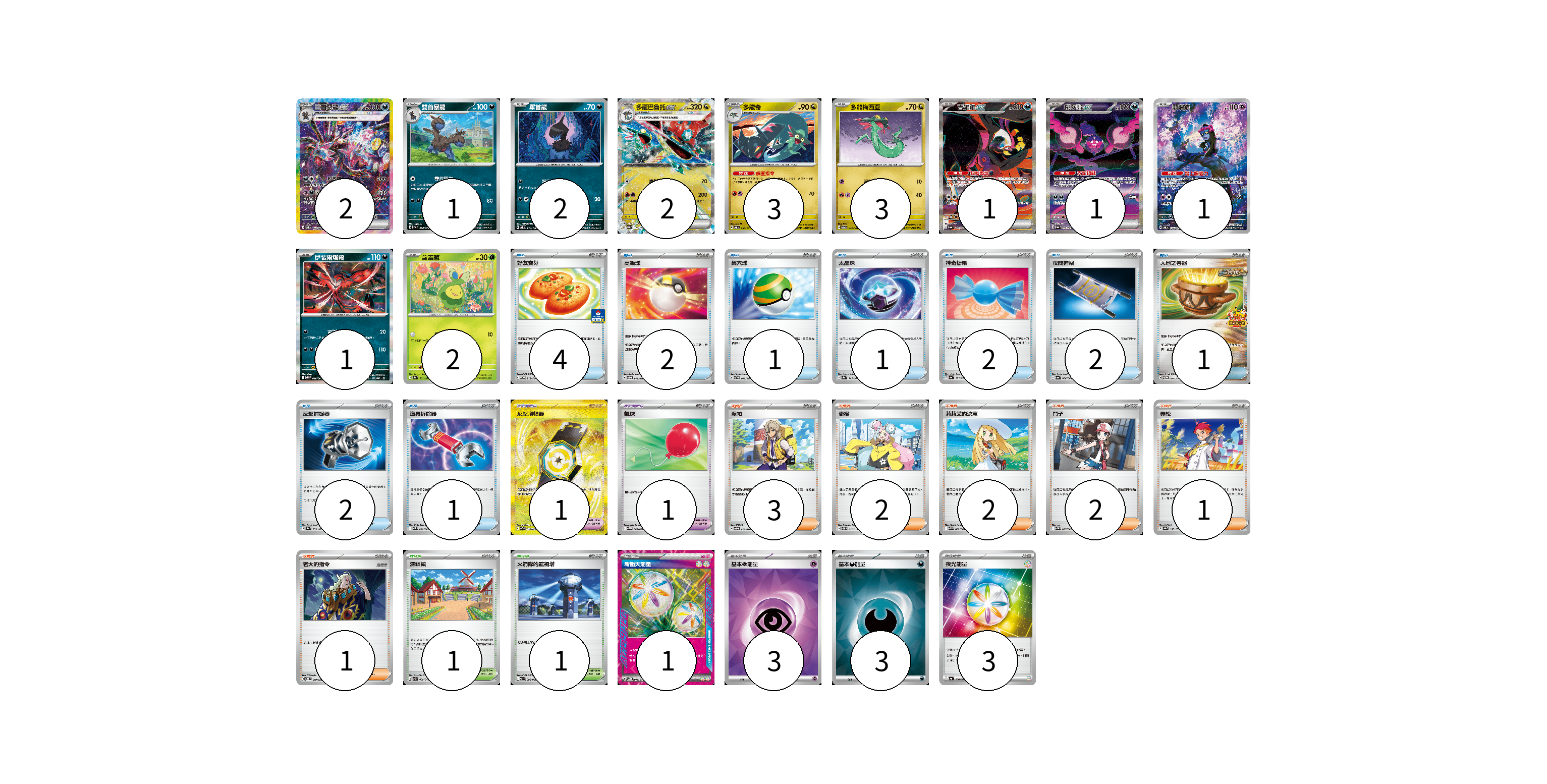 牌組構築方案 以此牌組為基礎新構築牌組 顯示卡面 顯示列表 寶可夢卡(19) 2 1 2 2 3 3 1 1 1 1 2 寶可夢道具(2) 1 1 物品卡(16) 4 2 1 1 2 2 1 2 1 支援者卡(11) 3 2 2 2 1 1 競技場卡(2) 1 1 能量卡(10) 1 3 3 3 寶可夢卡(19) 卡牌名稱 張數 卡牌名稱 張數 三首惡龍ex SV8 133/106 02 雙首暴龍 SV1a 058/073 01 單首龍 SV8 070/106 02 多龍巴魯托ex SV8a 120/187 02 多龍奇 SV6 080/101 03 多龍梅西亞 SV6 079/101 03 吉雉雞ex SV6a 089/064 01 桃歹郎ex SV6a 090/064 01 願增猿 SV6 107/101 01 伊裴爾塔爾 M1L 040/063 01 含羞苞 SV8a 001/187 02 寶可夢道具(2) 卡牌名稱 張數 卡牌名稱 張數 反擊增幅器 SV7a 093/064 01 氣球 SV11B 082/086 01 物品卡(16) 卡牌名稱 張數 卡牌名稱 張數 好友寶芬 SV-P 212/SV-P 04 高級球 SVOD 012/020 02 巢穴球 SVTG 012/019 01 太晶珠 SV8a 145/187 01 神奇糖果 SV4a 163/190 02 夜間擔架 SV6a 056/064 02 大地之容器 SV-P 084/SV-P 01 反擊捕捉器 SV8a 139/187 02 道具拆除器 SV11W 080/086 01 支援者卡(11) 卡牌名稱 張數 卡牌名稱 張數 派帕 SVOD 018/020 03 奇樹 SVTM 017/022 02 莉莉艾的決意 M1L 062/063 02 鬥子 SV11W 085/086 02 赤松 SV8a 163/187 01 老大的指令 SVOD 019/020 01 競技場卡(2) 卡牌名稱 張數 卡牌名稱 張數 深缽鎮 SVK 039/042 01 火箭隊的監視塔 SV10 096/098 01 能量卡(10) 卡牌名稱 張數 卡牌名稱 張數 新衝天能量 SV5K 071/071 01 基本【超】能量 SVOD PSY 03 基本【惡】能量 SVM DAR 03 夜光能量 SV4a 190/190 03 以此牌組為基礎新構築牌組 牌組編碼 nYSBhF-adNoWz-nfAyVh copy 列印牌組單 牌組編碼已複製 分享至SNS