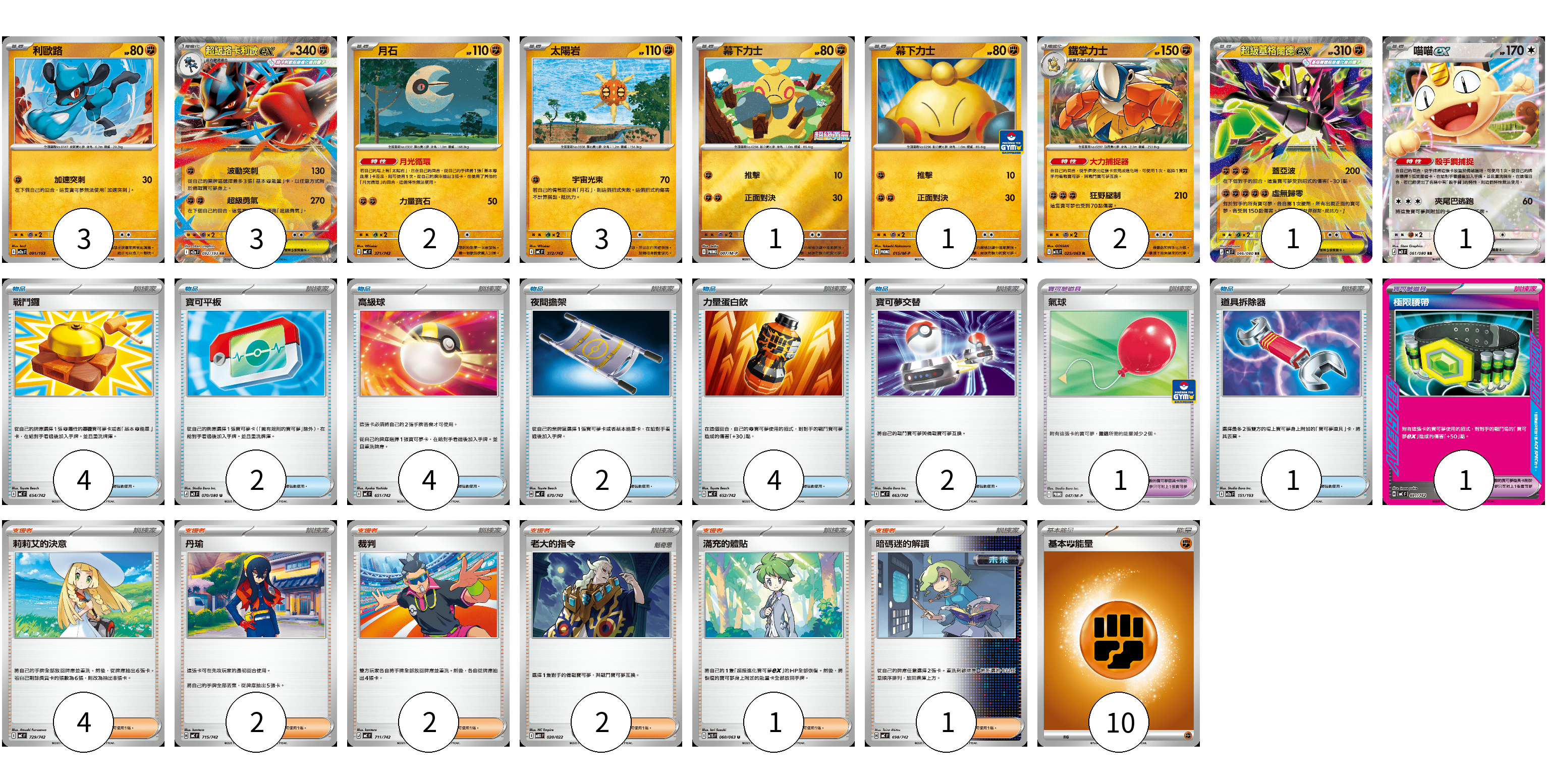 牌組構築方案 以此牌組為基礎新構築牌組 顯示卡面 顯示列表 寶可夢卡(17) 3 3 2 3 1 1 2 1 1 寶可夢道具(2) 1 1 物品卡(19) 4 2 4 2 4 2 1 支援者卡(12) 4 2 2 2 1 1 能量卡(10) 10 寶可夢卡(17) 卡牌名稱 張數 卡牌名稱 張數 利歐路 M2a 091/193 03 超級路卡利歐ex M2a 092/193 03 月石 MC 371/742 02 太陽岩 MC 372/742 03 幕下力士 M-P 007/M-P 01 幕下力士 M-P 015/M-P 01 鐵掌力士 M1L 025/063 02 超級基格爾德ex M3 046/080 01 喵喵ex M3 061/080 01 寶可夢道具(2) 卡牌名稱 張數 卡牌名稱 張數 氣球 M-P 047/M-P 01 極限腰帶 MC 691/742 01 物品卡(19) 卡牌名稱 張數 卡牌名稱 張數 戰鬥鑼 MC 654/742 04 寶可平板 M3 070/080 02 高級球 MC 651/742 04 夜間擔架 MC 670/742 02 力量蛋白飲 MC 652/742 04 寶可夢交替 MC 663/742 02 道具拆除器 M2a 151/193 01 支援者卡(12) 卡牌名稱 張數 卡牌名稱 張數 莉莉艾的決意 MC 729/742 04 丹瑜 MC 715/742 02 裁判 MC 711/742 02 老大的指令 MBD 020/022 02 滿充的體貼 M1S 060/063 01 暗碼迷的解讀 MC 698/742 01 能量卡(10) 卡牌名稱 張數 卡牌名稱 張數 基本【鬥】能量 MC FIG 10 以此牌組為基礎新構築牌組 牌組編碼 ndOkEt-daUOPU-TEYvNZ copy 列印牌組單 牌組編碼已複製 分享至SNS