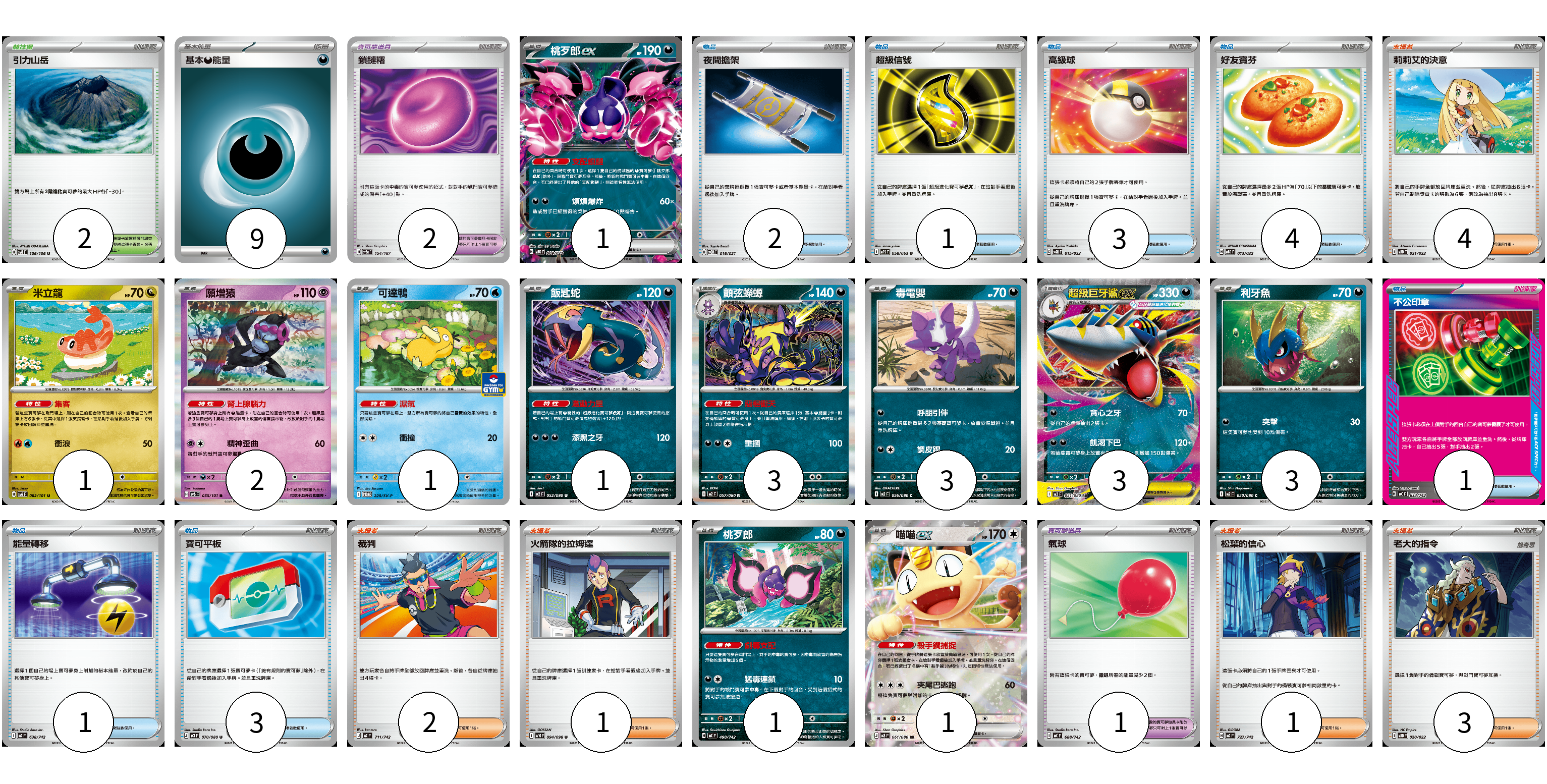 牌組構築方案 以此牌組為基礎新構築牌組 顯示卡面 顯示列表 寶可夢卡(20) 1 1 2 1 1 3 3 3 3 1 1 寶可夢道具(3) 2 1 物品卡(15) 2 1 3 4 1 1 3 支援者卡(11) 4 2 1 1 3 競技場卡(2) 2 能量卡(9) 9 寶可夢卡(20) 卡牌名稱 張數 卡牌名稱 張數 桃歹郎ex MBG 009/022 01 米立龍 SV6 082/101 01 願增猿 SV6 055/101 02 可達鴨 SV-P 220/SV-P 01 飯匙蛇 M2 052/080 01 顫弦蠑螈 M2 057/080 03 毒電嬰 M2 056/080 03 超級巨牙鯊ex M2 051/080 03 利牙魚 M2 050/080 03 桃歹郎 MC 490/742 01 喵喵ex M3 061/080 01 寶可夢道具(3) 卡牌名稱 張數 卡牌名稱 張數 鎖鏈糬 SV8a 154/187 02 氣球 MC 688/742 01 物品卡(15) 卡牌名稱 張數 卡牌名稱 張數 夜間擔架 SVOM 016/021 02 超級信號 M1S 058/063 01 高級球 SVQL 015/022 03 好友寶芬 MBD 013/022 04 不公印章 MC 633/742 01 能量轉移 MC 638/742 01 寶可平板 M3 070/080 03 支援者卡(11) 卡牌名稱 張數 卡牌名稱 張數 莉莉艾的決意 MBD 021/022 04 裁判 MC 711/742 02 火箭隊的拉姆達 SV10 094/098 01 松葉的信心 MC 727/742 01 老大的指令 MBD 020/022 03 競技場卡(2) 卡牌名稱 張數 卡牌名稱 張數 引力山岳 SV8 106/106 02 能量卡(9) 卡牌名稱 張數 卡牌名稱 張數 基本惡能量 sv-p DAR 09 以此牌組為基礎新構築牌組 牌組編碼 ndWTDN-iltVog-TJqNKH copy 列印牌組單 牌組編碼已複製 分享至SNS