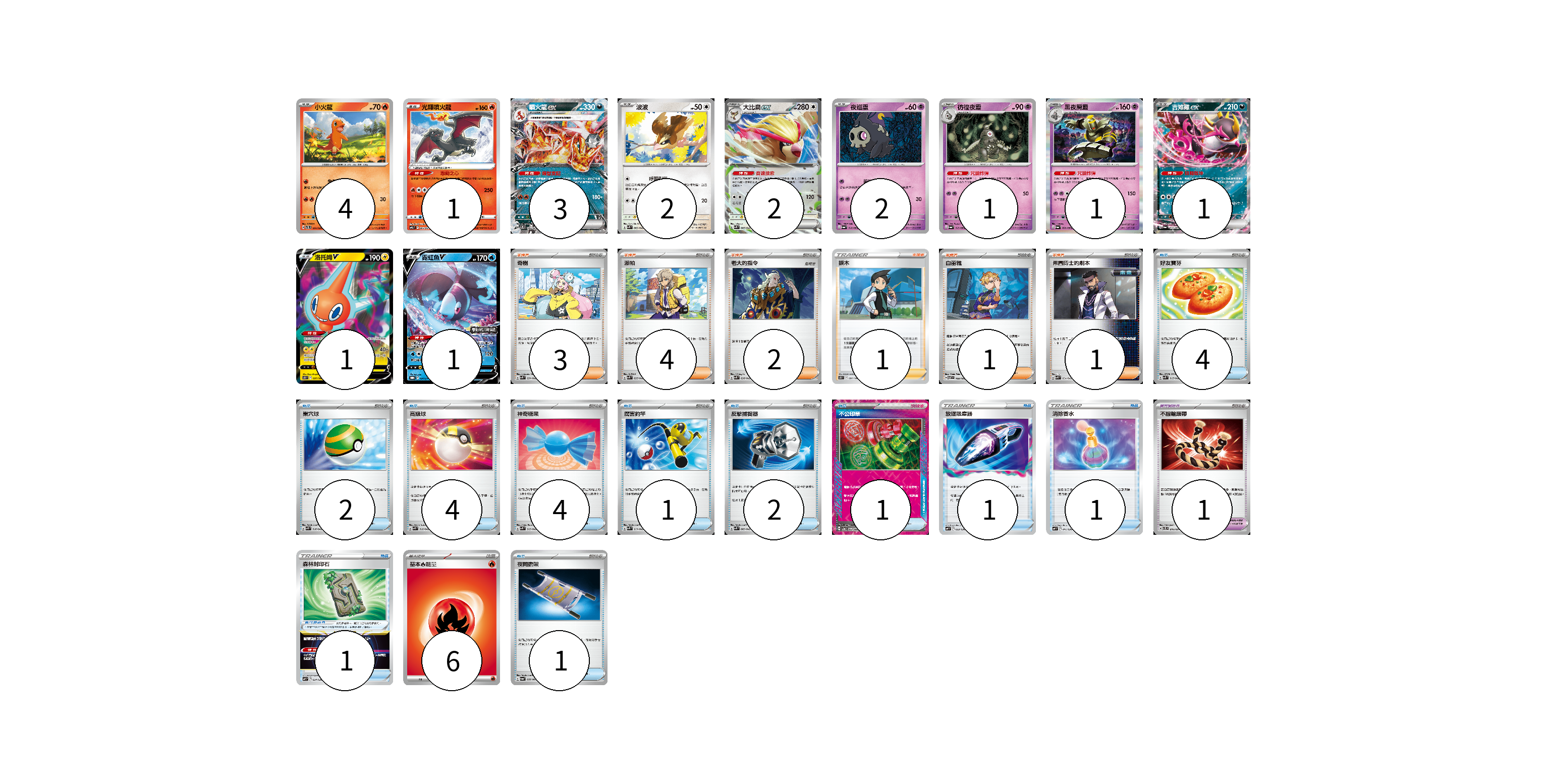 牌組構築方案 以此牌組為基礎新構築牌組 顯示卡面 顯示列表 寶可夢卡(19) 4 1 3 2 2 2 1 1 1 1 1 寶可夢道具(1) 1 物品卡(22) 4 2 4 4 1 2 1 1 1 1 1 支援者卡(12) 3 4 2 1 1 1 能量卡(6) 6 寶可夢卡(19) 卡牌名稱 張數 卡牌名稱 張數 小火龍 SVTL 001/021 04 光輝噴火龍 SVTL 003/021 01 噴火龍ex SVTL 006/021 03 波波 SVK 003/042 02 大比鳥ex SVK 005/042 02 夜巡靈 SV6a 018/064 02 彷徨夜靈 SV6a 019/064 01 黑夜魔靈 SV6a 020/064 01 吉雉雞ex SV6a 038/064 01 洛托姆V S11 037/100 01 霓虹魚V SV-P 134/SV-P 01 寶可夢道具(1) 卡牌名稱 張數 卡牌名稱 張數 不服輸頭帶 SVTL 016/021 01 物品卡(22) 卡牌名稱 張數 卡牌名稱 張數 好友寶芬 SVK 015/042 04 巢穴球 SVK 016/042 02 高級球 SVK 018/042 04 神奇糖果 SVK 019/042 04 厲害釣竿 SVK 011/042 01 反擊捕捉器 SVK 009/042 02 不公印章 SV5a 053/066 01 放逐吸塵器 SVF 023/038 01 消除香水 SVF 011/038 01 森林封印石 SVF 024/038 01 夜間擔架 SV6a 056/064 01 支援者卡(12) 卡牌名稱 張數 卡牌名稱 張數 奇樹 SVK 031/042 03 派帕 SVK 035/042 04 老大的指令 SVK 036/042 02 捩木 S11 097/100 01 白蕾雅 SV7 100/102 01 弗圖博士的劇本 SVK 034/042 01 能量卡(6) 卡牌名稱 張數 卡牌名稱 張數 基本【火】能量 SVTL FIR 06 以此牌組為基礎新構築牌組 牌組編碼 neNTwf-mMVfDm-kcwoXR copy 列印牌組單 牌組編碼已複製 分享至SNS