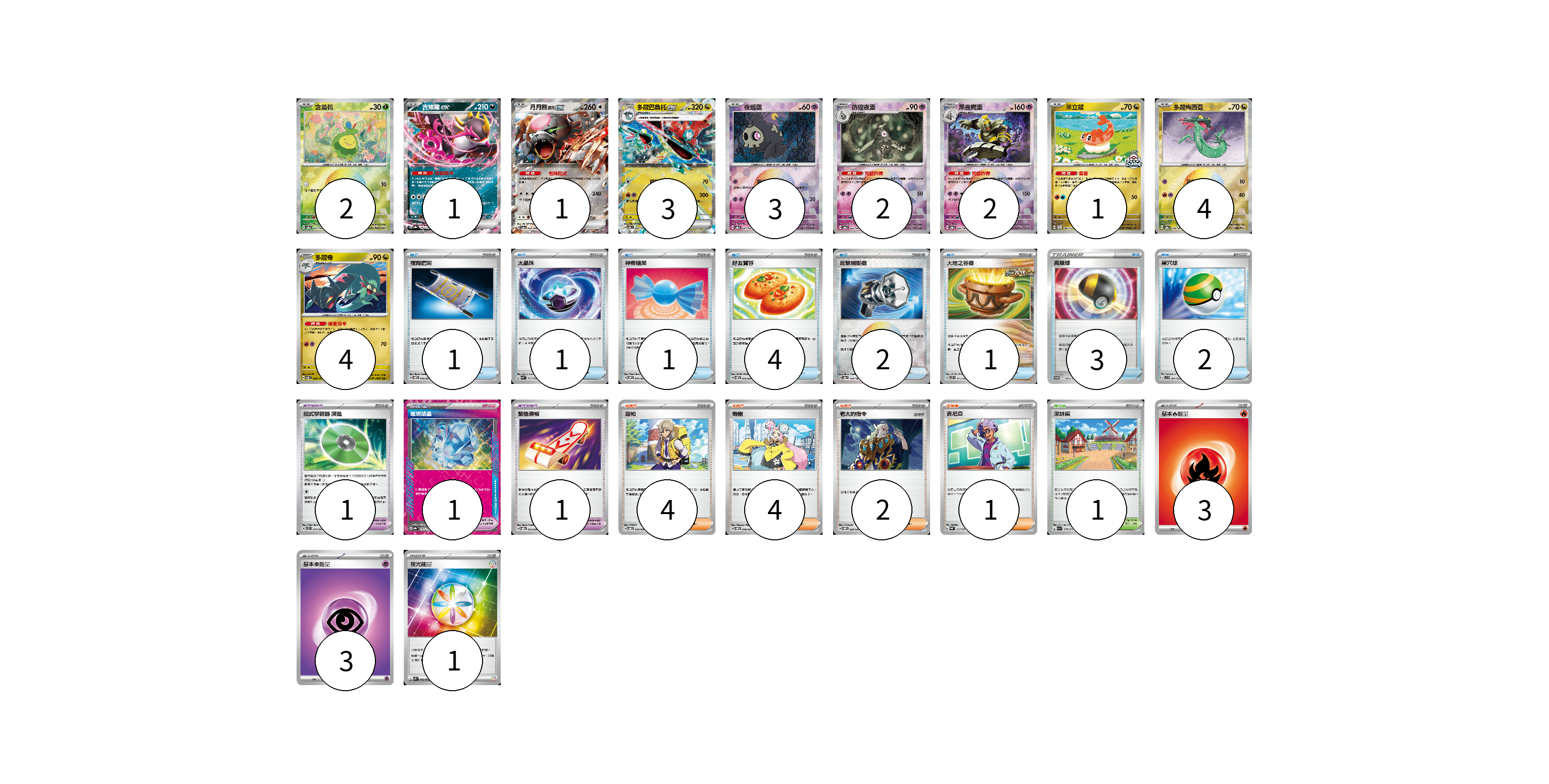 牌組構築方案 以此牌組為基礎新構築牌組 顯示卡面 顯示列表 寶可夢卡(23) 2 1 1 3 3 2 2 1 4 4 寶可夢道具(3) 1 1 1 物品卡(15) 1 1 1 4 2 1 3 2 支援者卡(11) 4 4 2 1 競技場卡(1) 1 能量卡(7) 3 3 1 寶可夢卡(23) 卡牌名稱 張數 卡牌名稱 張數 含羞苞 SV8a 001/187 02 吉雉雞ex SV8a 104/187 01 月月熊 赫月 ex SV5a 052/066 01 多龍巴魯托ex SV6 081/101 03 夜巡靈 SV8a 064/187 03 彷徨夜靈 SV8a 065/187 02 黑夜魔靈 SV8a 066/187 02 米立龍 SV-P 186/SV-P 01 多龍梅西亞 SV8a 118/187 04 多龍奇 SV6 080/101 04 寶可夢道具(3) 卡牌名稱 張數 卡牌名稱 張數 招式學習器 演進 SVTL 017/021 01 璀璨結晶 SV8a 152/187 01 緊急滑板 SVOD 015/020 01 物品卡(15) 卡牌名稱 張數 卡牌名稱 張數 夜間擔架 SVOM 016/021 01 太晶珠 SVK 013/042 01 神奇糖果 SVOM 014/021 01 好友寶芬 SVOM 012/021 04 反擊捕捉器 SV8a 139/187 02 大地之容器 SVTS 011/022 01 高級球 S-P 148/S-P 03 巢穴球 SVB 001/028 02 支援者卡(11) 卡牌名稱 張數 卡牌名稱 張數 派帕 SVOD 018/020 04 奇樹 SVOM 018/021 04 老大的指令 SVOM 020/021 02 吉尼亞 SVAL 017/021 01 競技場卡(1) 卡牌名稱 張數 卡牌名稱 張數 深缽鎮 SV1a 070/073 01 能量卡(7) 卡牌名稱 張數 卡牌名稱 張數 基本火能量 sv-p FIR 03 基本超能量 sv-p PSY 03 夜光能量 SVK 042/042 01 以此牌組為基礎新構築牌組 牌組編碼 neminj-bpEqLF-aKzkhW copy 列印牌組單 牌組編碼已複製 分享至SNS