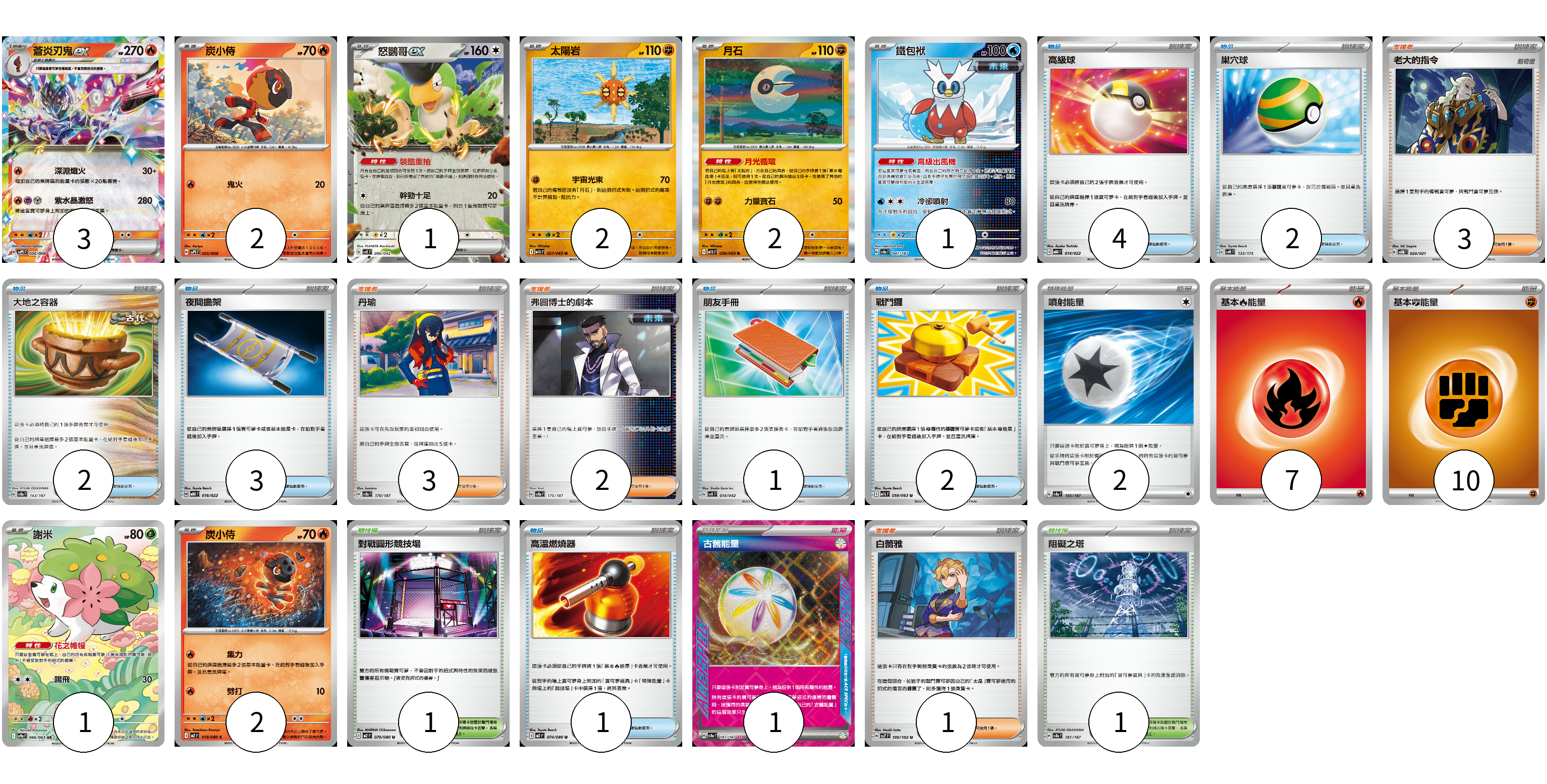 牌組構築方案 以此牌組為基礎新構築牌組 顯示卡面 顯示列表 寶可夢卡(14) 3 2 1 2 2 1 1 2 物品卡(15) 4 2 2 3 1 2 1 支援者卡(9) 3 3 2 1 競技場卡(2) 1 1 能量卡(20) 2 7 10 1 寶可夢卡(14) 卡牌名稱 張數 卡牌名稱 張數 蒼炎刃鬼ex SVPS 006/008 03 炭小侍 SVPS 005/008 02 怒鸚哥ex SVK 006/042 01 太陽岩 M1L 027/063 02 月石 M1L 026/063 02 鐵包袱 SV8a 047/187 01 謝米 SV9a 066/063 01 炭小侍 M2 019/080 02 物品卡(15) 卡牌名稱 張數 卡牌名稱 張數 高級球 MBD 014/022 04 巢穴球 SVM 133/175 02 大地之容器 SV8a 143/187 02 夜間擔架 MBD 016/022 03 朋友手冊 SVK 014/042 01 戰鬥鑼 M1L 059/063 02 高溫燃燒器 M2 074/080 01 支援者卡(9) 卡牌名稱 張數 卡牌名稱 張數 老大的指令 SVOM 020/021 03 丹瑜 SV8a 170/187 03 弗圖博士的劇本 SV8a 175/187 02 白蕾雅 SV7 100/102 01 競技場卡(2) 卡牌名稱 張數 卡牌名稱 張數 對戰圓形競技場 M2 079/080 01 阻礙之塔 SV8a 181/187 01 能量卡(20) 卡牌名稱 張數 卡牌名稱 張數 噴射能量 SV8a 185/187 02 基本火能量 sv-p FIR 07 基本鬥能量 sv-p FIG 10 古舊能量 SV8a 187/187 01 以此牌組為基礎新構築牌組 牌組編碼 nfOlbV-kaZRMi-CXpEmB copy 列印牌組單 牌組編碼已複製 分享至SNS