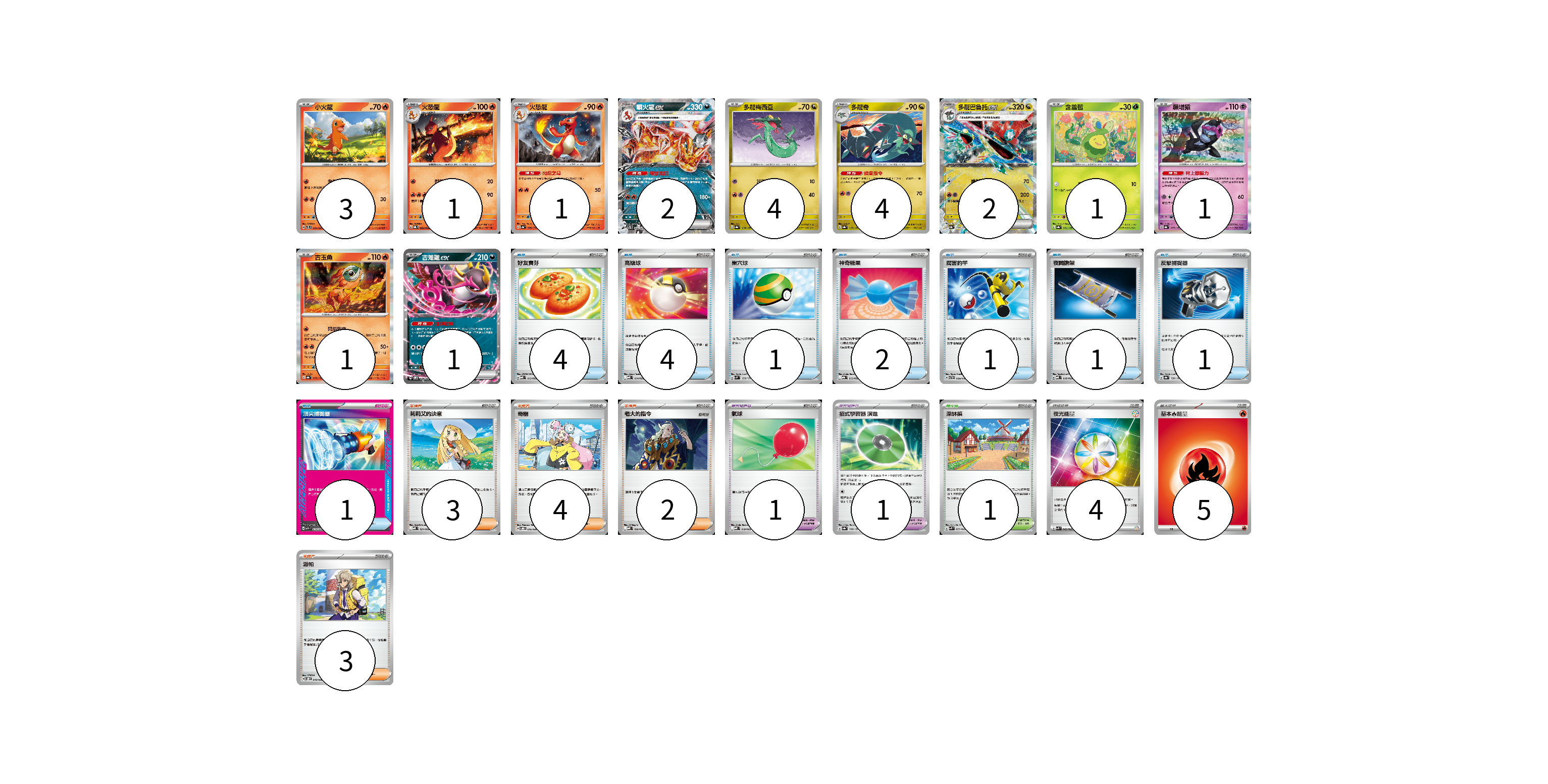 牌組構築方案 以此牌組為基礎新構築牌組 顯示卡面 顯示列表 寶可夢卡(21) 3 1 1 2 4 4 2 1 1 1 1 寶可夢道具(2) 1 1 物品卡(15) 4 4 1 2 1 1 1 1 支援者卡(12) 3 4 2 3 競技場卡(1) 1 能量卡(9) 4 5 寶可夢卡(21) 卡牌名稱 張數 卡牌名稱 張數 小火龍 SVTL 001/021 03 火恐龍 SVQL 002/022 01 火恐龍 SV4a 026/190 01 噴火龍ex SVTL 006/021 02 多龍梅西亞 SV8a 118/187 04 多龍奇 SV8a 119/187 04 多龍巴魯托ex SV8a 120/187 02 含羞苞 SV8a 001/187 01 願增猿 SV8a 075/187 01 古玉魚 SV8a 025/187 01 吉雉雞ex SVOM 009/021 01 寶可夢道具(2) 卡牌名稱 張數 卡牌名稱 張數 氣球 MBD 018/022 01 招式學習器 演進 SV8a 160/187 01 物品卡(15) 卡牌名稱 張數 卡牌名稱 張數 好友寶芬 MBD 013/022 04 高級球 MBD 014/022 04 巢穴球 SVM 133/175 01 神奇糖果 MBG 013/022 02 厲害釣竿 SVTH 008/018 01 夜間擔架 MBD 016/022 01 反擊捕捉器 SV8a 139/187 01 頂尖捕捉器 MBG 014/022 01 支援者卡(12) 卡牌名稱 張數 卡牌名稱 張數 莉莉艾的決意 MBD 021/022 03 奇樹 SVOD 016/020 04 老大的指令 MBD 020/022 02 派帕 SVOD 018/020 03 競技場卡(1) 卡牌名稱 張數 卡牌名稱 張數 深缽鎮 SVK 039/042 01 能量卡(9) 卡牌名稱 張數 卡牌名稱 張數 夜光能量 SVK 042/042 04 基本火能量 sv-p FIR 05 以此牌組為基礎新構築牌組 牌組編碼 ngMmcz-oqvGzN-BCVIZD copy 列印牌組單 牌組編碼已複製 分享至SNS