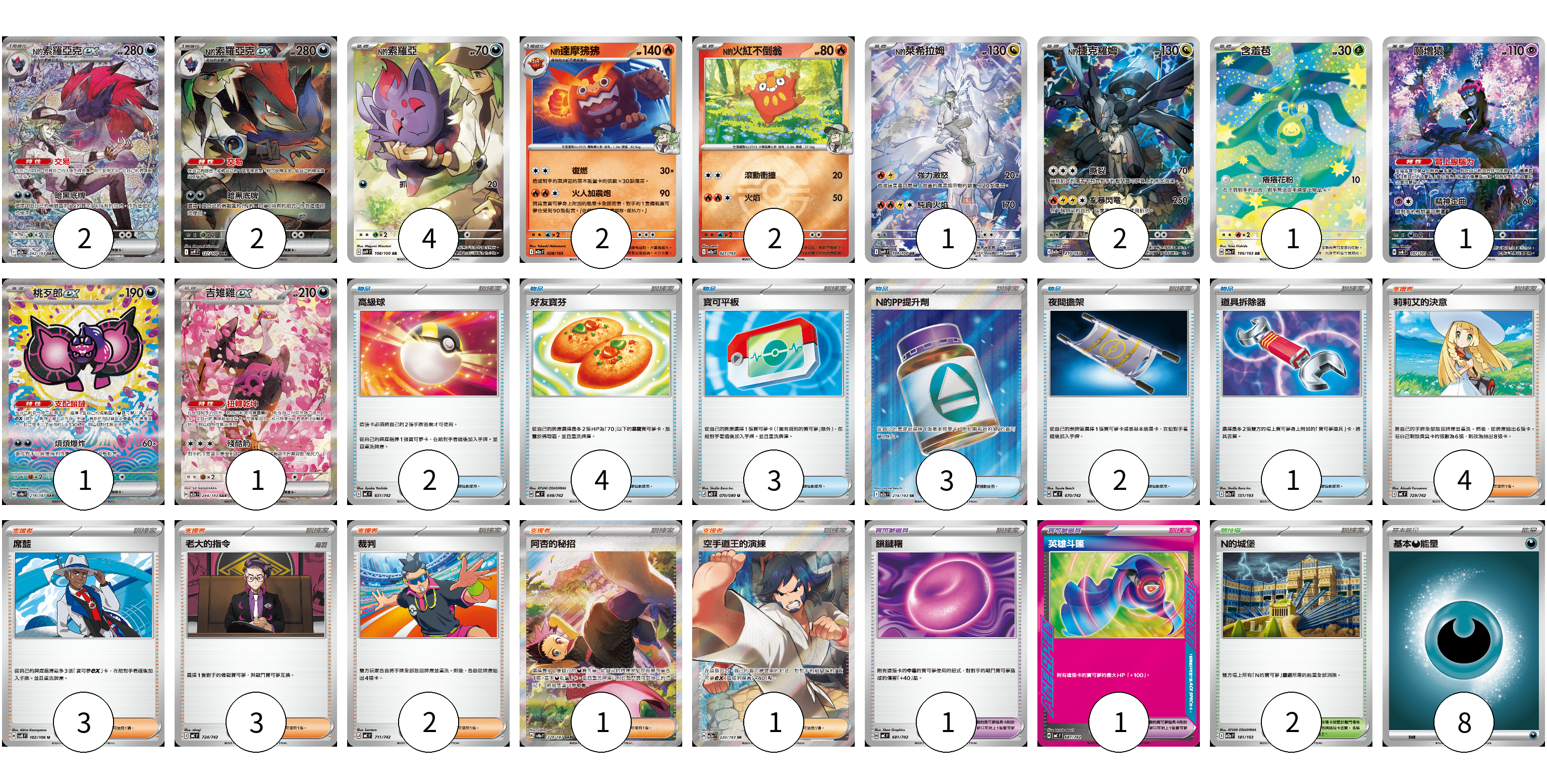 牌組構築方案 以此牌組為基礎新構築牌組 顯示卡面 顯示列表 寶可夢卡(19) 2 2 4 2 2 1 2 1 1 1 1 寶可夢道具(2) 1 1 物品卡(15) 2 4 3 3 2 1 支援者卡(14) 4 3 3 2 1 1 競技場卡(2) 2 能量卡(8) 8 寶可夢卡(19) 卡牌名稱 張數 卡牌名稱 張數 N的索羅亞克ex M2a 242/193 02 N的索羅亞克ex SV9 127/100 02 N的索羅亞 SV9 108/100 04 N的達摩狒狒 M2a 028/193 02 N的火紅不倒翁 M2a 027/193 02 N的萊希拉姆 SV9 109/100 01 N的捷克羅姆 M2a 210/193 02 含羞苞 M2a 196/193 01 願增猿 SV6 107/101 01 桃歹郎ex SV8a 219/187 01 吉雉雞ex M2a 244/193 01 寶可夢道具(2) 卡牌名稱 張數 卡牌名稱 張數 鎖鏈糬 MC 681/742 01 英雄斗篷 MC 687/742 01 物品卡(15) 卡牌名稱 張數 卡牌名稱 張數 高級球 MC 651/742 02 好友寶芬 MC 648/742 04 寶可平板 M3 070/080 03 N的PP提升劑 M2a 214/193 03 夜間擔架 MC 670/742 02 道具拆除器 M2a 151/193 01 支援者卡(14) 卡牌名稱 張數 卡牌名稱 張數 莉莉艾的決意 MC 729/742 04 席藍 SV8 102/106 03 老大的指令 MC 724/742 03 裁判 MC 711/742 02 阿杏的秘招 SV8a 228/187 01 空手道王的演練 M2a 220/193 01 競技場卡(2) 卡牌名稱 張數 卡牌名稱 張數 N的城堡 M2a 181/193 02 能量卡(8) 卡牌名稱 張數 卡牌名稱 張數 基本【惡】能量 MC DAR 08 以此牌組為基礎新構築牌組 牌組編碼 nizdIn-zuYPFT-ootXlG copy 列印牌組單 牌組編碼已複製 分享至SNS