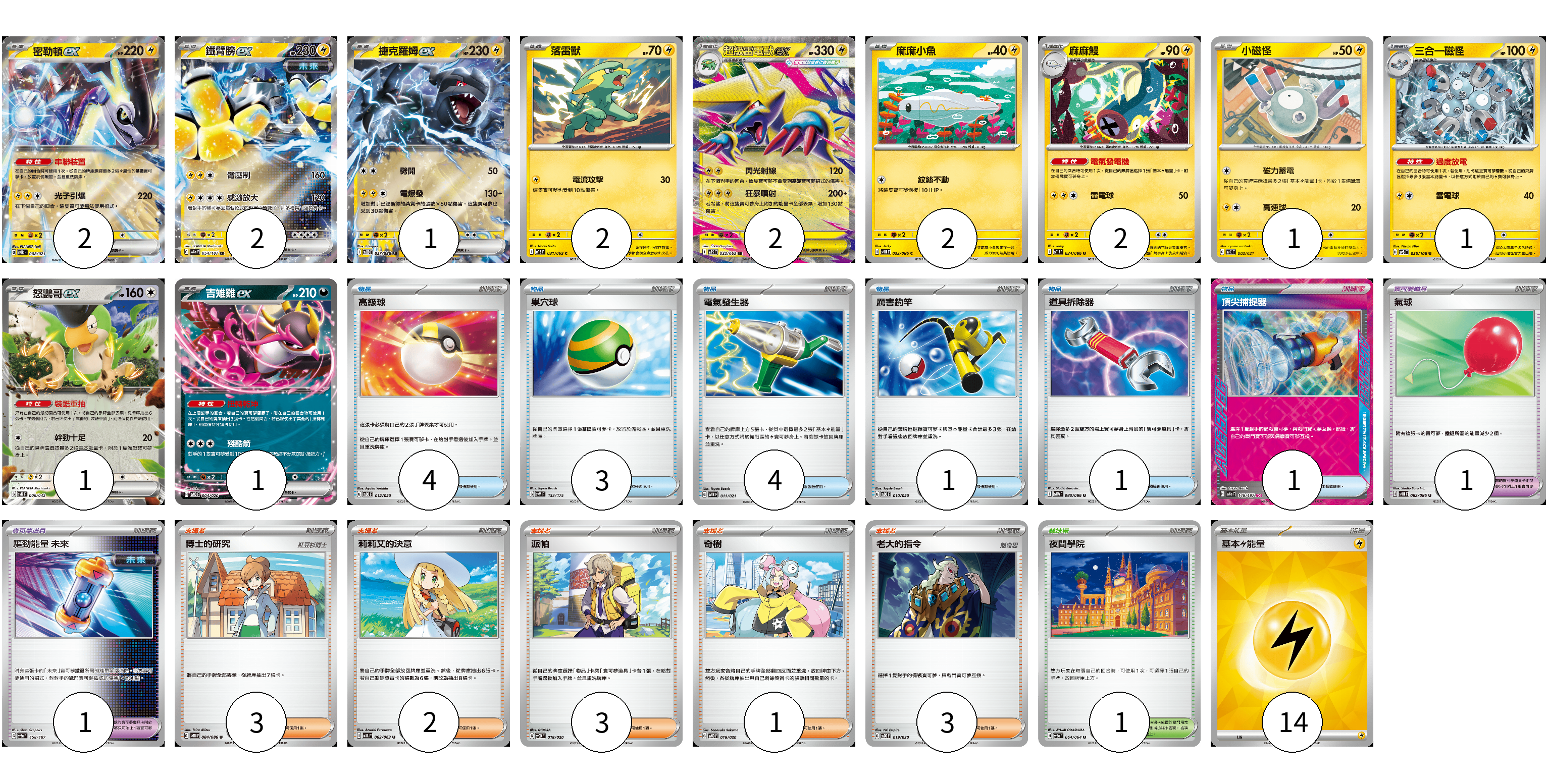 牌組構築方案 以此牌組為基礎新構築牌組 顯示卡面 顯示列表 寶可夢卡(17) 2 2 1 2 2 2 2 1 1 1 1 寶可夢道具(2) 1 1 物品卡(14) 4 3 4 1 1 1 支援者卡(12) 3 2 3 1 3 競技場卡(1) 1 能量卡(14) 14 寶可夢卡(17) 卡牌名稱 張數 卡牌名稱 張數 密勒頓ex SVTR 008/021 02 鐵臂膀ex SV8a 054/187 02 捷克羅姆ex SV11B 037/086 01 落雷獸 M1S 031/063 02 超級雷電獸ex M1S 032/063 02 麻麻小魚 SV11B 033/086 02 麻麻鰻 SV11B 034/086 02 小磁怪 SVC 002/021 01 三合一磁怪 SV8 035/106 01 怒鸚哥ex SVK 006/042 01 吉雉雞ex SVOD 004/020 01 寶可夢道具(2) 卡牌名稱 張數 卡牌名稱 張數 氣球 SV11B 082/086 01 驅勁能量 未來 SV8a 158/187 01 物品卡(14) 卡牌名稱 張數 卡牌名稱 張數 高級球 SVOD 012/020 04 巢穴球 SVM 133/175 03 電氣發生器 SVTR 011/021 04 厲害釣竿 SVOD 010/020 01 道具拆除器 SV11W 080/086 01 頂尖捕捉器 SV8a 148/187 01 支援者卡(12) 卡牌名稱 張數 卡牌名稱 張數 博士的研究 SV11B 084/086 03 莉莉艾的決意 M1L 062/063 02 派帕 SVOD 018/020 03 奇樹 SVOD 016/020 01 老大的指令 SVOD 019/020 03 競技場卡(1) 卡牌名稱 張數 卡牌名稱 張數 夜間學院 SV6a 064/064 01 能量卡(14) 卡牌名稱 張數 卡牌名稱 張數 基本【雷】能量 SVQP LIG 14 以此牌組為基礎新構築牌組 牌組編碼 nizvHn-CQllFU-gEOBlR copy 列印牌組單 牌組編碼已複製 分享至SNS