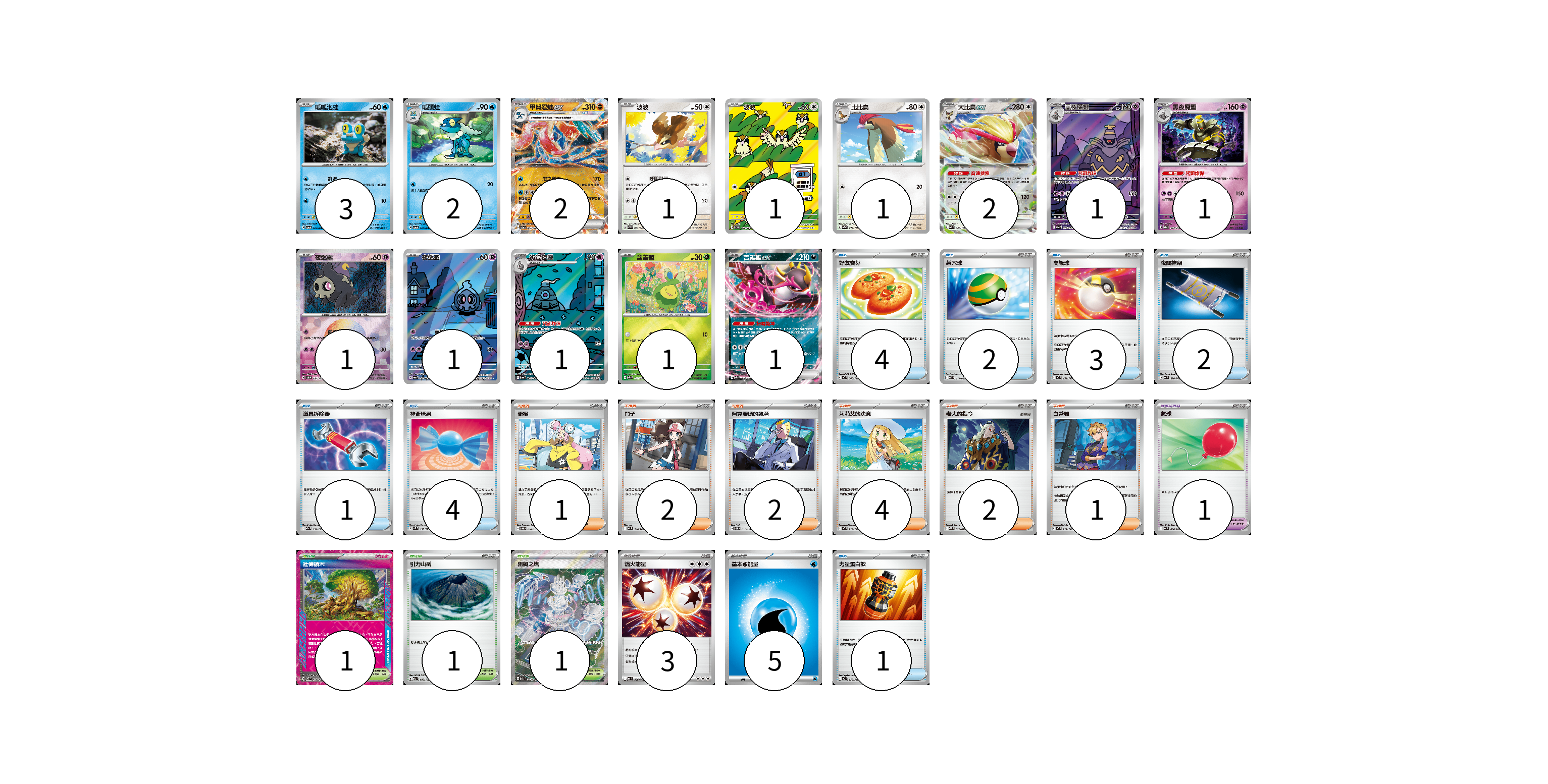 牌組構築方案 以此牌組為基礎新構築牌組 顯示卡面 顯示列表 寶可夢卡(19) 3 2 2 1 1 1 2 1 1 1 1 1 1 1 寶可夢道具(1) 1 物品卡(17) 4 2 3 2 1 4 1 支援者卡(12) 1 2 2 4 2 1 競技場卡(3) 1 1 1 能量卡(8) 3 5 寶可夢卡(19) 卡牌名稱 張數 卡牌名稱 張數 呱呱泡蛙 SV5a 023/066 03 呱頭蛙 SV5a 024/066 02 甲賀忍蛙ex SV5a 045/066 02 波波 SVK 003/042 01 波波 SV3 118/108 01 比比鳥 SV2a 017/165 01 大比鳥ex SV3 089/108 02 黑夜魔靈 SV6a 070/064 01 黑夜魔靈 M2a 074/193 01 夜巡靈 SV8a 064/187 01 夜巡靈 SV6a 068/064 01 彷徨夜靈 SV6a 069/064 01 含羞苞 M2a 011/193 01 吉雉雞ex M2a 114/193 01 寶可夢道具(1) 卡牌名稱 張數 卡牌名稱 張數 氣球 MC 688/742 01 物品卡(17) 卡牌名稱 張數 卡牌名稱 張數 好友寶芬 MC 648/742 04 巢穴球 SVEL 011/020 02 高級球 MC 651/742 03 夜間擔架 MC 670/742 02 道具拆除器 M2a 151/193 01 神奇糖果 SVM 135/175 04 力量蛋白飲 MC 652/742 01 支援者卡(12) 卡牌名稱 張數 卡牌名稱 張數 奇樹 SVOD 016/020 01 鬥子 MC 718/742 02 阿克羅瑪的執著 SVOM 017/021 02 莉莉艾的決意 MC 729/742 04 老大的指令 MBD 020/022 02 白蕾雅 MC 722/742 01 競技場卡(3) 卡牌名稱 張數 卡牌名稱 張數 壯偉碩木 SV7 101/102 01 引力山岳 M2a 183/193 01 阻礙之塔 M2a 222/193 01 能量卡(8) 卡牌名稱 張數 卡牌名稱 張數 燃火能量 MC 736/742 03 基本【水】能量 MC WAT 05 以此牌組為基礎新構築牌組 牌組編碼 nlwHdk-vbBcTe-sMAoCW copy 列印牌組單 牌組編碼已複製 分享至SNS