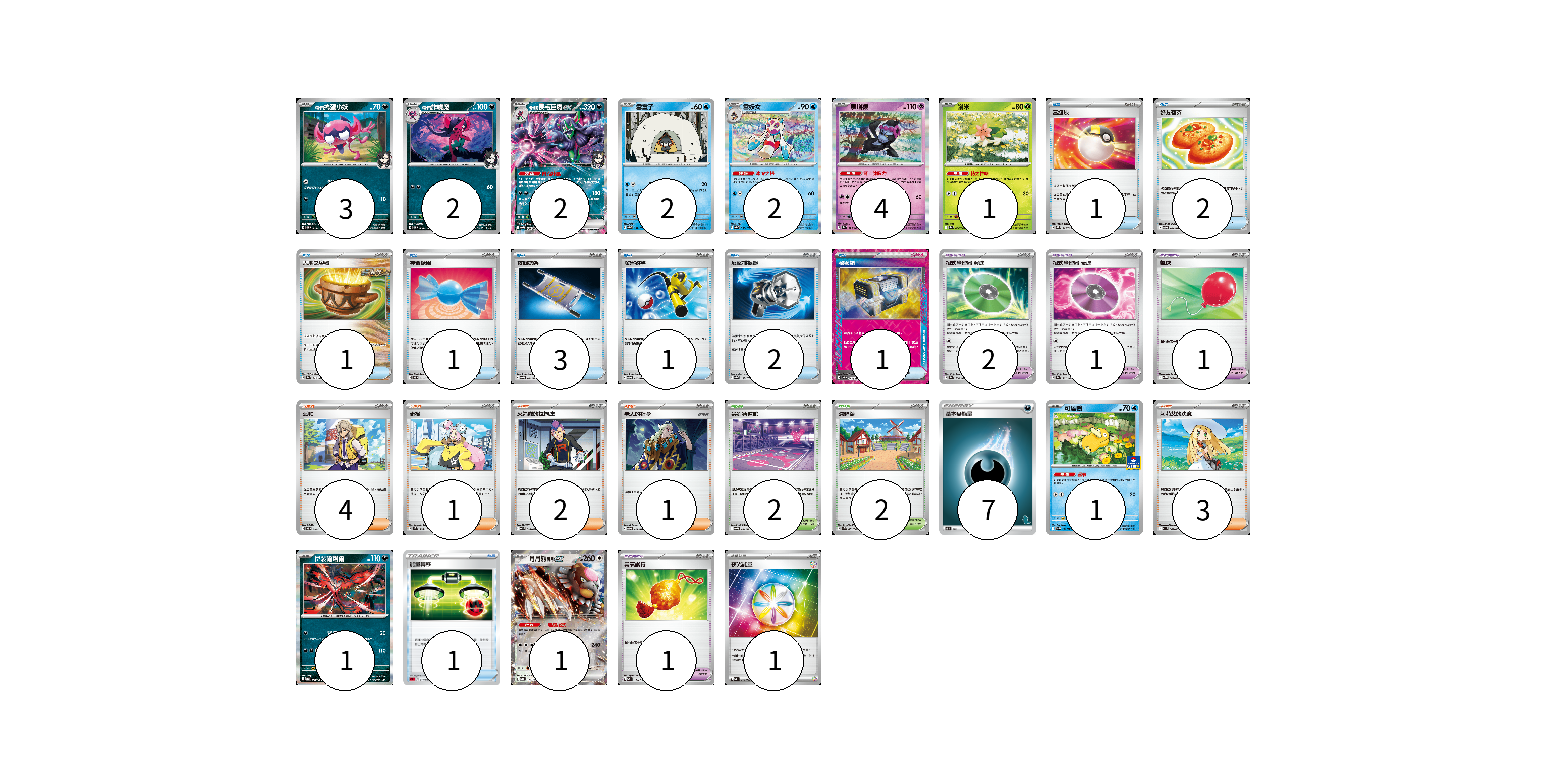 牌組構築方案 以此牌組為基礎新構築牌組 顯示卡面 顯示列表 寶可夢卡(19) 3 2 2 2 2 4 1 1 1 1 寶可夢道具(5) 2 1 1 1 物品卡(13) 1 2 1 1 3 1 2 1 1 支援者卡(11) 4 1 2 1 3 競技場卡(4) 2 2 能量卡(8) 7 1 寶可夢卡(19) 卡牌名稱 張數 卡牌名稱 張數 <瑪俐的>搗蛋小妖 SVOM 005/021 03 <瑪俐的>詐唬魔 SVOM 006/021 02 <瑪俐的>長毛巨魔ex SVOM 007/021 02 雪童子 SV8a 037/187 02 雪妖女 SV8a 038/187 02 願增猿 SV8a 075/187 04 謝米 SV9a 006/063 01 可達鴨 SV-P 220/SV-P 01 伊裴爾塔爾 M1L 040/063 01 月月熊 赫月ex SV8a 134/187 01 寶可夢道具(5) 卡牌名稱 張數 卡牌名稱 張數 招式學習器 演進 SV8a 160/187 02 招式學習器 衰退 SV8a 161/187 01 氣球 SV11B 082/086 01 勇氣護符 SVM 142/175 01 物品卡(13) 卡牌名稱 張數 卡牌名稱 張數 高級球 SVQL 015/022 01 好友寶芬 SVOD 011/020 02 大地之容器 SV8a 143/187 01 神奇糖果 SVOD 013/020 01 夜間擔架 SVOM 016/021 03 厲害釣竿 SVOD 010/020 01 反擊捕捉器 SV8a 139/187 02 秘密箱 SV6 092/101 01 能量轉移 SDL 011/021 01 支援者卡(11) 卡牌名稱 張數 卡牌名稱 張數 派帕 SVOD 018/020 04 奇樹 SVM 160/175 01 火箭隊的拉姆達 SV10 094/098 02 老大的指令 SVOD 019/020 01 莉莉艾的決意 M1L 062/063 03 競技場卡(4) 卡牌名稱 張數 卡牌名稱 張數 尖釘鎮道館 SVOM 021/021 02 深缽鎮 SVK 039/042 02 能量卡(8) 卡牌名稱 張數 卡牌名稱 張數 基本惡能量 SH DAR 07 夜光能量 SVK 042/042 01 以此牌組為基礎新構築牌組 牌組編碼 noCTTx-BQZQVh-CrmNgb copy 列印牌組單 牌組編碼已複製 分享至SNS