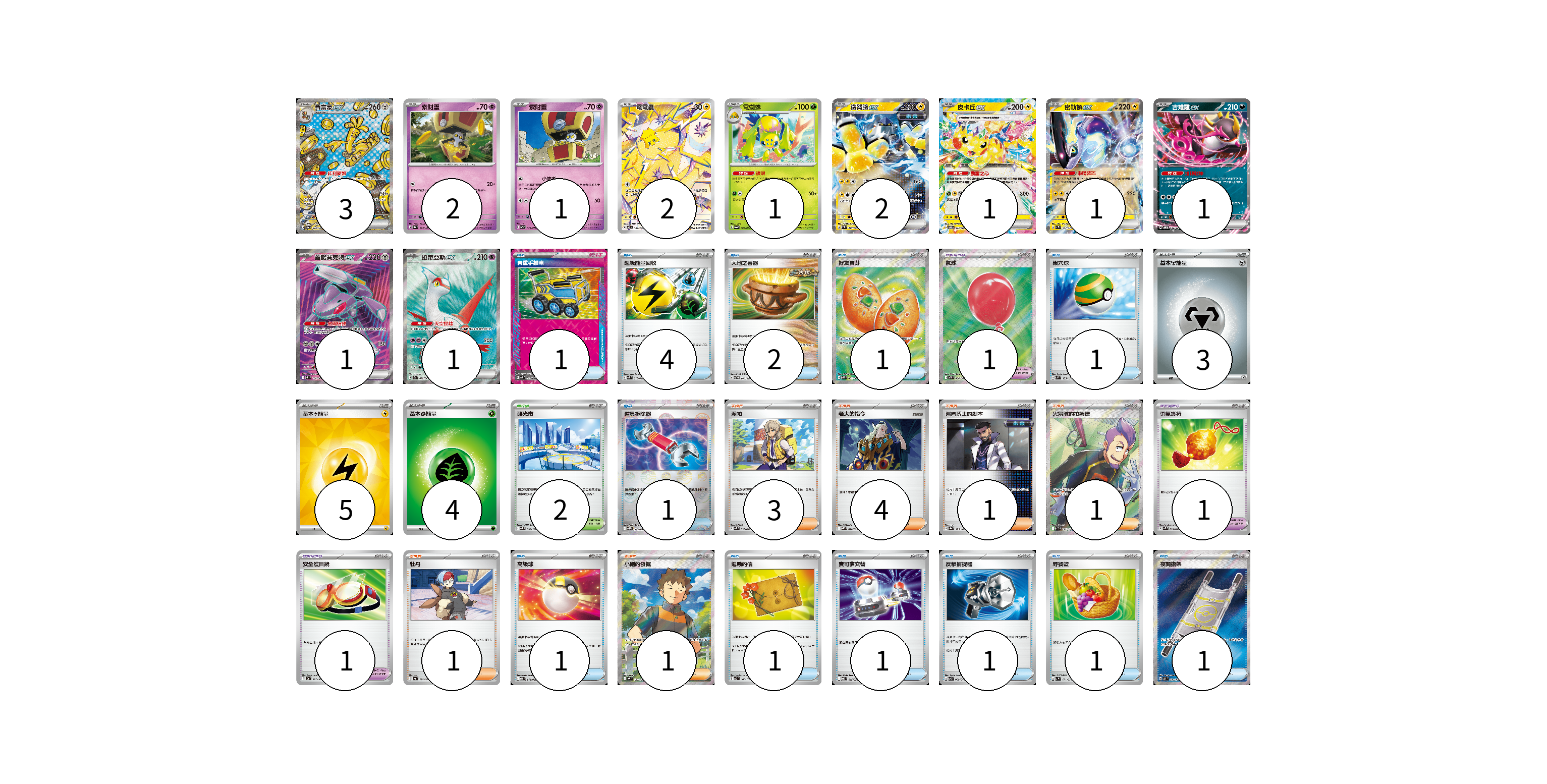 牌組構築方案 以此牌組為基礎新構築牌組 顯示卡面 顯示列表 寶可夢卡(16) 3 2 1 2 1 2 1 1 1 1 1 寶可夢道具(3) 1 1 1 物品卡(16) 1 4 2 1 1 1 1 1 1 1 1 1 支援者卡(11) 3 4 1 1 1 1 競技場卡(2) 2 能量卡(12) 3 5 4 寶可夢卡(16) 卡牌名稱 張數 卡牌名稱 張數 賽富豪ex SV8a 220/187 03 索財靈 SV8a 073/187 02 索財靈 SV7a 024/064 01 電電蟲 SV7 108/102 02 電蜘蛛 SV6a 002/064 01 鐵臂膀ex SV4M 027/066 02 皮卡丘ex SV8 033/106 01 密勒頓ex SV1V 037/078 01 吉雉雞ex SVOM 009/021 01 蓋諾賽克特ex SV11B 164/086 01 拉帝亞斯ex SV7a 078/064 01 寶可夢道具(3) 卡牌名稱 張數 卡牌名稱 張數 氣球 M1L 084/063 01 勇氣護符 SVK 024/042 01 安全護目鏡 SV2a 157/165 01 物品卡(16) 卡牌名稱 張數 卡牌名稱 張數 貴重手推車 SVK 020/042 01 超級能量回收 SVK 010/042 04 大地之容器 SVTG 010/019 02 好友寶芬 M1S 081/063 01 巢穴球 SVM 133/175 01 道具拆除器 SV11W 080/086 01 高級球 MBD 014/022 01 勉勵的信 SV3 100/108 01 寶可夢交替 MBG 015/022 01 反擊捕捉器 SVK 009/042 01 野餐籃 SV1V 071/078 01 夜間擔架 M1L 083/063 01 支援者卡(11) 卡牌名稱 張數 卡牌名稱 張數 派帕 SVK 035/042 03 老大的指令 MBD 020/022 04 弗圖博士的劇本 SV8a 175/187 01 火箭隊的拉姆達 SV10 122/098 01 牡丹 SV4a 182/190 01 小剛的發掘 SV9 123/100 01 競技場卡(2) 卡牌名稱 張數 卡牌名稱 張數 釀光市 SV9 098/100 02 能量卡(12) 卡牌名稱 張數 卡牌名稱 張數 基本【鋼】能量 M-P MET 03 基本【雷】能量 SVQP LIG 05 基本【草】能量 M-P GRA 04 以此牌組為基礎新構築牌組 牌組編碼 npmfzq-ASCcMI-VRbygp copy 列印牌組單 牌組編碼已複製 分享至SNS
