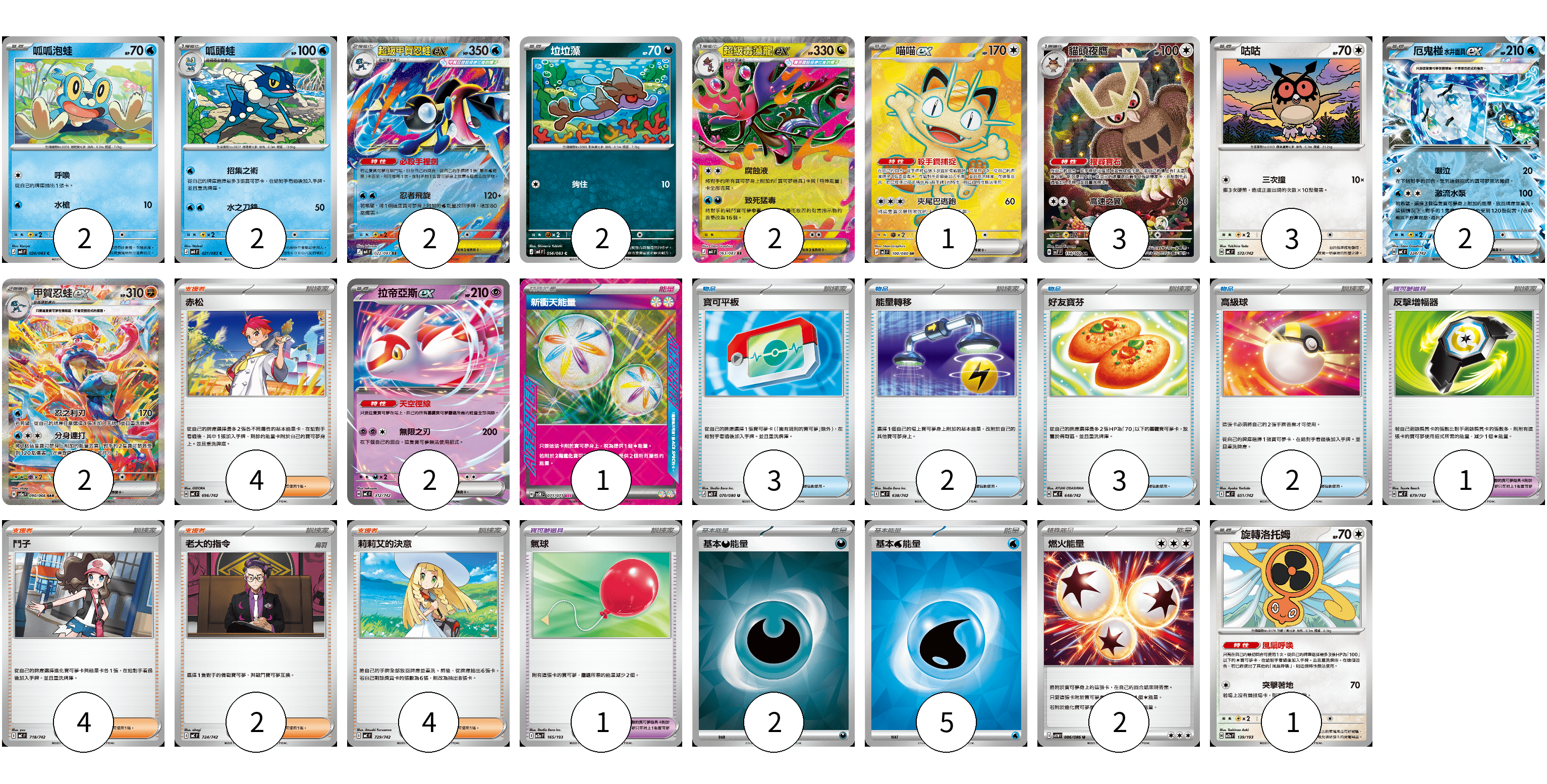 牌組構築方案 以此牌組為基礎新構築牌組 顯示卡面 顯示列表 寶可夢卡(24) 2 2 2 2 2 1 3 3 2 2 2 1 寶可夢道具(2) 1 1 物品卡(10) 3 2 3 2 支援者卡(14) 4 4 2 4 能量卡(10) 1 2 5 2 寶可夢卡(24) 卡牌名稱 張數 卡牌名稱 張數 呱呱泡蛙 M4 020/083 02 呱頭蛙 M4 021/083 02 超級甲賀忍蛙ex M4 022/083 02 垃垃藻 M4 056/083 02 超級毒藻龍ex M4 063/083 02 喵喵ex M3 100/080 01 貓頭夜鷹 SV7 114/102 03 咕咕 MC 572/742 03 厄鬼椪 水井面具ex MC 224/742 02 甲賀忍蛙ex SV5a 090/066 02 拉帝亞斯ex MC 312/742 02 旋轉洛托姆 M2a 139/193 01 寶可夢道具(2) 卡牌名稱 張數 卡牌名稱 張數 反擊增幅器 MC 679/742 01 氣球 M2a 165/193 01 物品卡(10) 卡牌名稱 張數 卡牌名稱 張數 寶可平板 M3 070/080 03 能量轉移 MC 638/742 02 好友寶芬 MC 648/742 03 高級球 MC 651/742 02 支援者卡(14) 卡牌名稱 張數 卡牌名稱 張數 赤松 MC 696/742 04 鬥子 MC 718/742 04 老大的指令 MC 724/742 02 莉莉艾的決意 MC 729/742 04 能量卡(10) 卡牌名稱 張數 卡牌名稱 張數 新衝天能量 SV5K 071/071 01 基本【惡】能量 SVOM DAR 02 基本【水】能量 SVM WAT 05 燃火能量 SV11W 086/086 02 以此牌組為基礎新構築牌組 牌組編碼 nrMvpt-wvmRAo-QSmyvx copy 列印牌組單 牌組編碼已複製 分享至SNS