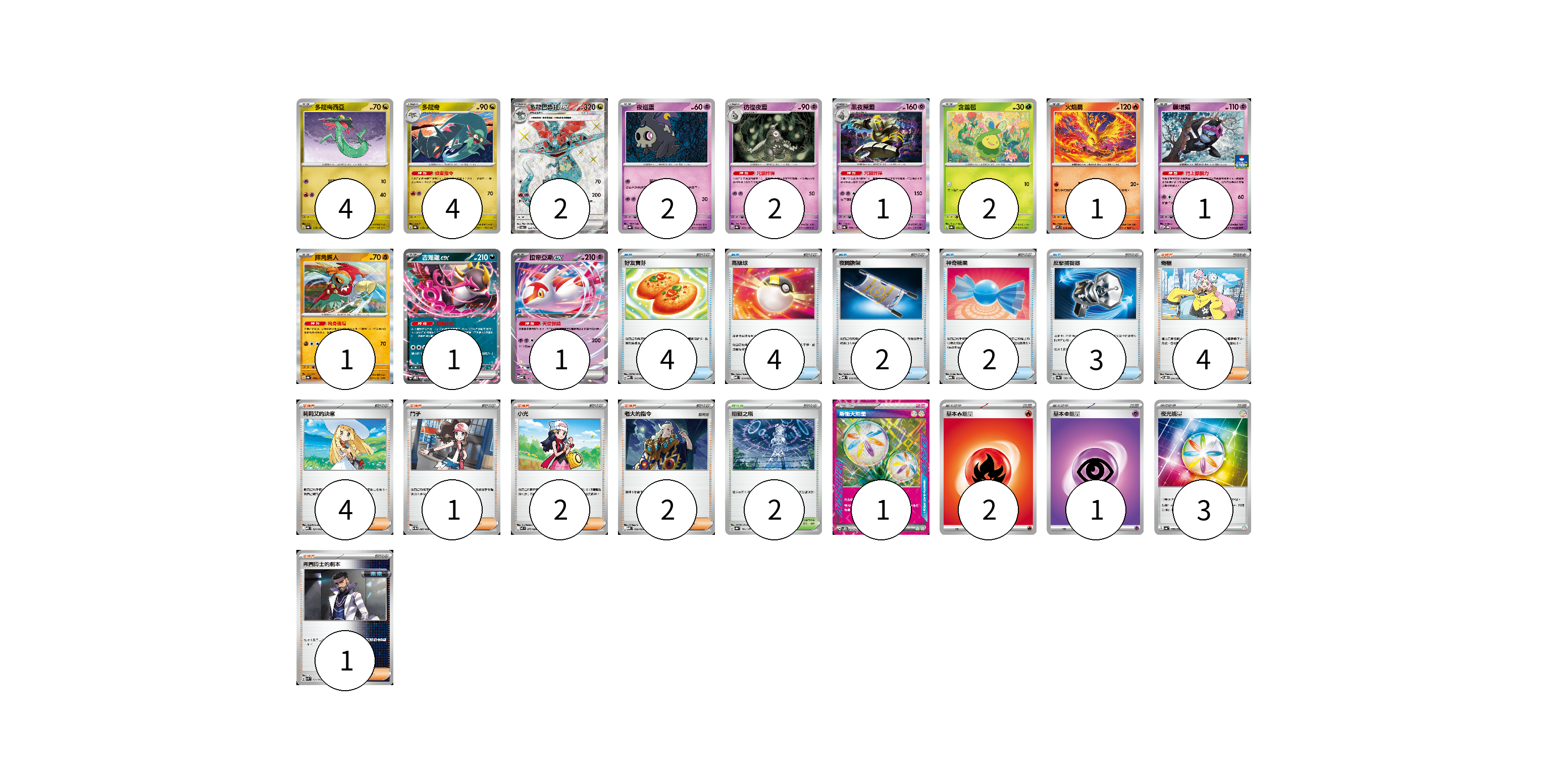 牌組構築方案 以此牌組為基礎新構築牌組 顯示卡面 顯示列表 寶可夢卡(22) 4 4 2 2 2 1 2 1 1 1 1 1 物品卡(15) 4 4 2 2 3 支援者卡(14) 4 4 1 2 2 1 競技場卡(2) 2 能量卡(7) 1 2 1 3 寶可夢卡(22) 卡牌名稱 張數 卡牌名稱 張數 多龍梅西亞 SV8a 118/187 04 多龍奇 SV8a 119/187 04 多龍巴魯托ex SV6 120/101 02 夜巡靈 SV8a 064/187 02 彷徨夜靈 SV8a 065/187 02 黑夜魔靈 SV8a 066/187 01 含羞苞 SV8a 001/187 02 火焰鳥 M2 014/080 01 願增猿 M-P 014/M-P 01 摔角鷹人 SV8a 084/187 01 吉雉雞ex SVOD 004/020 01 拉帝亞斯ex MBD 003/022 01 物品卡(15) 卡牌名稱 張數 卡牌名稱 張數 好友寶芬 MBD 013/022 04 高級球 MBD 014/022 04 夜間擔架 MBD 016/022 02 神奇糖果 MBG 013/022 02 反擊捕捉器 SV8a 139/187 03 支援者卡(14) 卡牌名稱 張數 卡牌名稱 張數 奇樹 SVOD 016/020 04 莉莉艾的決意 MBD 021/022 04 鬥子 SV11W 085/086 01 小光 M2 077/080 02 老大的指令 MBD 020/022 02 弗圖博士的劇本 SVK 034/042 01 競技場卡(2) 卡牌名稱 張數 卡牌名稱 張數 阻礙之塔 SV8a 181/187 02 能量卡(7) 卡牌名稱 張數 卡牌名稱 張數 新衝天能量 SV5K 071/071 01 基本火能量 sv-p FIR 02 基本超能量 sv-p PSY 01 夜光能量 SV4a 190/190 03 以此牌組為基礎新構築牌組 牌組編碼 nsDAJd-mxbHbs-rZGhWu copy 列印牌組單 牌組編碼已複製 分享至SNS