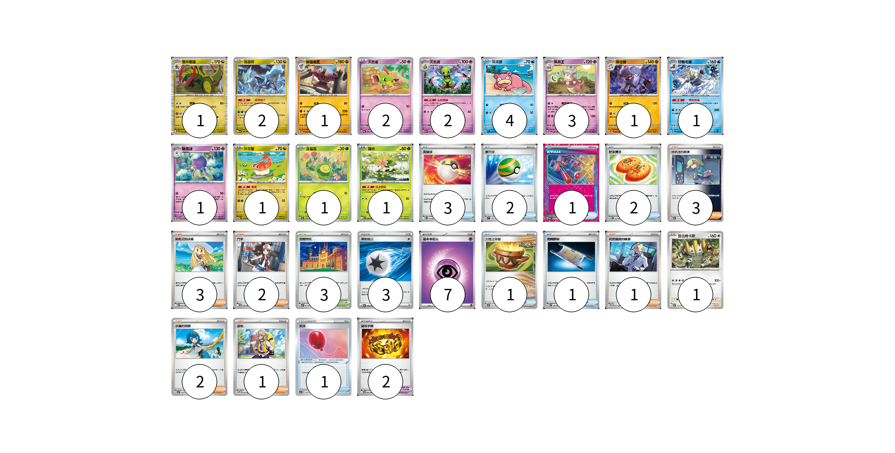牌組構築方案 以此牌組為基礎新構築牌組 顯示卡面 顯示列表 寶可夢卡(22) 1 2 1 2 2 4 3 1 1 1 1 1 1 1 寶可夢道具(3) 1 2 物品卡(10) 3 2 1 2 1 1 支援者卡(12) 3 3 2 1 2 1 競技場卡(3) 3 能量卡(10) 3 7 寶可夢卡(22) 卡牌名稱 張數 卡牌名稱 張數 雙斧戰龍 SV11B 072/086 01 酋雷姆 SV6a 047/064 02 修建老匠 SV6 061/101 01 天然雀 SV8a 060/187 02 天然鳥 SV8a 061/187 02 呆呆獸 SVM 027/175 04 呆呆王 SV7 039/102 03 棄世猴 SV8 062/106 01 好勝毛蟹 SV7 024/102 01 隨風球 SV7 041/102 01 米立龍 MBD 010/022 01 含羞苞 SV8a 001/187 01 謝米 SV9a 006/063 01 雷吉奇卡斯 SV8a 132/187 01 寶可夢道具(3) 卡牌名稱 張數 卡牌名稱 張數 氣球 SC1b 142/153 01 猛攻手鐲 SV11W 082/086 02 物品卡(10) 卡牌名稱 張數 卡牌名稱 張數 高級球 MBD 014/022 03 巢穴球 SVM 133/175 02 釣竿MAX SV8a 142/187 01 好友寶芬 MBD 013/022 02 大地之容器 SV8a 143/187 01 夜間擔架 MBD 016/022 01 支援者卡(12) 卡牌名稱 張數 卡牌名稱 張數 暗碼迷的解讀 SV8a 165/187 03 莉莉艾的決意 MBD 021/022 03 鬥子 SV11W 085/086 02 阿克羅瑪的執著 SVOM 017/021 01 水蓮的照顧 SV8a 168/187 02 派帕 SVOD 018/020 01 競技場卡(3) 卡牌名稱 張數 卡牌名稱 張數 夜間學院 SV6a 064/064 03 能量卡(10) 卡牌名稱 張數 卡牌名稱 張數 噴射能量 SV8a 185/187 03 基本【超】能量 MBD PSY 07 以此牌組為基礎新構築牌組 牌組編碼 nxKFpv-filGnT-KwDYBX copy 列印牌組單 牌組編碼已複製 分享至SNS