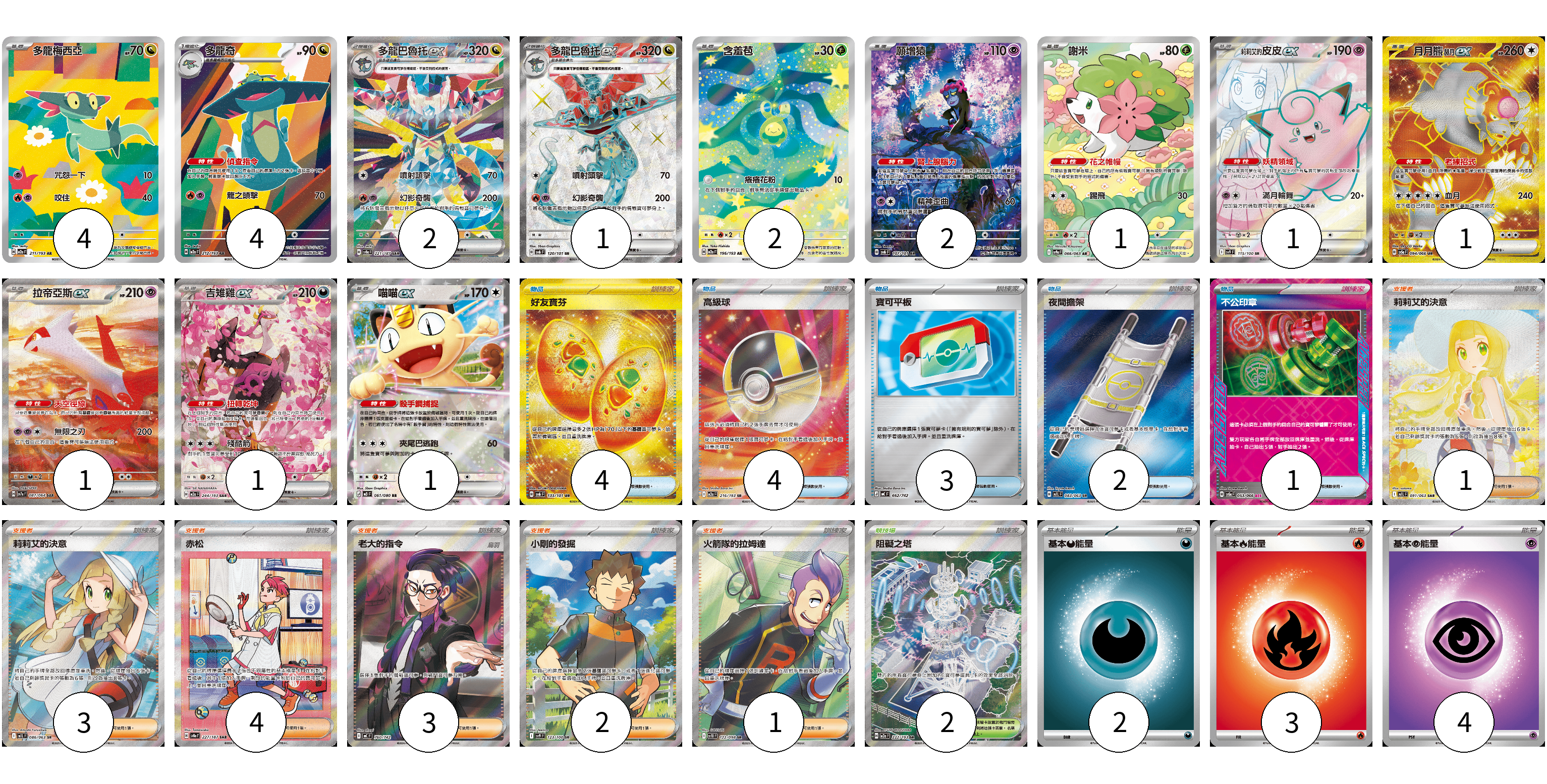 牌組構築方案 以此牌組為基礎新構築牌組 顯示卡面 顯示列表 寶可夢卡(21) 4 4 2 1 2 2 1 1 1 1 1 1 物品卡(14) 4 4 3 2 1 支援者卡(14) 1 3 4 3 2 1 競技場卡(2) 2 能量卡(9) 2 3 4 寶可夢卡(21) 卡牌名稱 張數 卡牌名稱 張數 多龍梅西亞 M2a 211/193 04 多龍奇 M2a 212/193 04 多龍巴魯托ex SV8a 221/187 02 多龍巴魯托ex SV6 120/101 01 含羞苞 M2a 196/193 02 願增猿 SV6 107/101 02 謝米 SV9a 066/063 01 莉莉艾的皮皮ex SV9 115/100 01 月月熊 赫月 ex SV5a 094/066 01 拉帝亞斯ex SV7a 087/064 01 吉雉雞ex M2a 244/193 01 喵喵ex M3 061/080 01 物品卡(14) 卡牌名稱 張數 卡牌名稱 張數 好友寶芬 SV6 133/101 04 高級球 M2a 216/193 04 寶可平板 MC 662/742 03 夜間擔架 M1L 083/063 02 不公印章 SV5a 053/066 01 支援者卡(14) 卡牌名稱 張數 卡牌名稱 張數 莉莉艾的決意 M1L 091/063 01 莉莉艾的決意 M1L 086/063 03 赤松 SV8a 227/187 04 老大的指令(烏羽) MC 760/742 03 小剛的發掘 SV9 123/100 02 火箭隊的拉姆達 SV10 122/098 01 競技場卡(2) 卡牌名稱 張數 卡牌名稱 張數 阻礙之塔 M2a 222/193 02 能量卡(9) 卡牌名稱 張數 卡牌名稱 張數 基本【惡】能量 MC DAR 02 基本【火】能量 MC FIR 03 基本【超】能量 MC PSY 04 以此牌組為基礎新構築牌組 牌組編碼 oATTKd-oJxNhZ-ZMoqwG copy 列印牌組單 牌組編碼已複製 分享至SNS