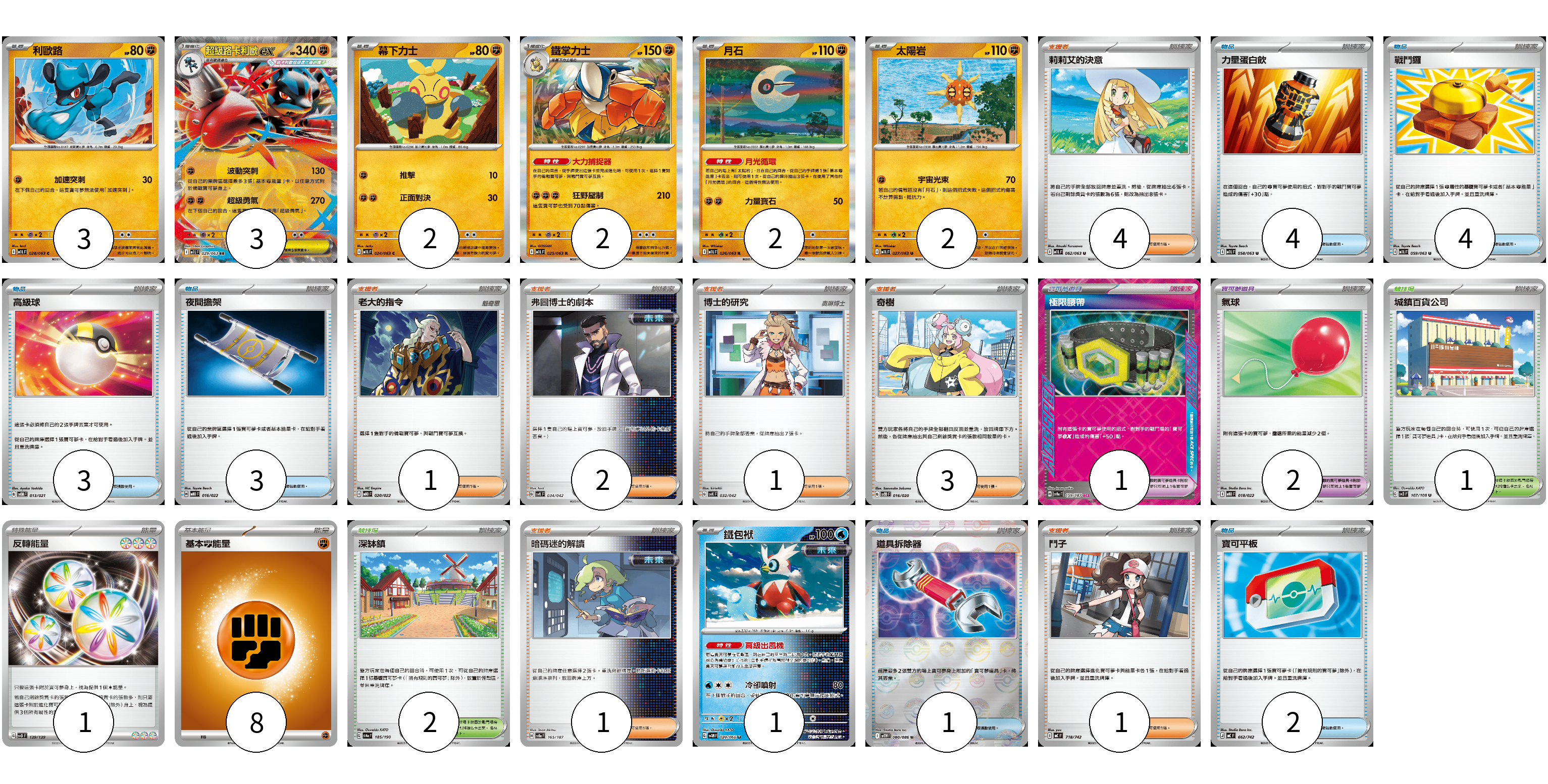 牌組構築方案 以此牌組為基礎新構築牌組 顯示卡面 顯示列表 寶可夢卡(15) 3 3 2 2 2 2 1 寶可夢道具(3) 1 2 物品卡(17) 4 4 3 3 1 2 支援者卡(13) 4 1 2 1 3 1 1 競技場卡(3) 1 2 能量卡(9) 1 8 寶可夢卡(15) 卡牌名稱 張數 卡牌名稱 張數 利歐路 M1L 028/063 03 超級路卡利歐ex M1L 029/063 03 幕下力士 M1L 024/063 02 鐵掌力士 M1L 025/063 02 月石 M1L 026/063 02 太陽岩 M1L 027/063 02 鐵包袱 SV4M 020/066 01 寶可夢道具(3) 卡牌名稱 張數 卡牌名稱 張數 極限腰帶 SV8a 159/187 01 氣球 MBD 018/022 02 物品卡(17) 卡牌名稱 張數 卡牌名稱 張數 力量蛋白飲 M1L 058/063 04 戰鬥鑼 M1L 059/063 04 高級球 SVOM 013/021 03 夜間擔架 MBD 016/022 03 道具拆除器 SV11W 080/086 01 寶可平板 MC 662/742 02 支援者卡(13) 卡牌名稱 張數 卡牌名稱 張數 莉莉艾的決意 M1L 062/063 04 老大的指令 MBD 020/022 01 弗圖博士的劇本 SVK 034/042 02 博士的研究 SVK 032/042 01 奇樹 SVOD 016/020 03 暗碼迷的解讀 SV8a 165/187 01 鬥子 MC 718/742 01 競技場卡(3) 卡牌名稱 張數 卡牌名稱 張數 城鎮百貨公司 SV3 107/108 01 深缽鎮 SV4a 185/190 02 能量卡(9) 卡牌名稱 張數 卡牌名稱 張數 反轉能量 SVD 139/139 01 基本【鬥】能量 M-P FIG 08 以此牌組為基礎新構築牌組 牌組編碼 oApIsq-vIPQus-JymBwa copy 列印牌組單 牌組編碼已複製 分享至SNS