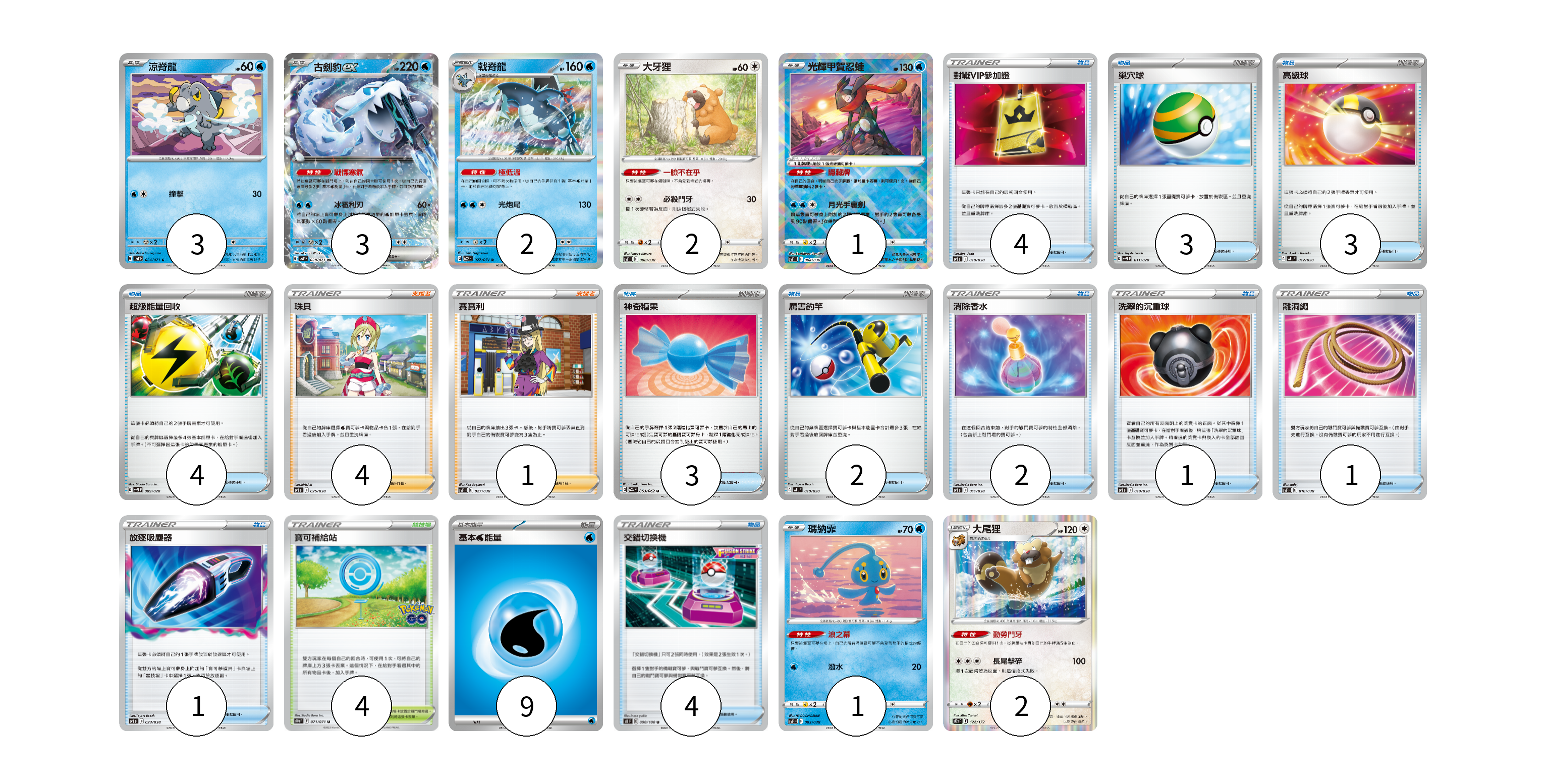 牌組構築方案 以此牌組為基礎新構築牌組 顯示卡面 顯示列表 寶可夢卡(16) 3 3 2 2 1 2 1 2 物品卡(26) 4 3 3 4 3 2 1 1 1 4 支援者卡(5) 4 1 競技場卡(4) 4 能量卡(9) 9 寶可夢卡(16) 卡牌名稱 張數 卡牌名稱 張數 涼脊龍 SV2P 024/071 03 古劍豹ex SV2P 028/071 03 戟脊龍 SV2P 027/071 02 大牙狸 SVF 008/038 02 光輝甲賀忍蛙 SVF 004/038 01 厲害釣竿 SVEL 010/020 02 瑪納霏 SVF 003/038 01 大尾狸 S12a 122/172 02 物品卡(26) 卡牌名稱 張數 卡牌名稱 張數 對戰VIP參加證 SVF 018/038 04 巢穴球 SVEL 011/020 03 高級球 SVEL 012/020 03 超級能量回收 SVEL 009/020 04 神奇糖果 SV3a 053/062 03 消除香水 SVF 011/038 02 洗翠的沉重球 SVF 019/038 01 離洞繩 SVF 010/038 01 放逐吸塵器 SVF 023/038 01 交錯切換機 S8 090/100 04 支援者卡(5) 卡牌名稱 張數 卡牌名稱 張數 珠貝 SVF 025/038 04 賽寶利 SVF 027/038 01 競技場卡(4) 卡牌名稱 張數 卡牌名稱 張數 寶可補給站 S10b 071/071 04 能量卡(9) 卡牌名稱 張數 卡牌名稱 張數 基本【水】能量 SVF WAT 09 以此牌組為基礎新構築牌組 牌組編碼 oAtwWB-BLIVjr-XEkJay copy 列印牌組單 牌組編碼已複製 分享至SNS
